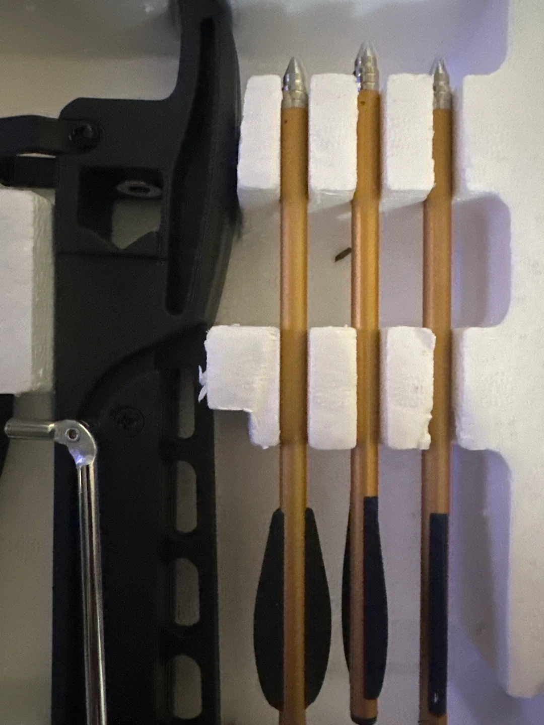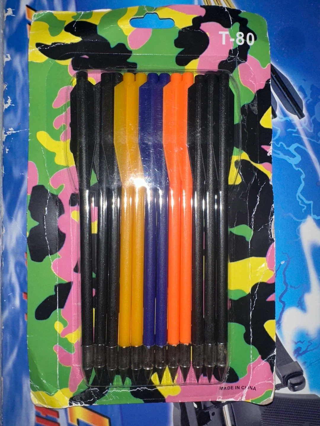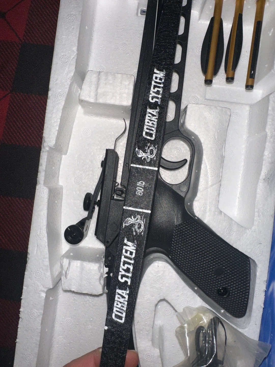Self-cocking pistol crossbow with a durable black plastic construction. Includes a set of arrows and other accessories in the original box. This is a great item for target practice! 🚨extra 12 pack of darts included ‼️