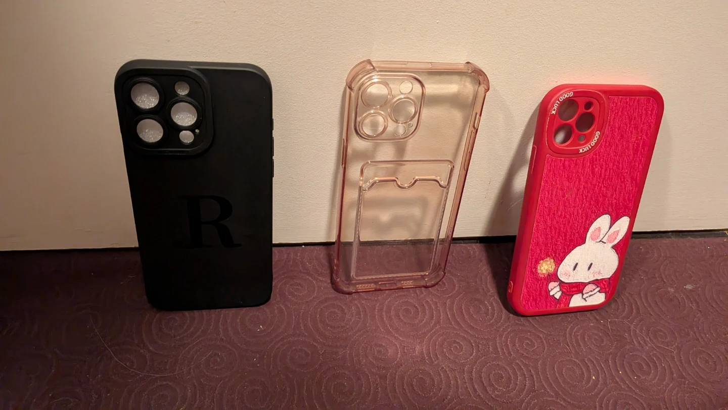 Three phone cases for iPhone 13 Pro Max. Includes a black case with an 'R' monogram and glitter camera accents, a clear case with a card holder, and a red case with a bunny design. Offers different styles for your phone protection.