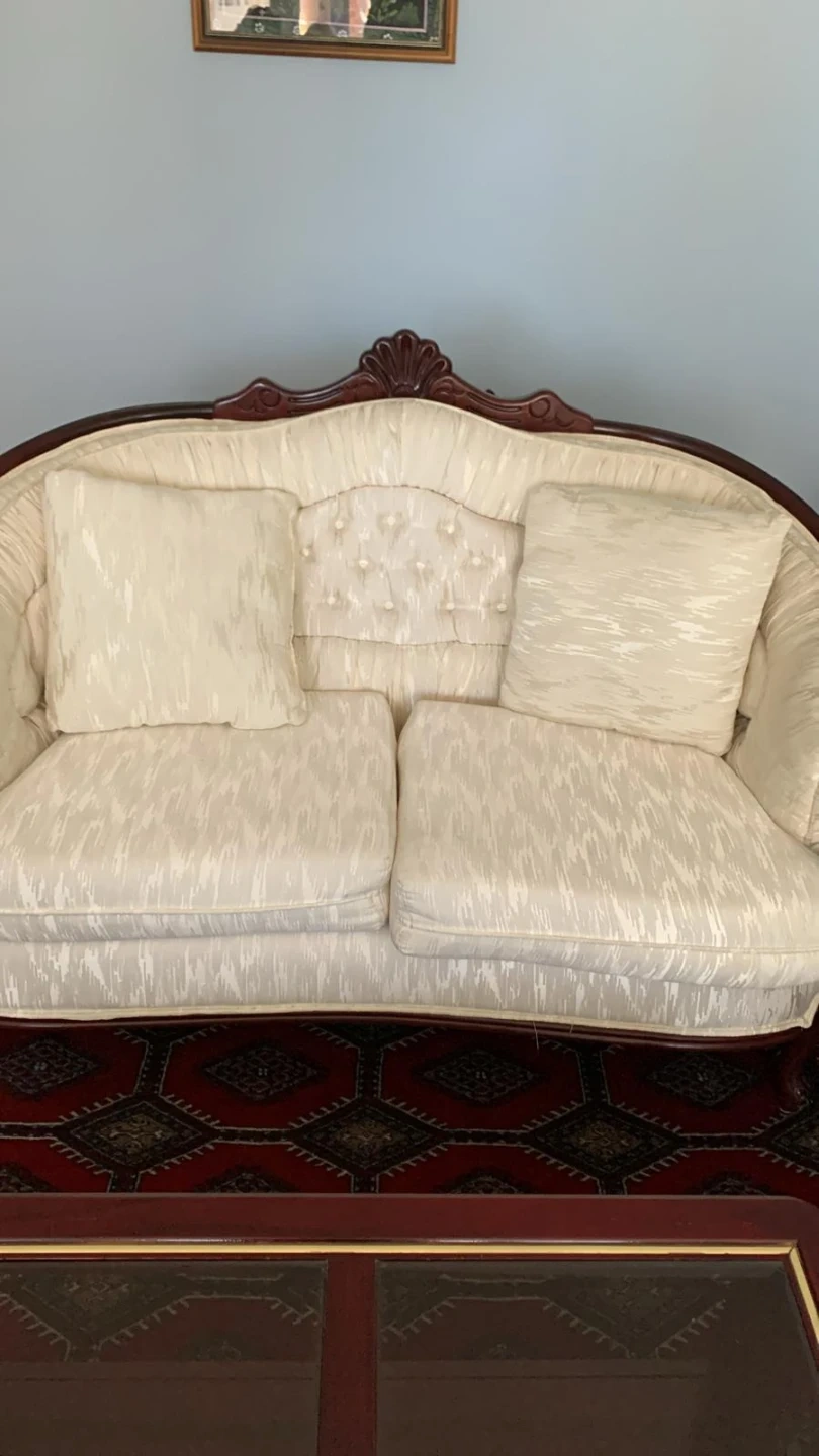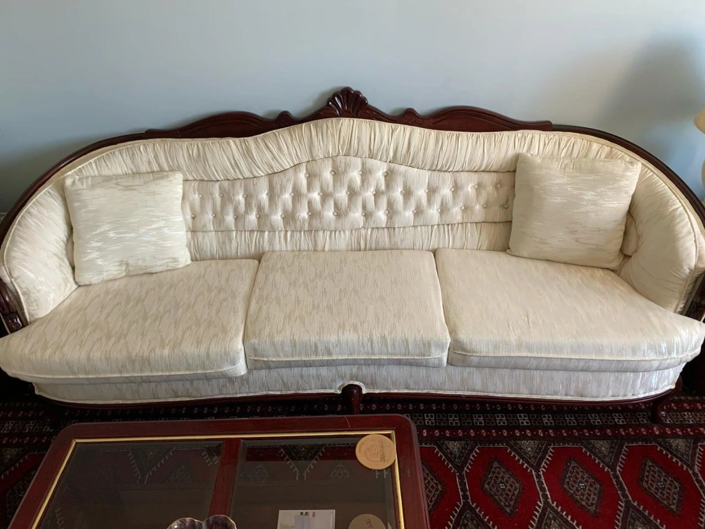 Elegant vintage sofa and matching armchair upholstered in cream fabric with a subtle pattern. All 3 pieces feature tufted backrests and ornate carved wood frames. They're finished with decorative throw pillows and fringe detailing along the bottom.