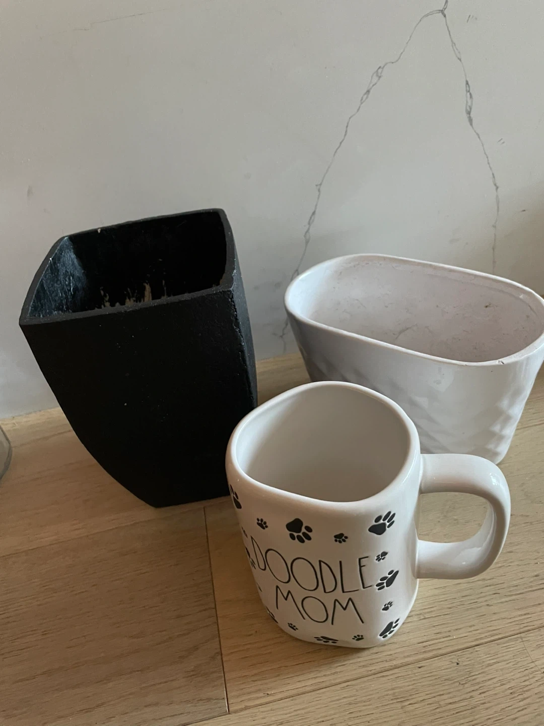 White ceramic mug with 'Doodle Mom' text and paw prints. Includes a black geometric planter and a textured white planter. Great for coffee lovers or plant enthusiasts!