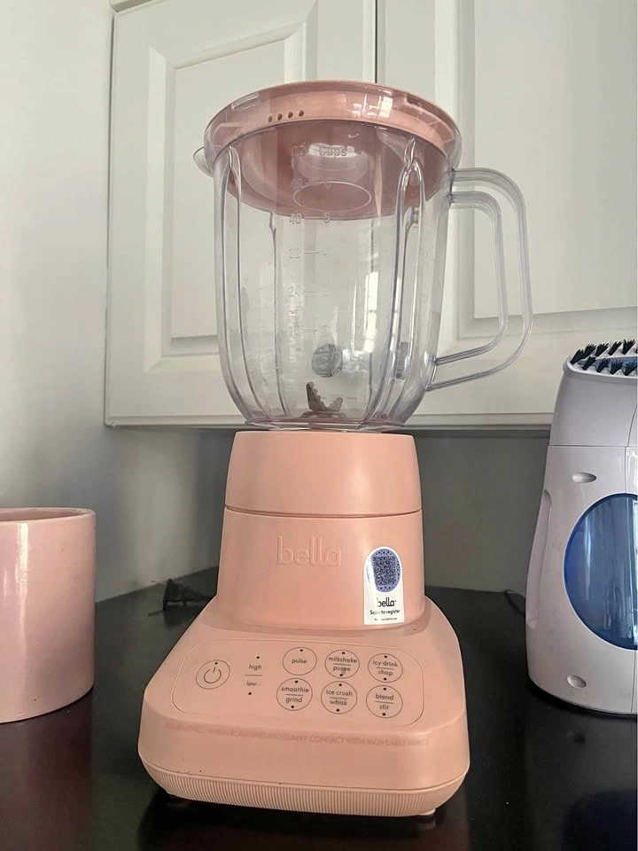 Clean pink Bella blender. Hardly used, only once or twice. Works great. Has multiple settings like smoothie, milkshake, ice crush, pulse, high, low, blend. Pitcher holds up to 48 oz or 6 cups.