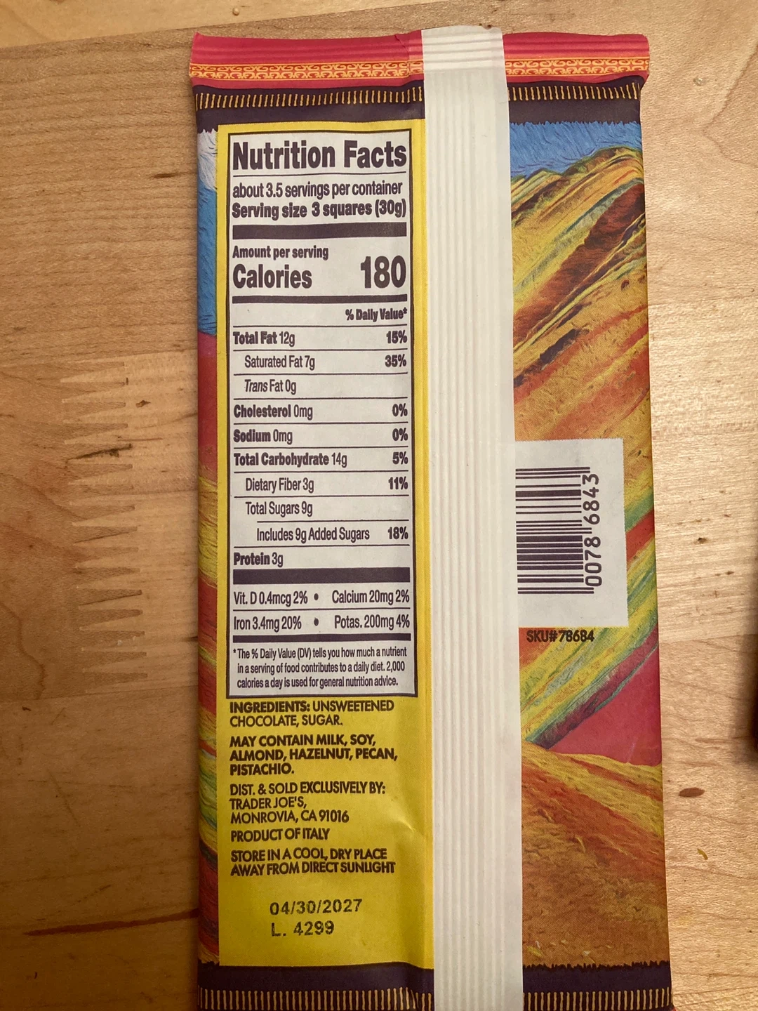 Trader Joe's 70% Peruvian Cacao dark chocolate bar. It's 100g and was produced in Italy.