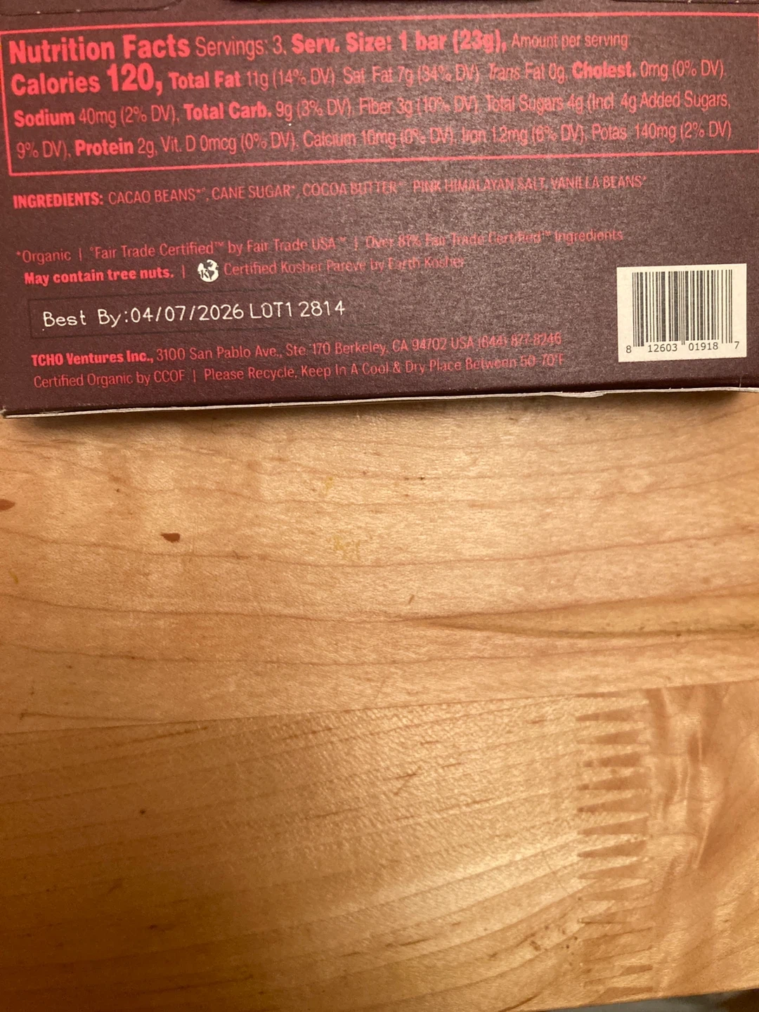And 2 TCHO Dark & Salty Organic chocolate bars, each 0.83 oz. They're a beautiful dark chocolate blend with pink Himalayan salt. The bars are 81% cacao and 100% plant-based.