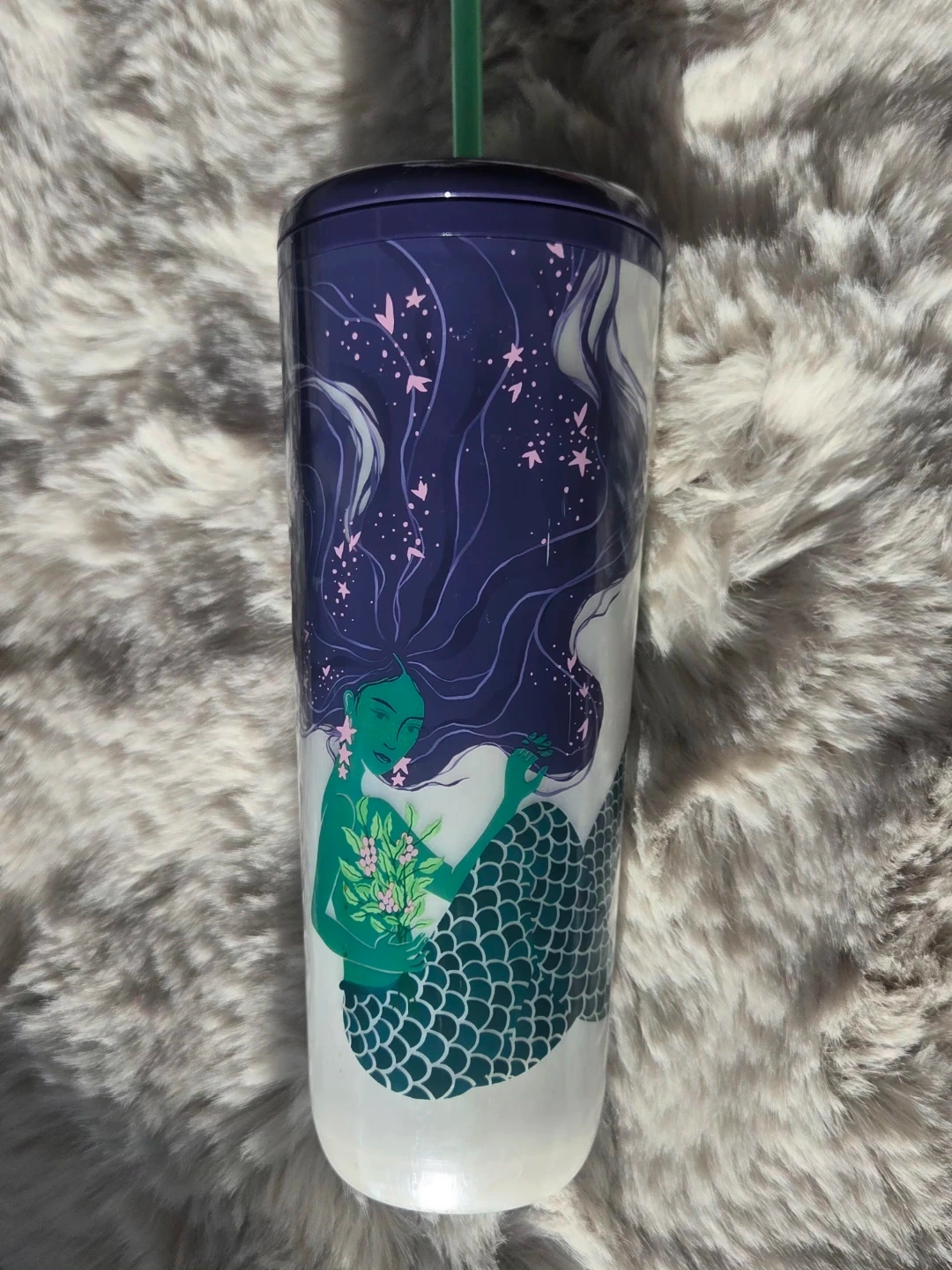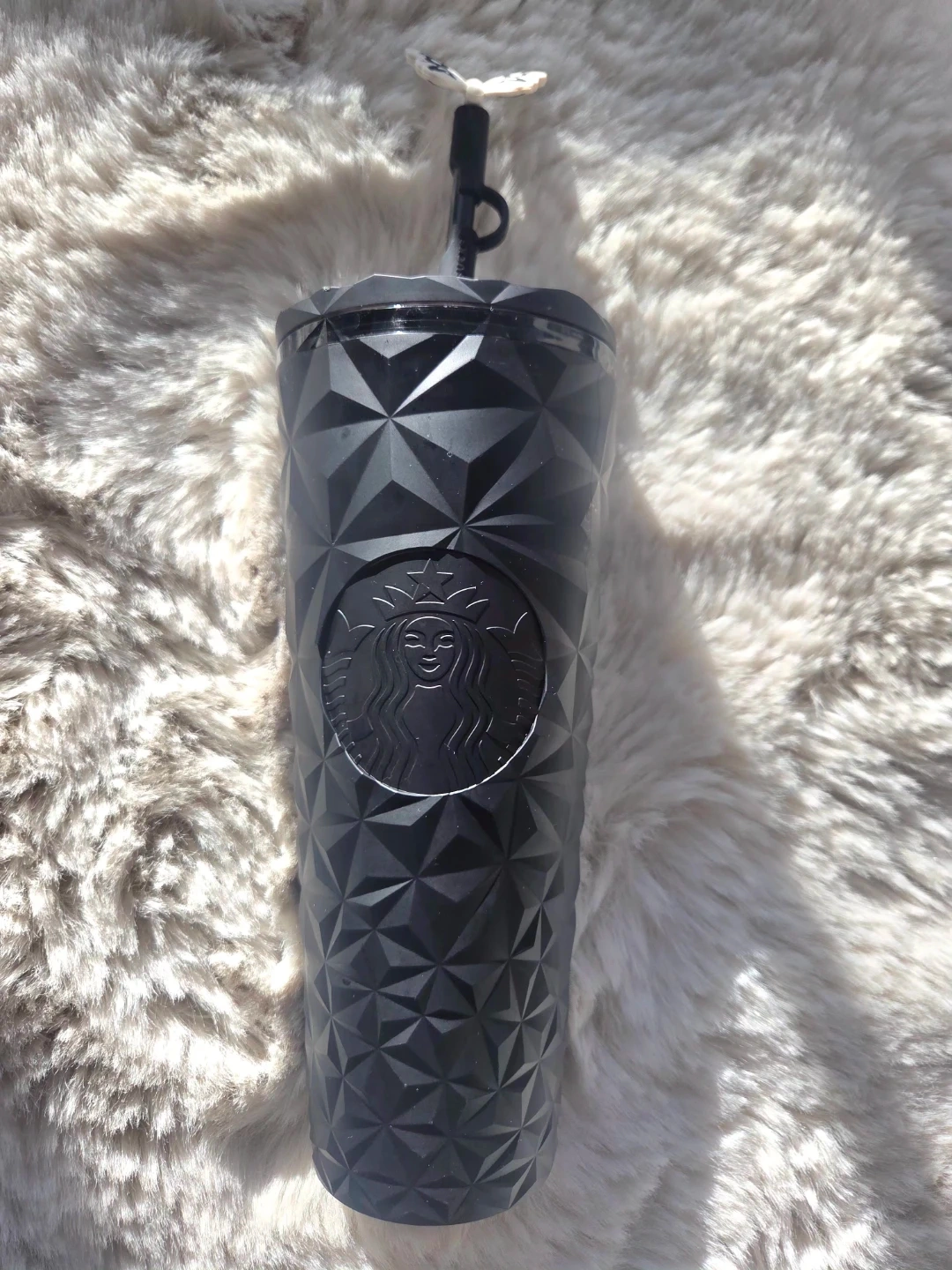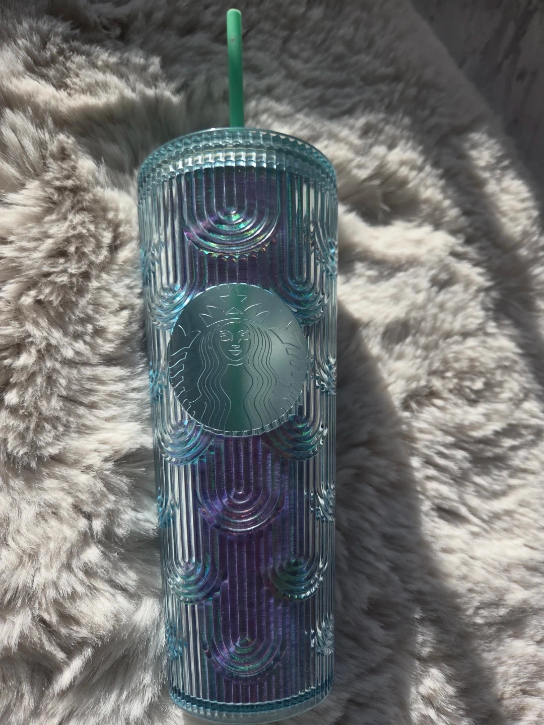 Collection of Starbucks tumblers with straws. Features include textured, iridescent, floral, and tortoiseshell designs. Reusable drinkware for your daily beverages!