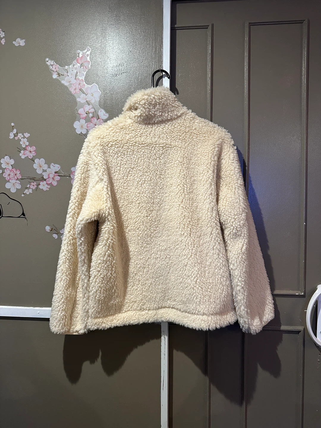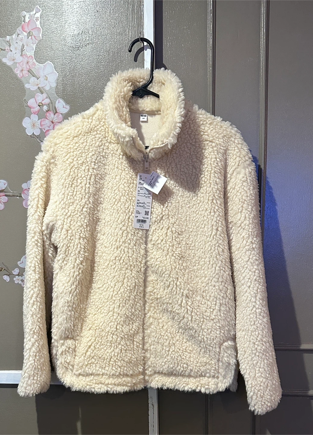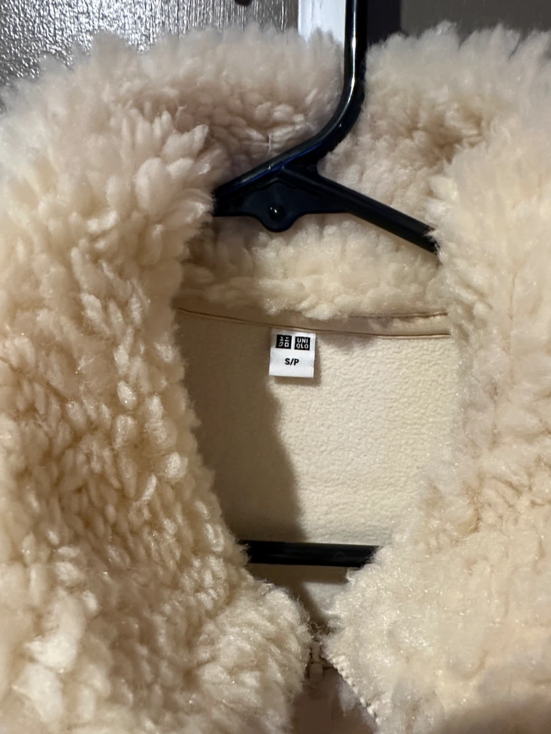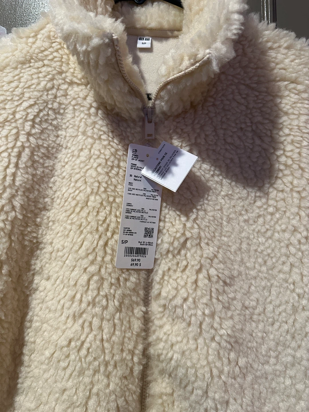 This Uniqlo fleece jacket is made from polyester. It's a size S/P and comes in a natural colour. It has a zip-up front and a cosy fleece material.