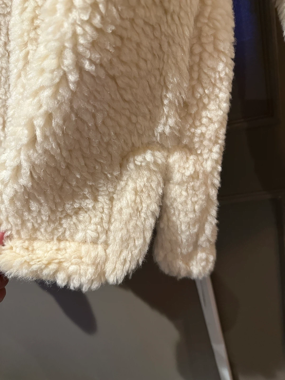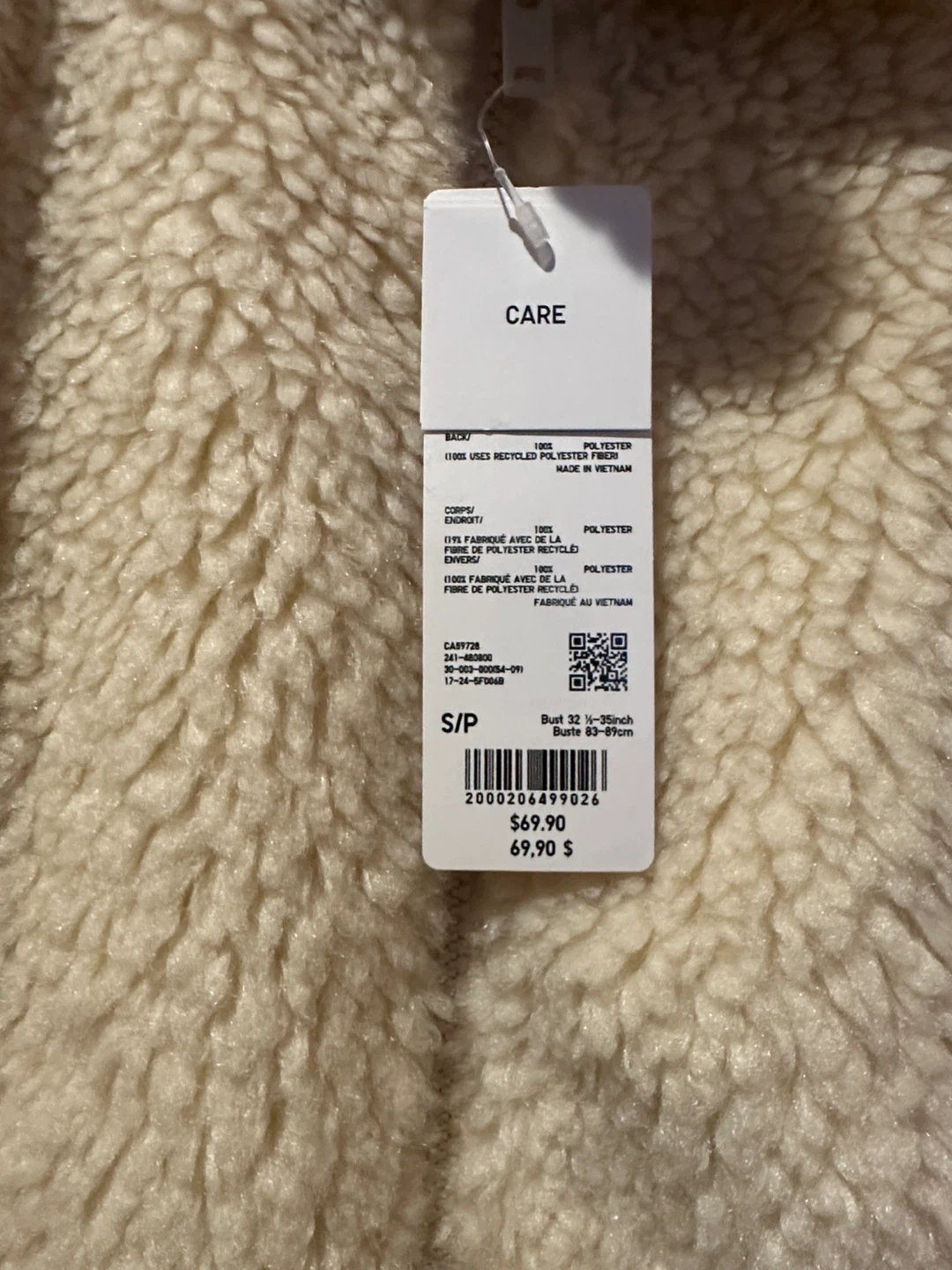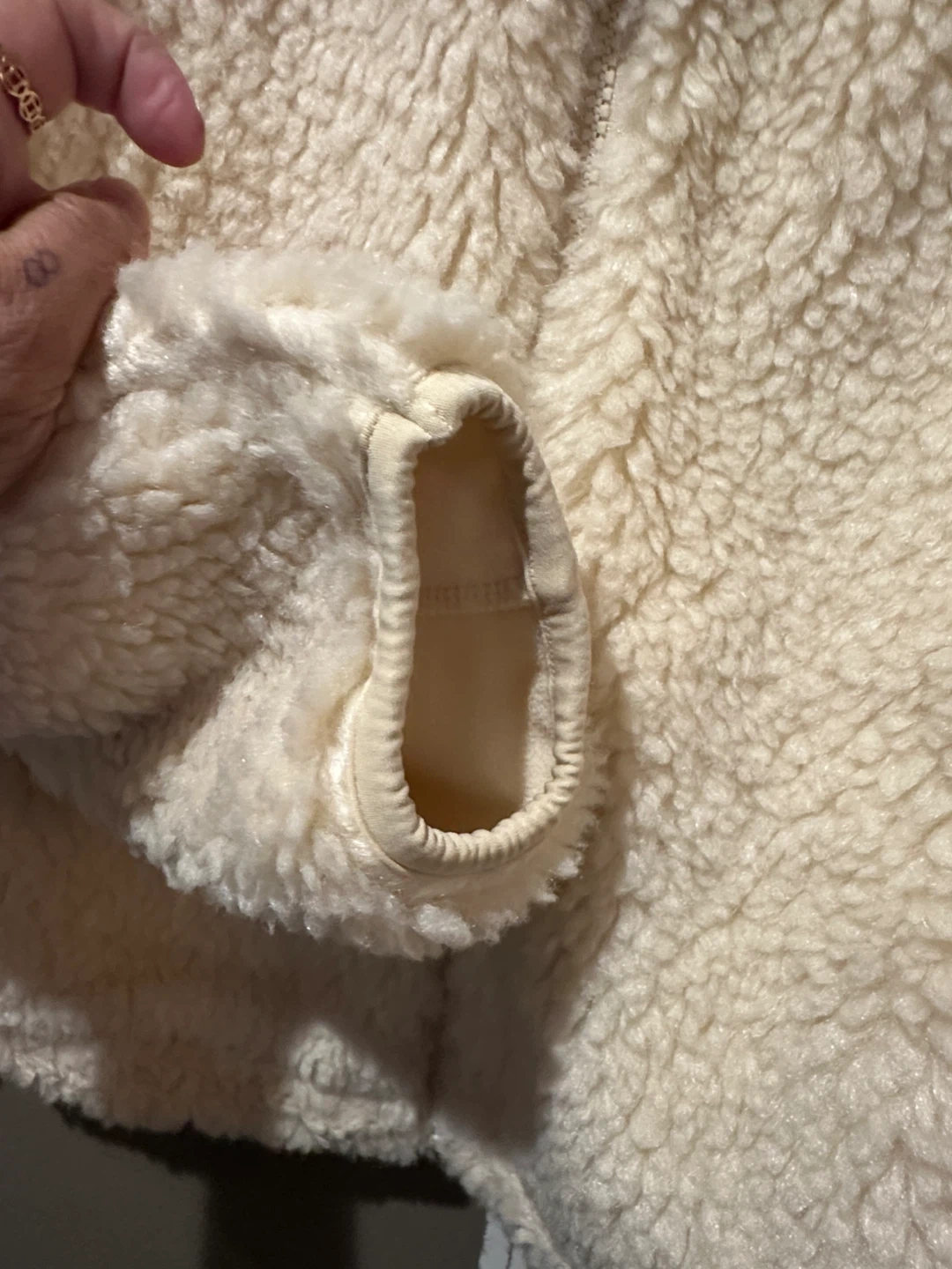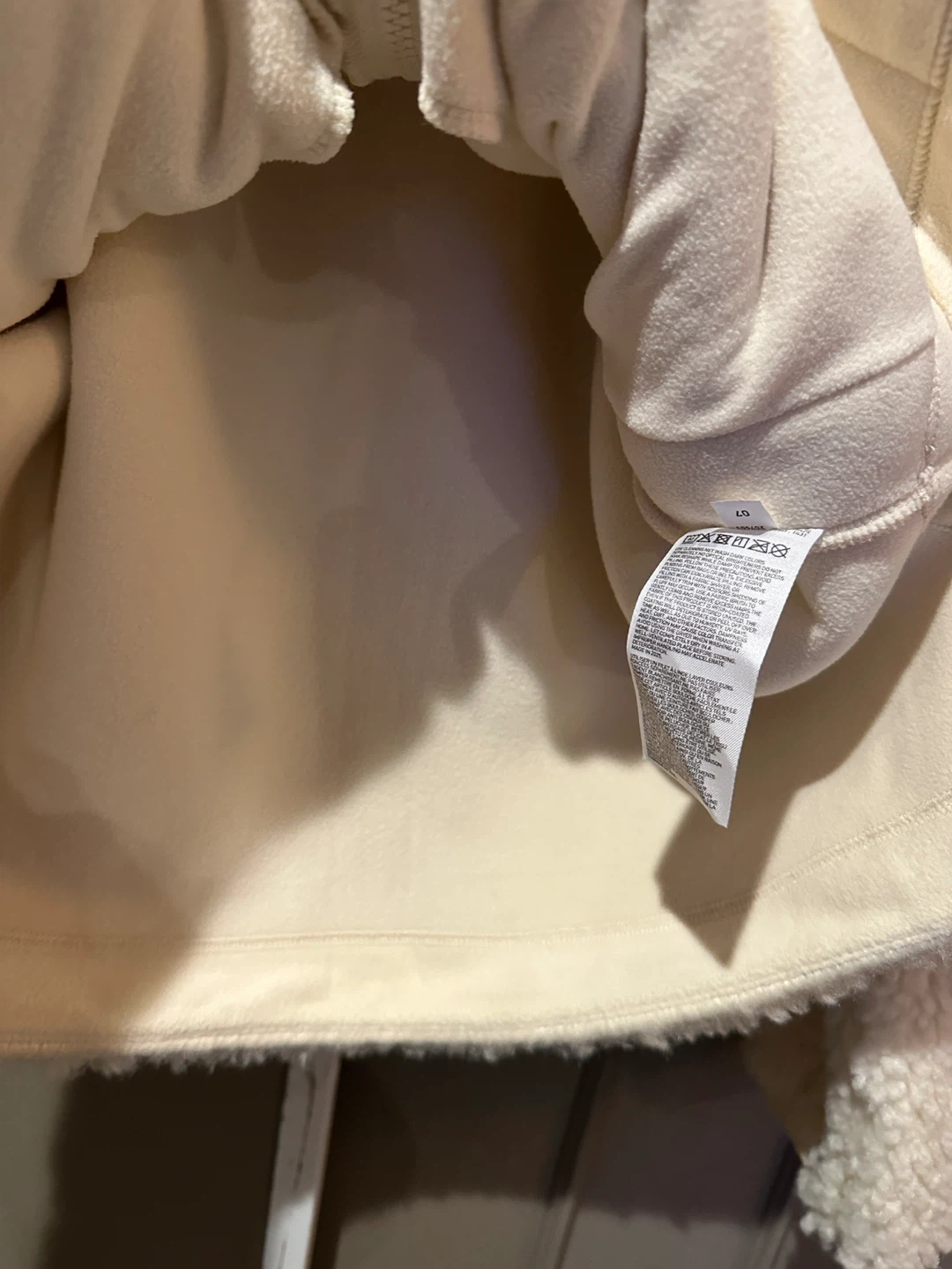 This Uniqlo fleece jacket is made from polyester. It's a size S/P and comes in a natural colour. It has a zip-up front and a cosy fleece material.