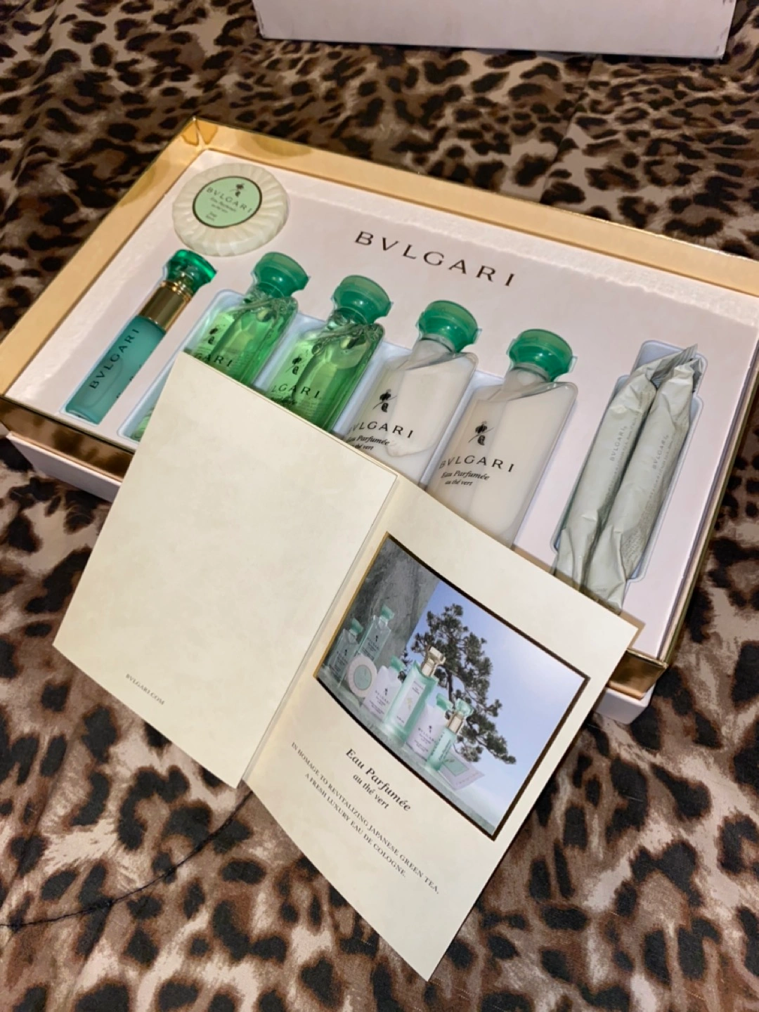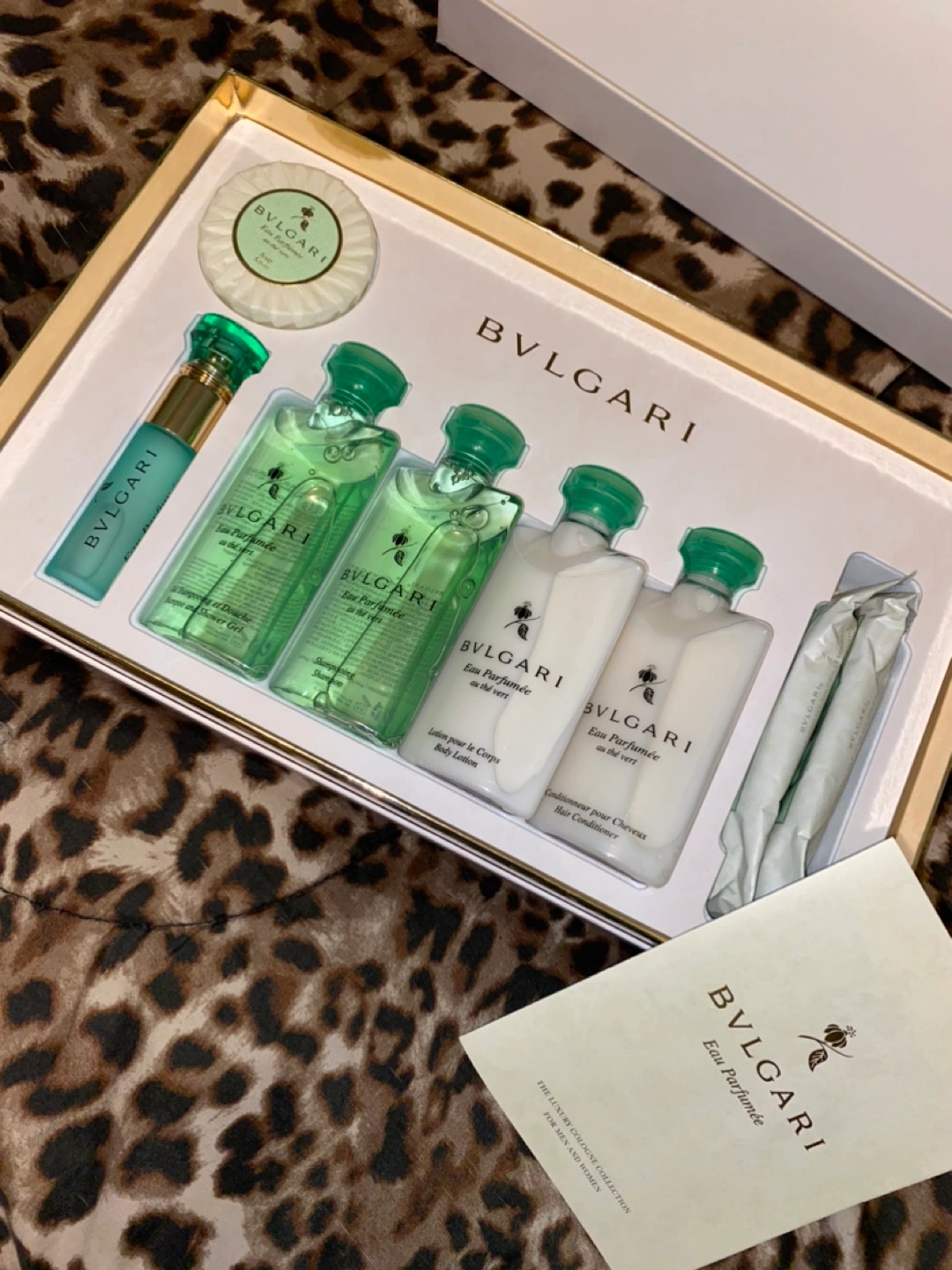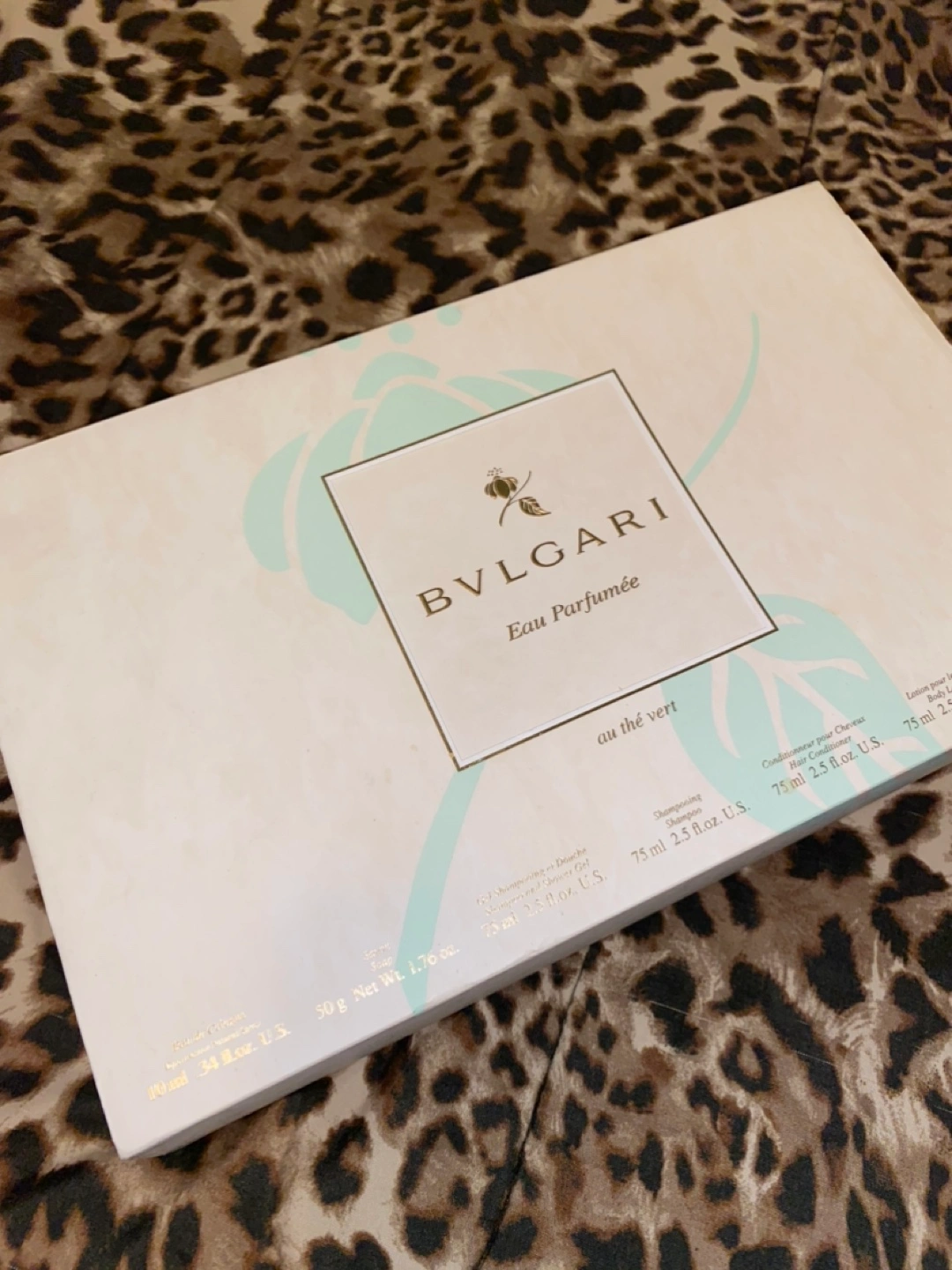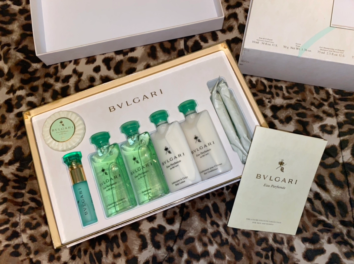 Bulgari Gift Set. New in Box. Fragrance is au the vert (in homage to revitalizing Japanese green tea). A fresh luxury eau de cologne appropriate for men and women. Box includes Cologne, Soap, Gel Shampoo and Shower Gel, Shampoo, Conditioner, Body Lotion, and Two Refreshing Towels. See close-up box photo for specific oz. sizes of each product.