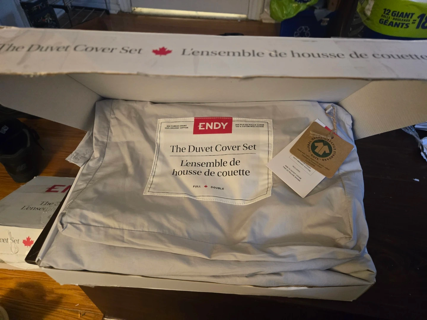 Selling a open new Endy The Duvet Cover Set in Full/Double size and the colour Fog Grey! It's still in its original box. This set is made with 100% organic cotton, ensuring a soft and comfortable sleep. Perfect for adding a touch of elegance to your bedroom!