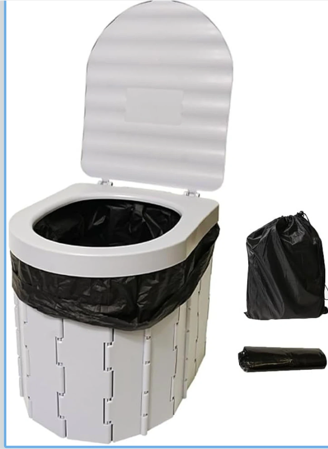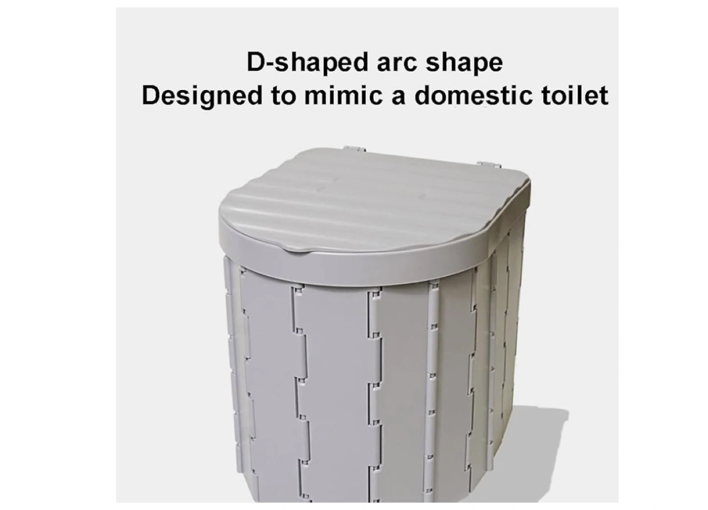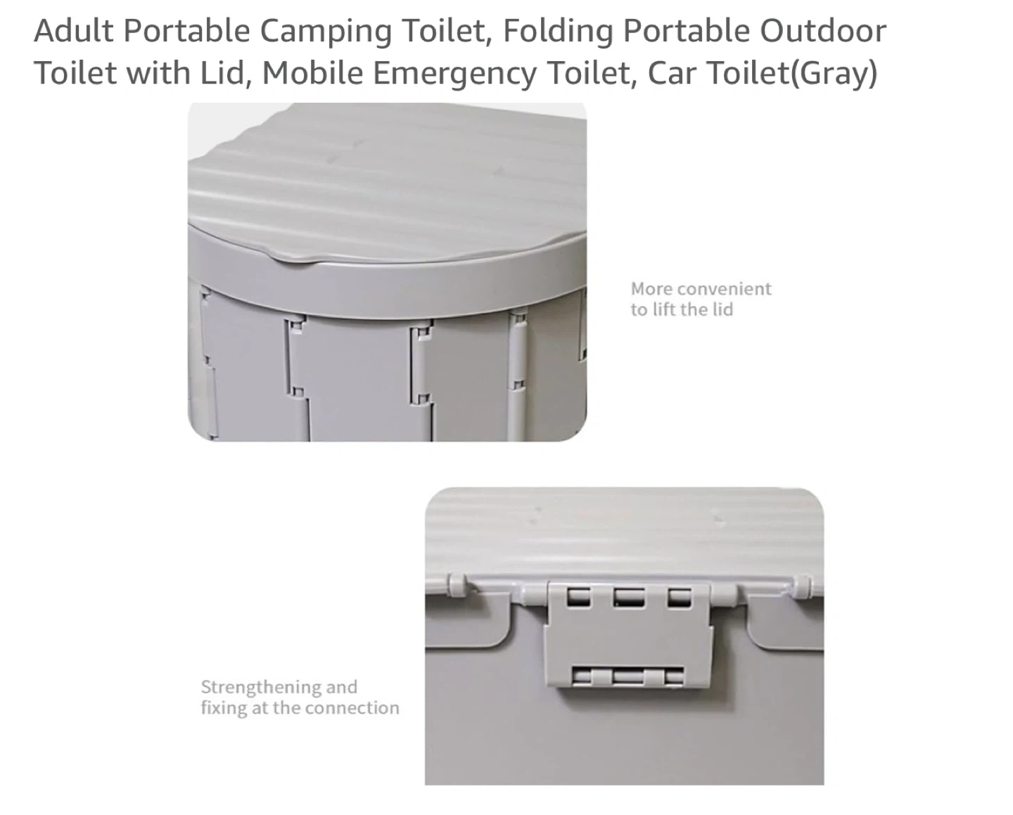 Selling a portable camping toilet by FJZD. It's a folding, outdoor toilet with a lid, perfect for emergencies or car trips. The colour is gray, and it's designed to mimic a domestic toilet with a D-shaped arc shape. Dimensions are approximately 28cm x 33cm x 30cm.