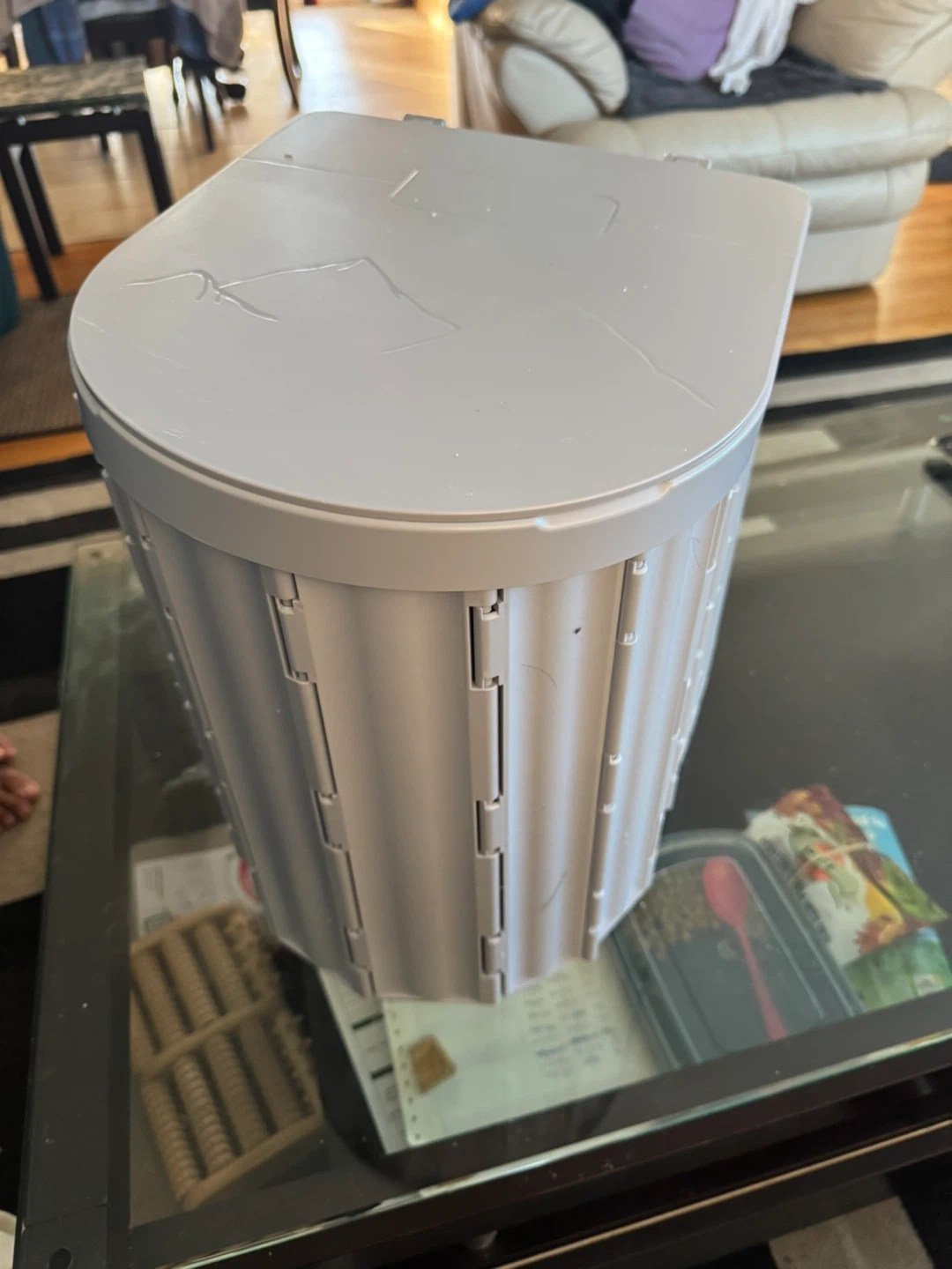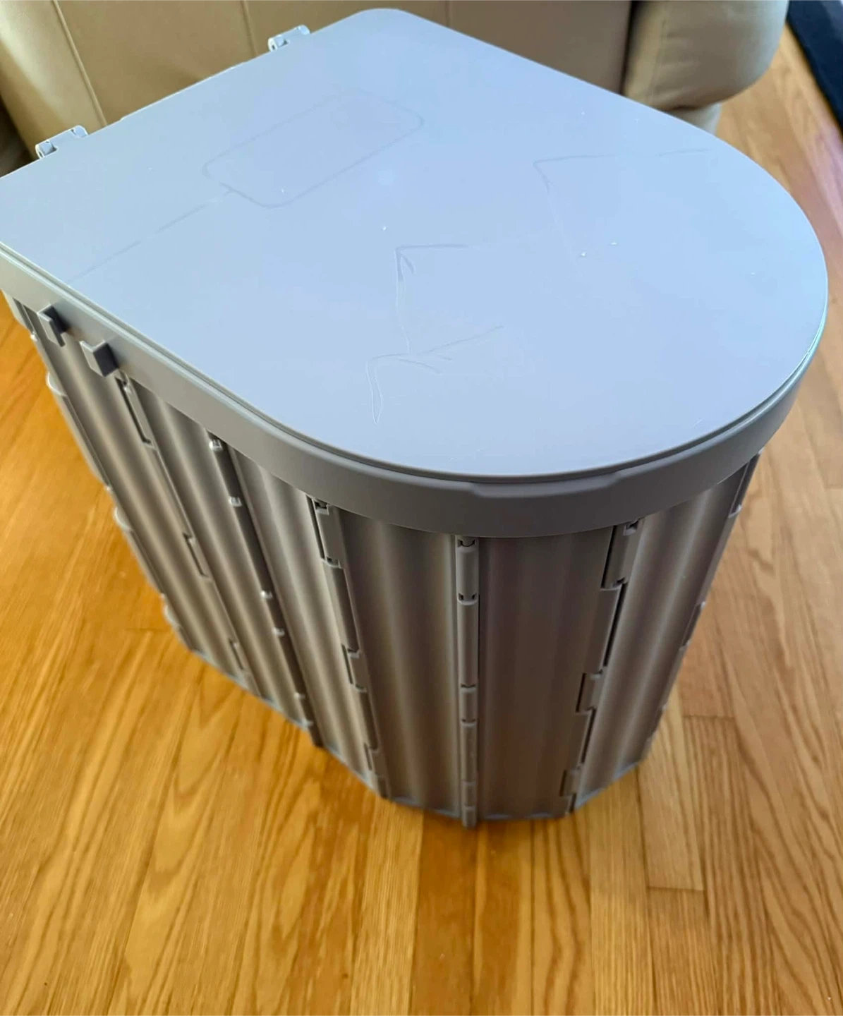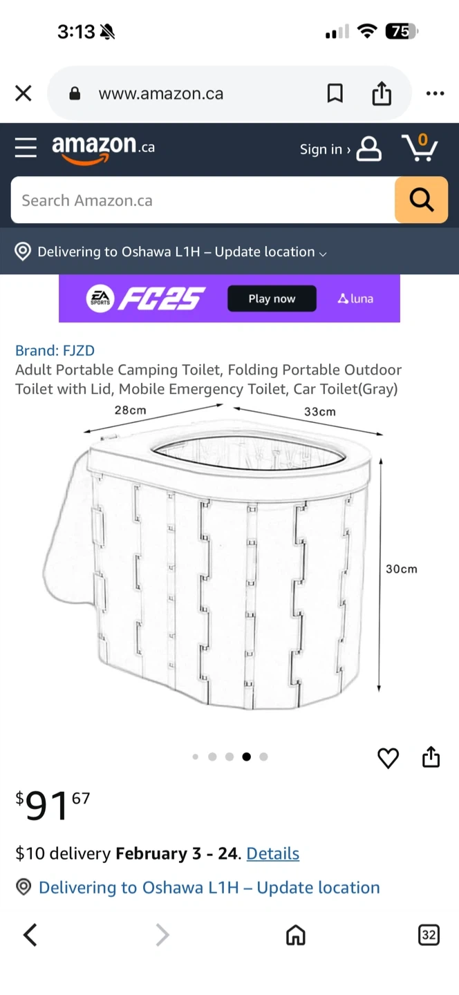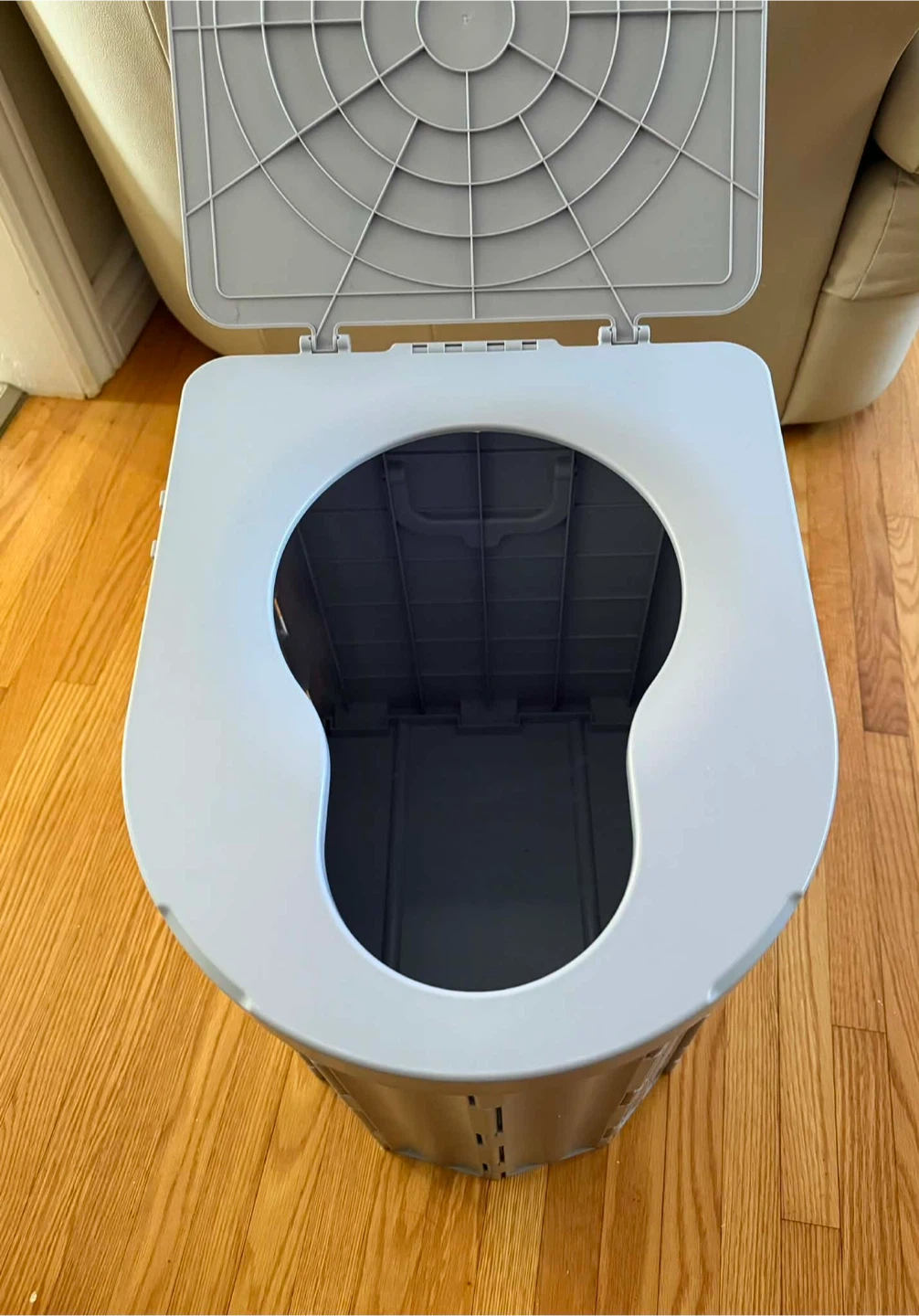 Selling a portable camping toilet by FJZD. It's a folding, outdoor toilet with a lid, perfect for emergencies or car trips. The colour is gray, and it's designed to mimic a domestic toilet with a D-shaped arc shape. Dimensions are approximately 28cm x 33cm x 30cm.