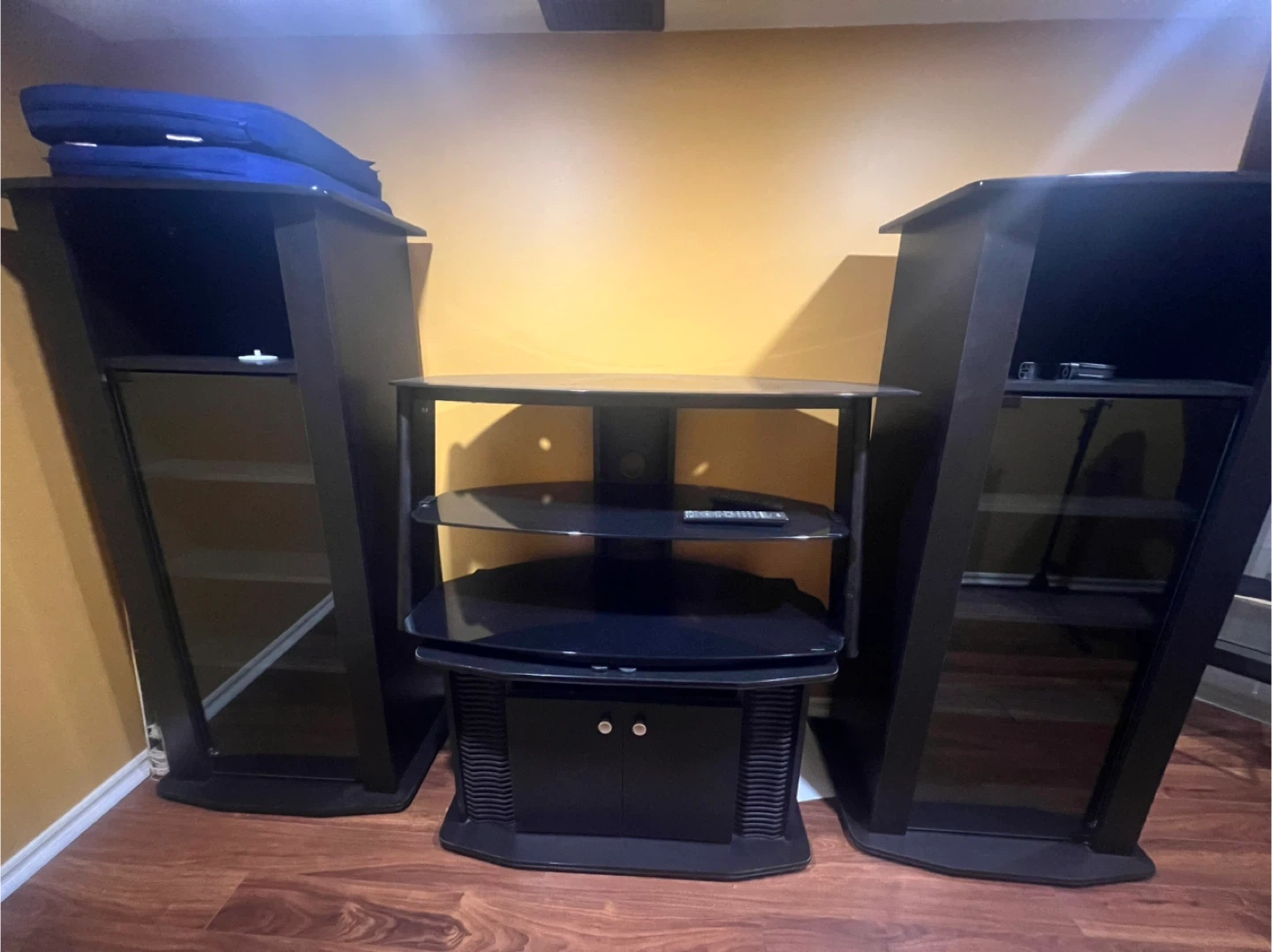 Selling a black entertainment center with two matching side towers! Perfect for organizing your media and displaying your favourite items in your living room or entertainment space. There is a separate tv stand with sleek design with glass shelves and enclosed storage. In one picture there is 2.