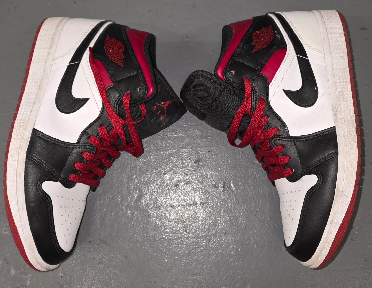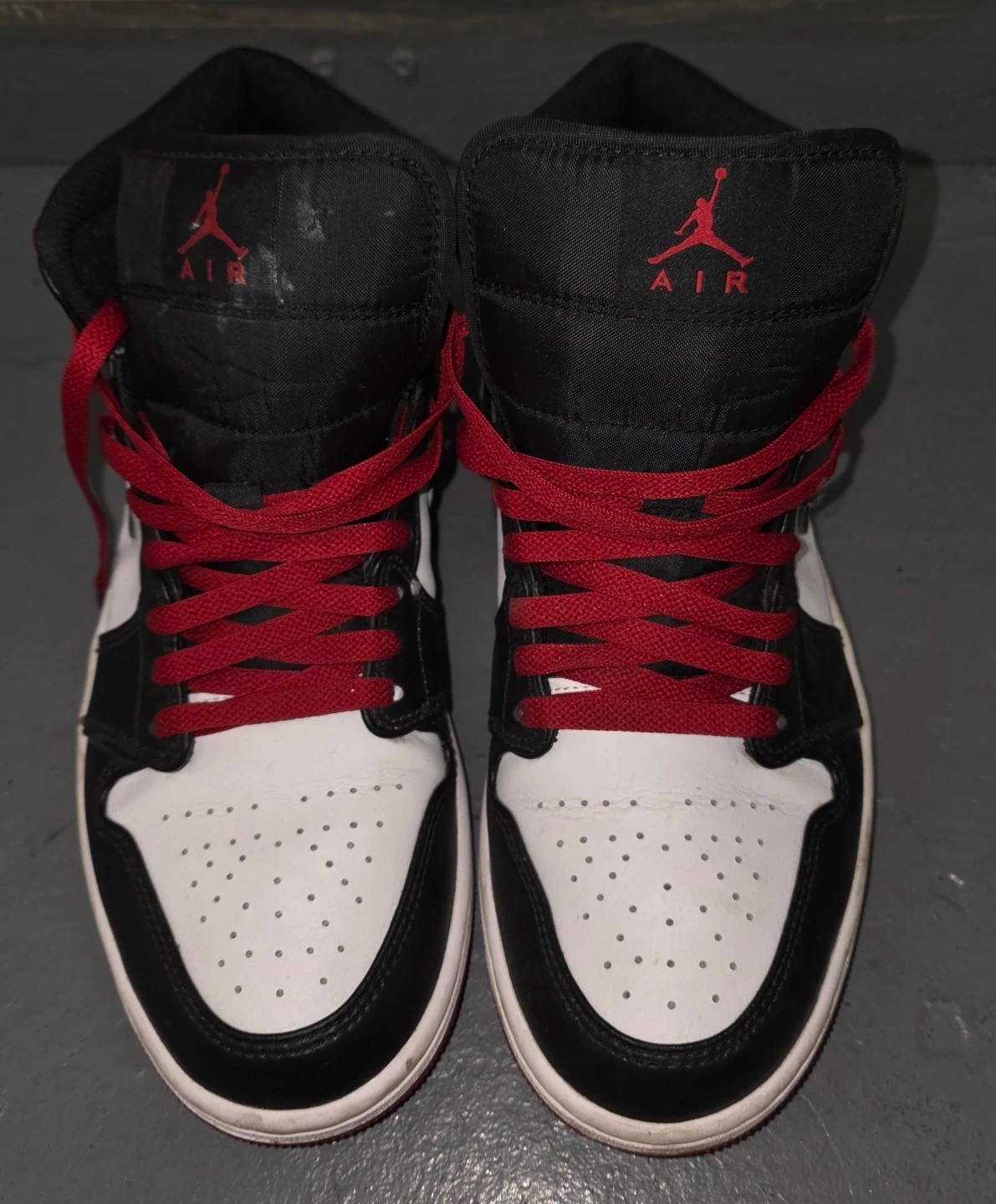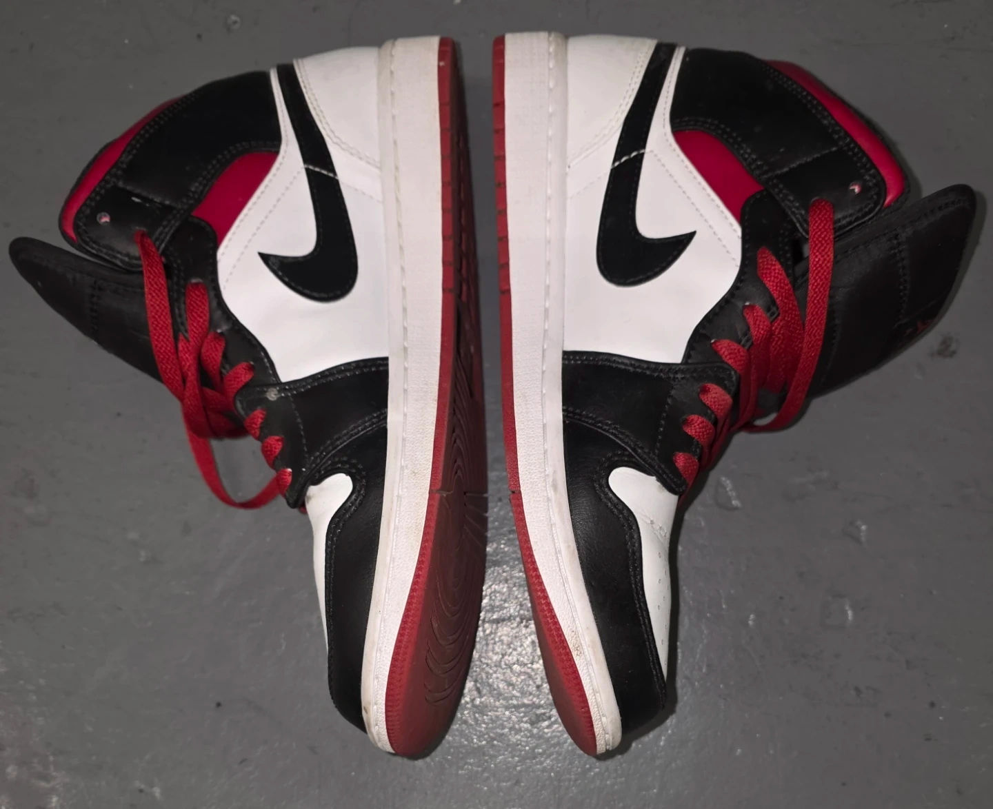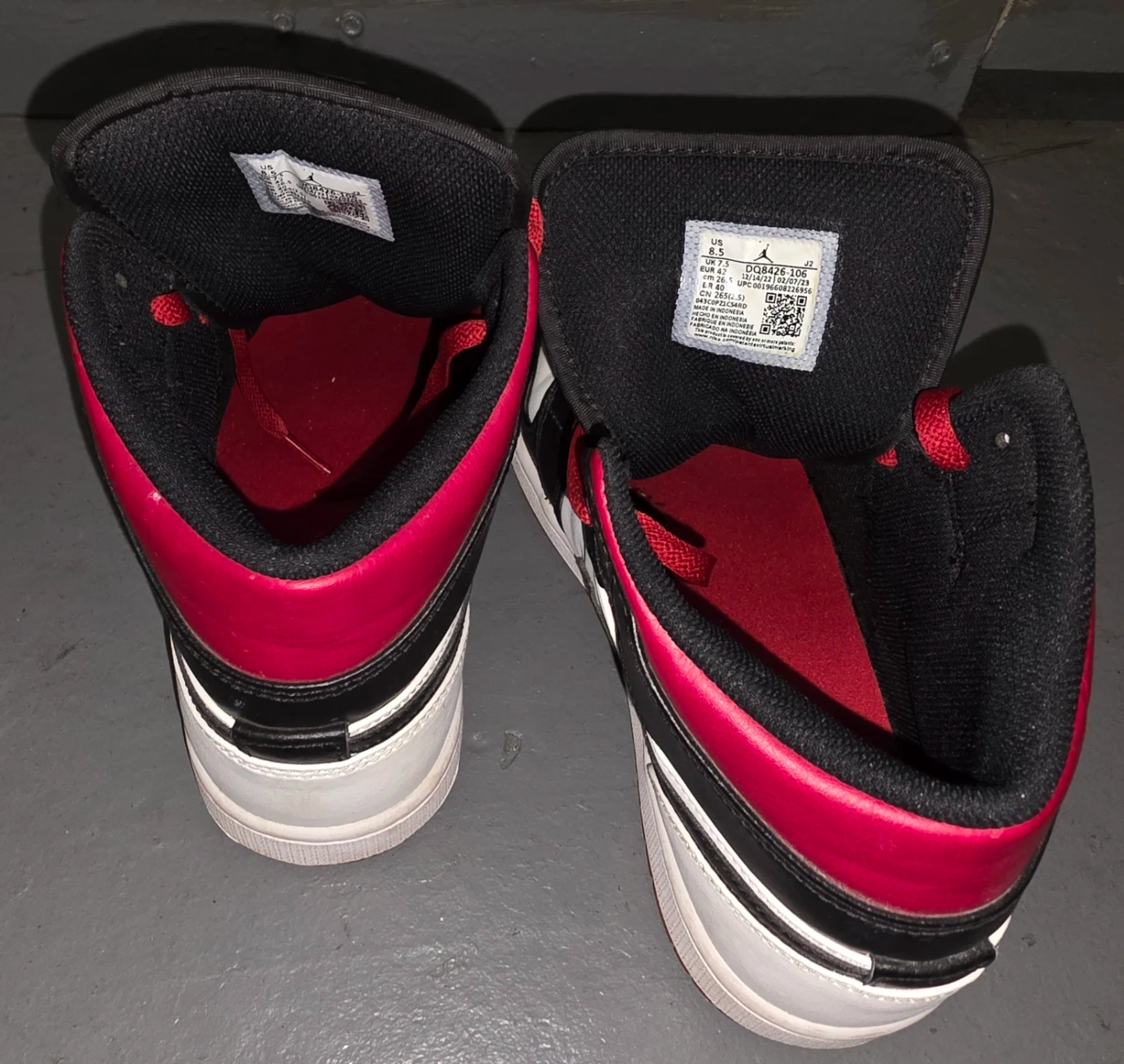 Selling a pair of Nike Air Jordan 1 Mid sneakers in size 8.5. They feature a classic black, white, and red colorway. Check out the photos for details!