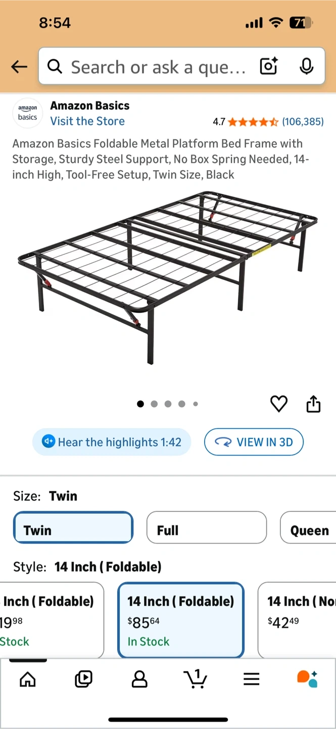 Amazon Basics foldable metal platform bed frame. Twin size and black color. It's 14 inches high and made of sturdy steel. Tool-free setup is included.