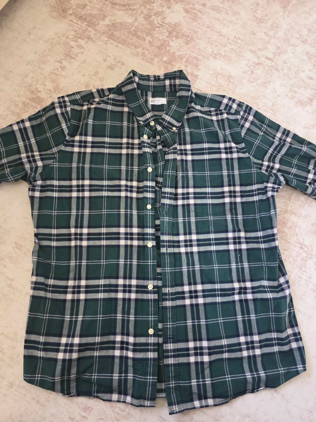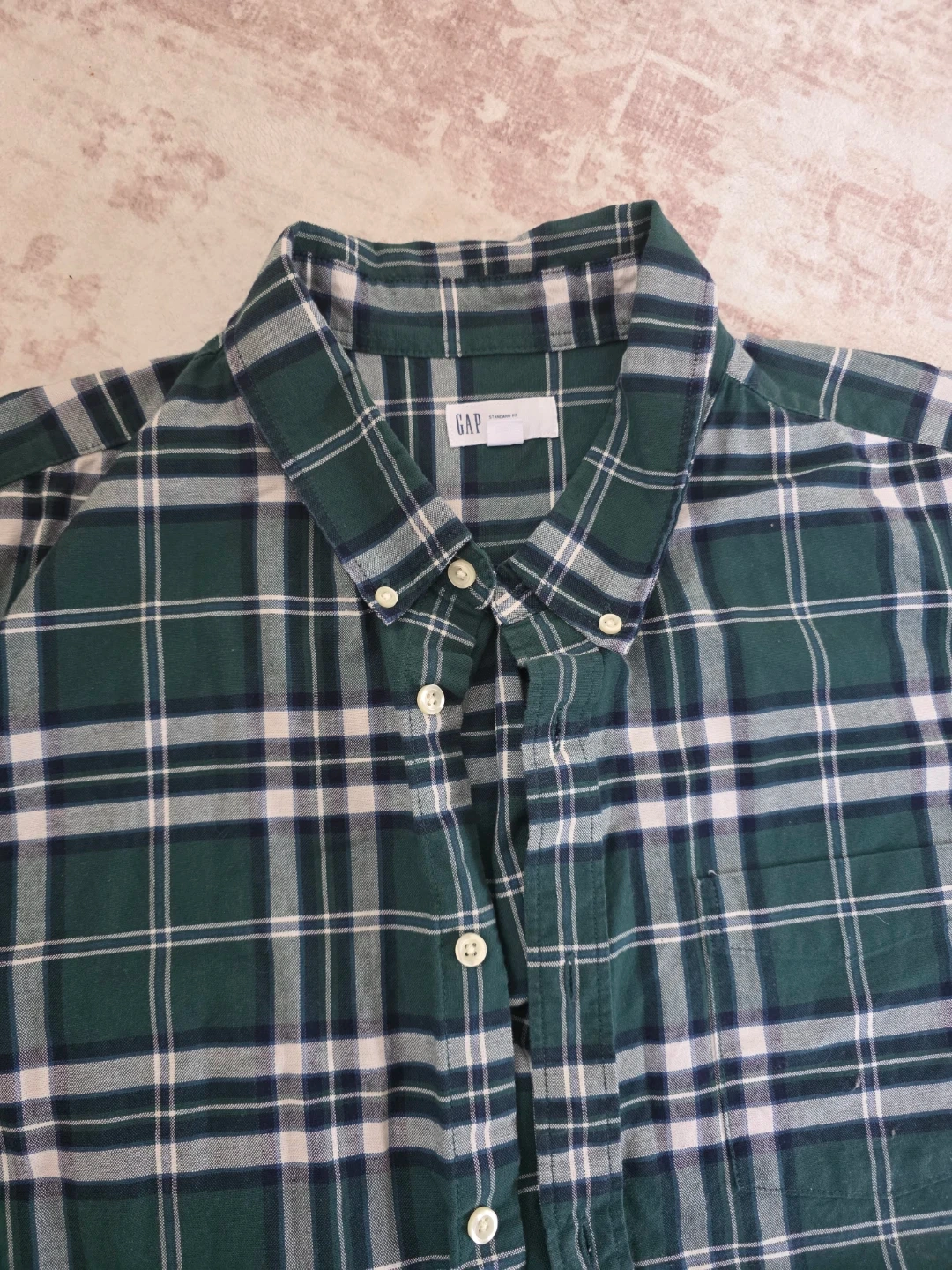 This is a GAP brand plaid button-down shirt. It's a classic green, white, and navy plaid pattern. Button-front closure with a collared neckline.