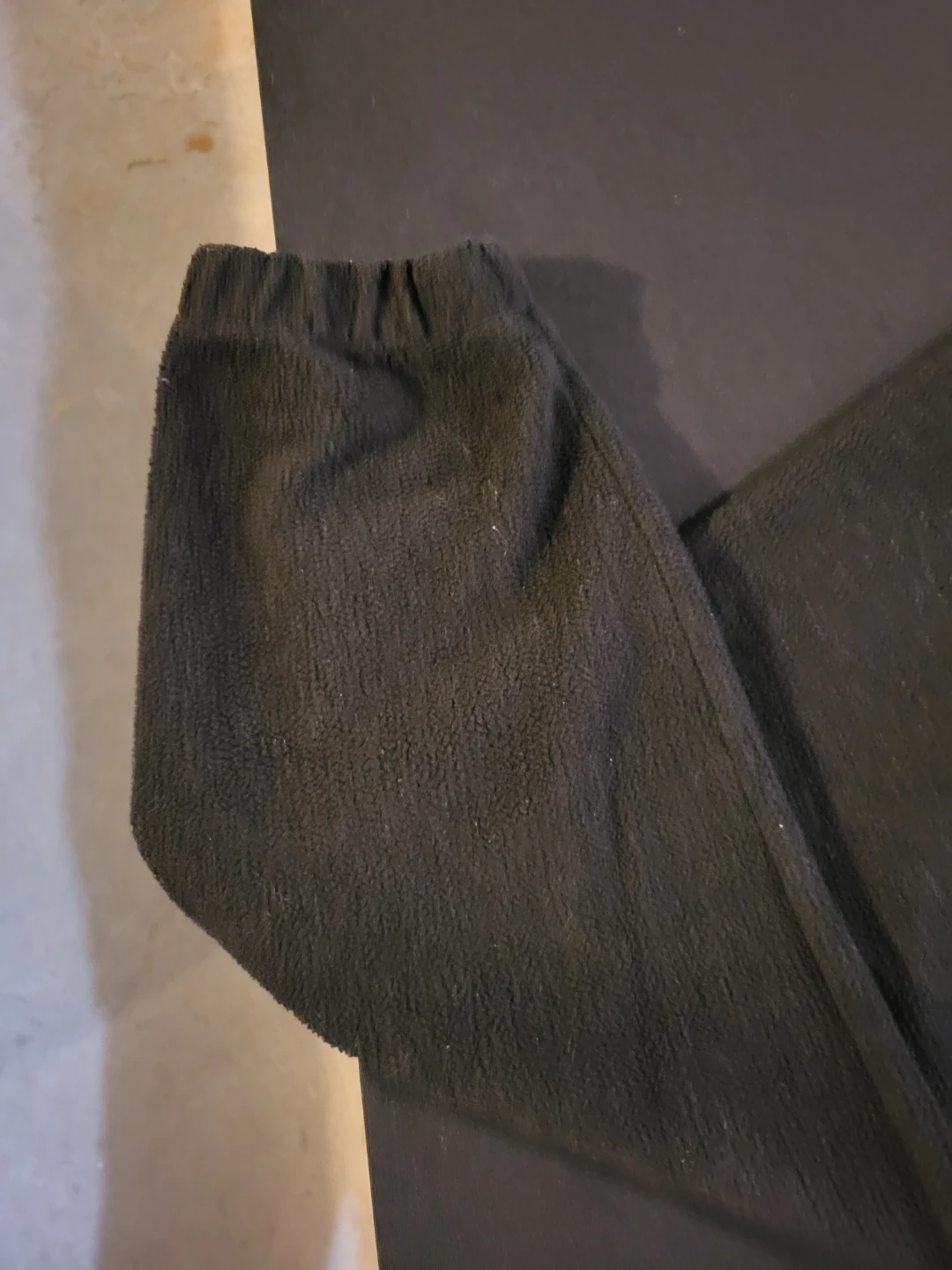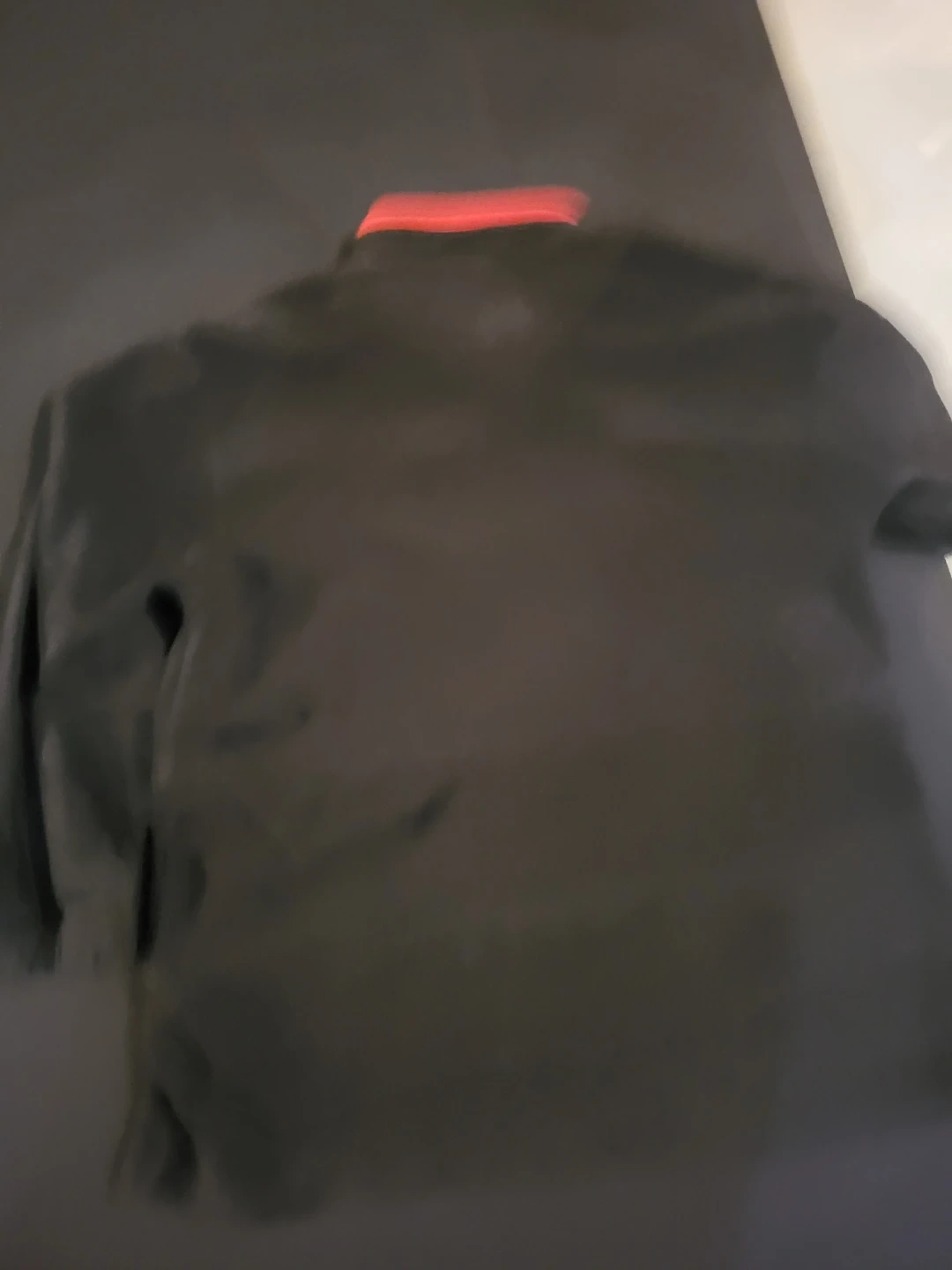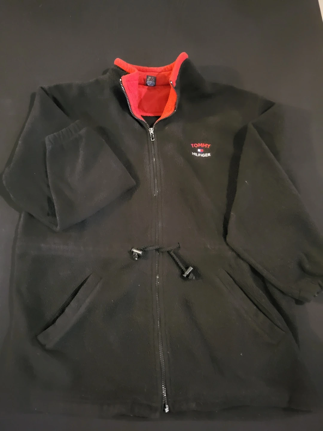This Tommy Hilfiger fleece jacket is black with a red lining. It's a size large and features a full zip closure with pockets. The material is soft fleece, perfect for cooler weather.