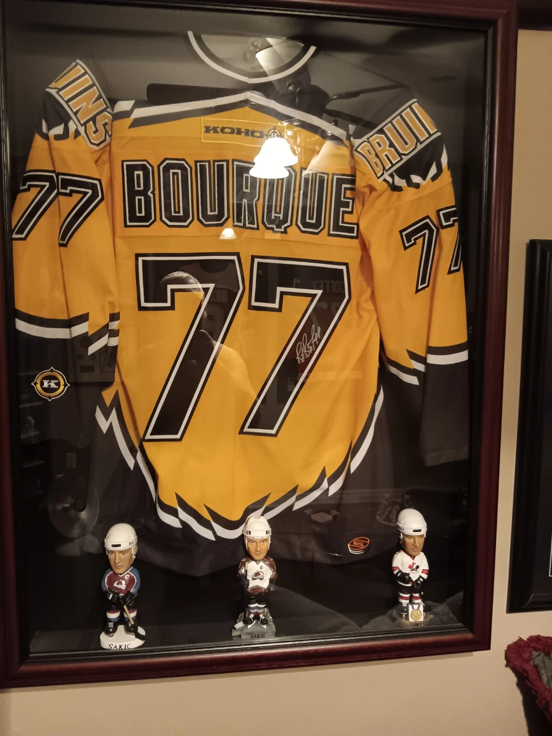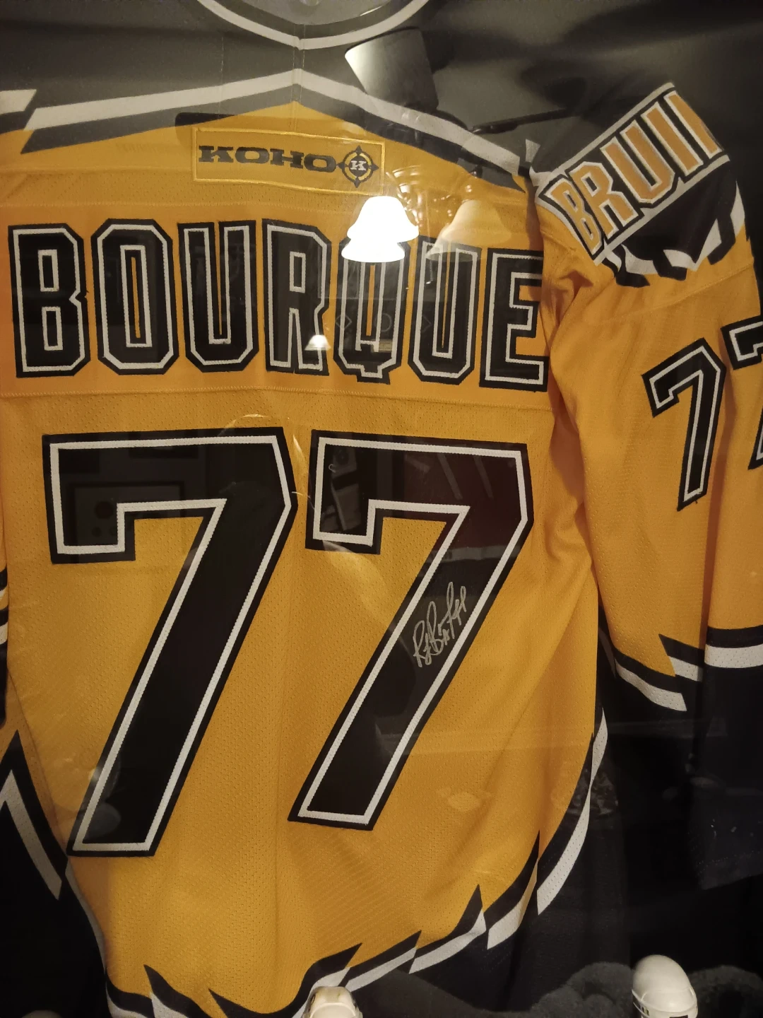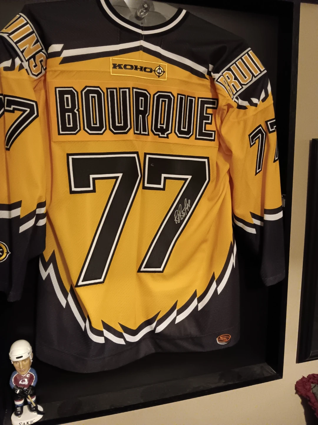 This is a Ray Bourque Boston Bruins hockey jersey. It's yellow and black with his name and number 77. The jersey is signed.