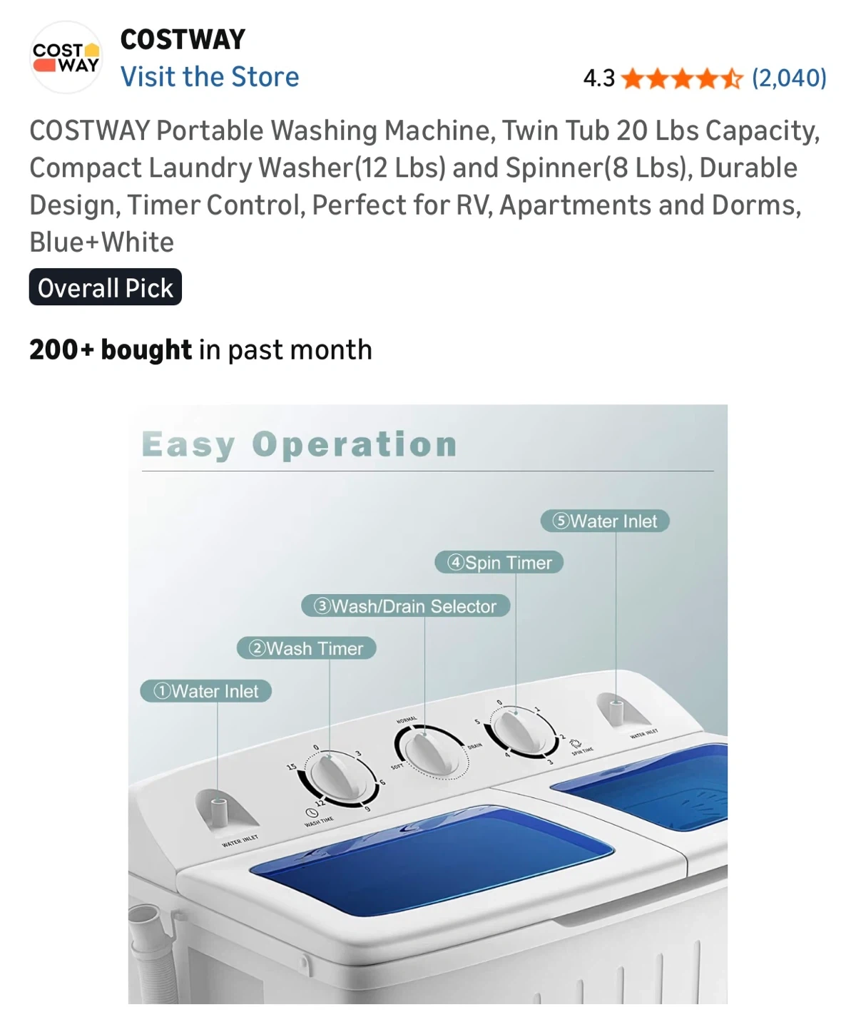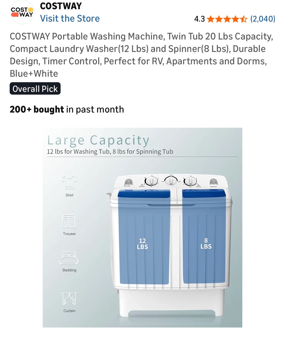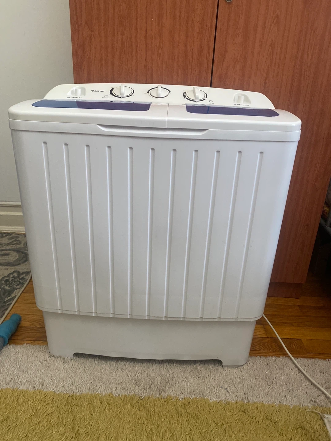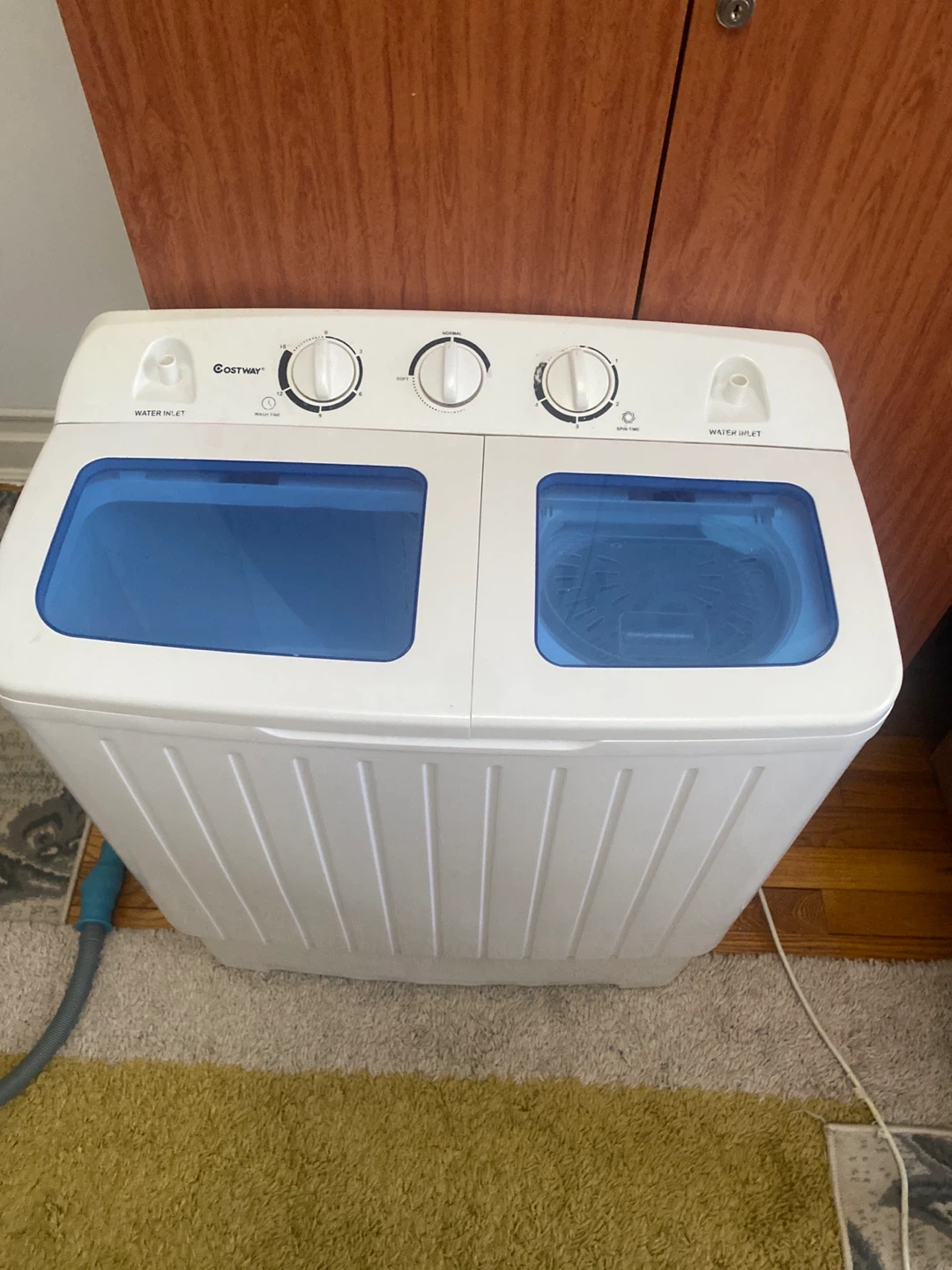 Selling a Costway portable twin tub washing machine. It's in good condition and ready to use! Great for small spaces or apartments. The washing machine it self can wash 12 lb and the dryer can dry 8lb at a time. There are a few stains but nothing is damaged. The water tube is dirty but not an issue when using the washing machine. I bought it for $170 but am selling for $70. Willing to negotiate the price a bit if needed!
