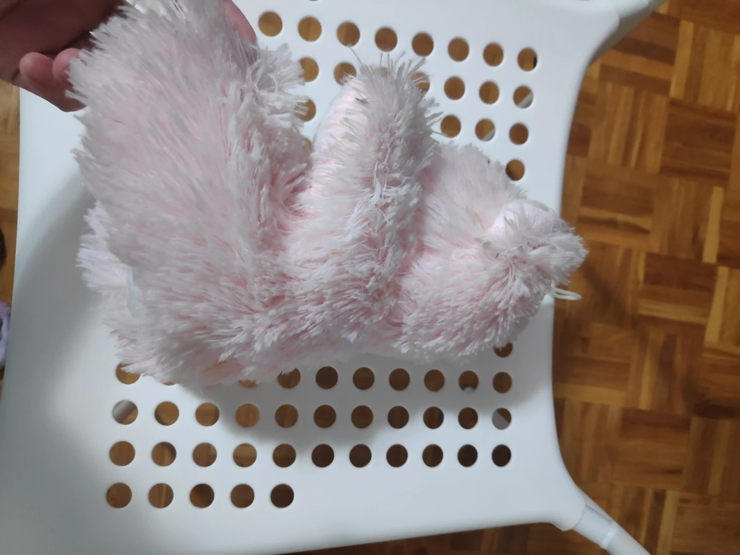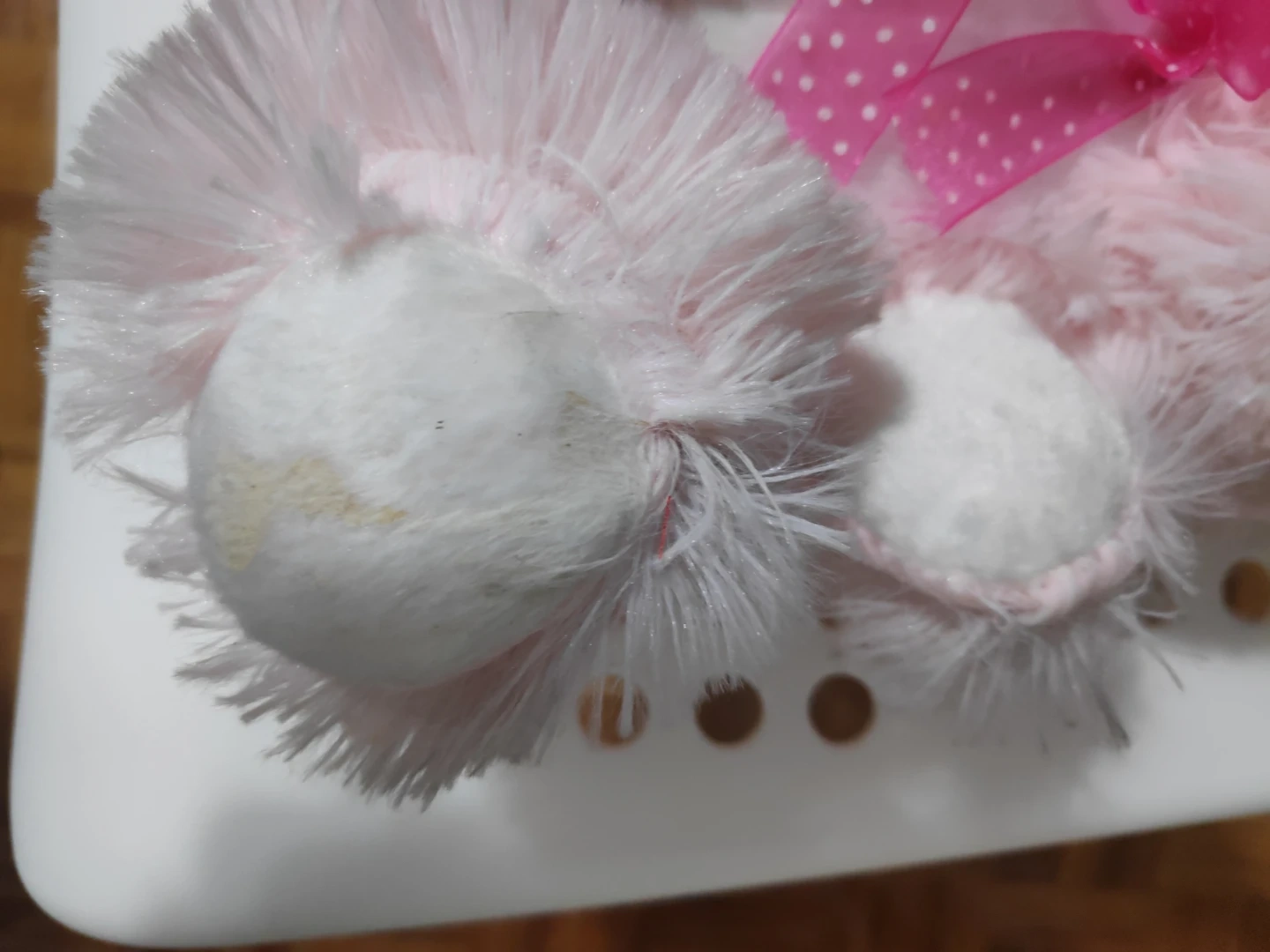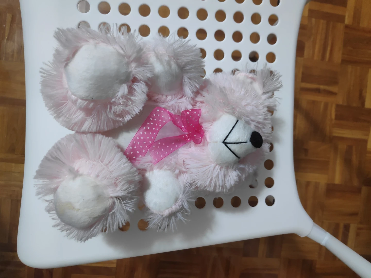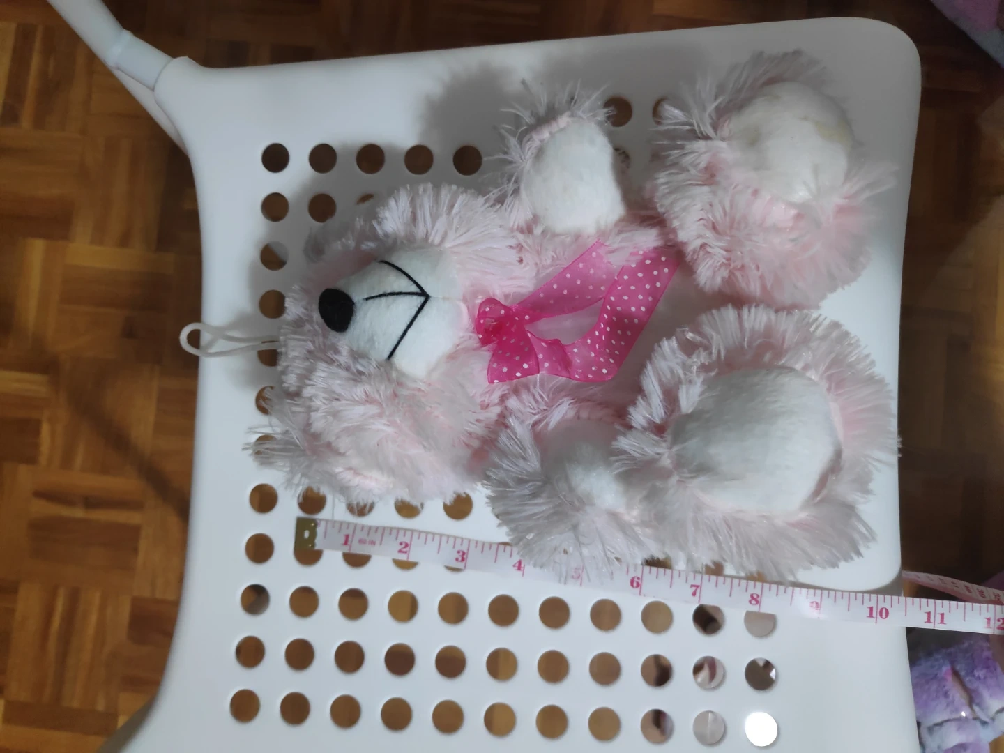 This is a soft, pink teddy bear plush toy. It has a sweet pink ribbon with white polka dots tied around its neck. The toy is made of fuzzy material and is perfect for snuggles!