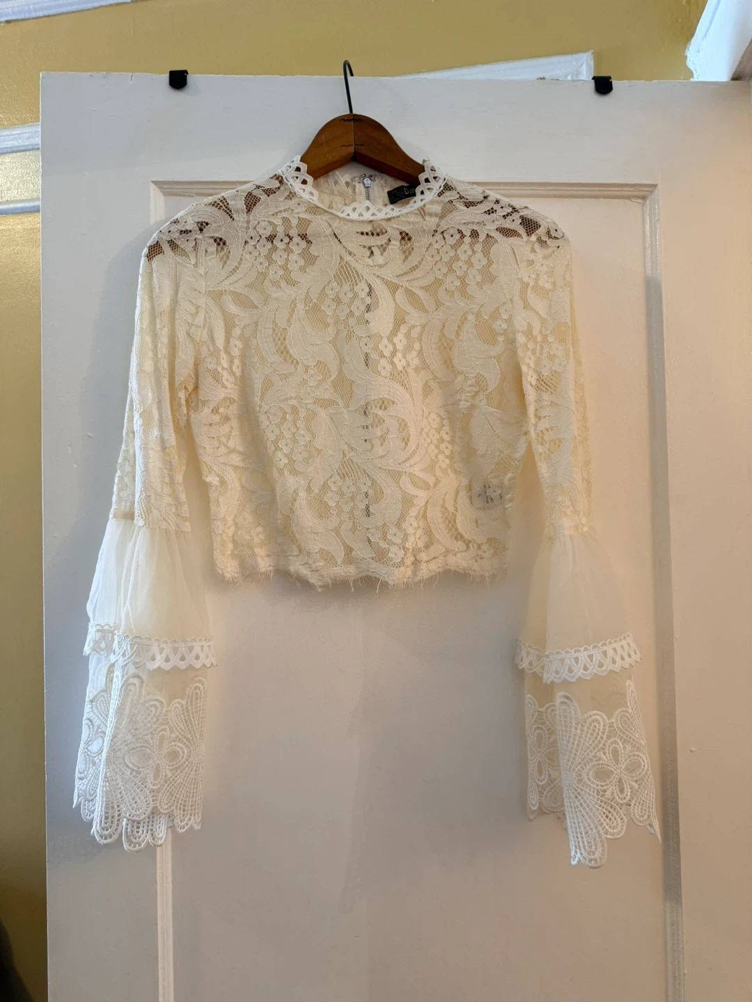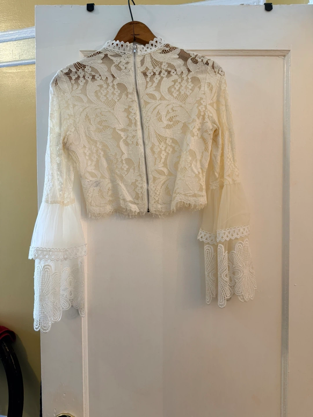 Buy & SellCream Lace Bell Sleeve Cropped TopCream Lace Bell Sleeve Cropped Top$14Cream lace cropped top with dramatic bell sleeves. It features a high neckline and a zipper closure at the back. Lace fabrication with sheer sleeve details.ConditionGoodSizeSmallWHERE TO MEETCheck LocationView MapSELLERverifiedStefanieMiddle Village762 reviews0 chats·0 favorites·6 viewsSEND CHAT TO SELLERHi Stefanie! I’m interested in your listing.Hi Stefanie! I’m interested in your listing.Get the Karrot app to chatSign In to chat
