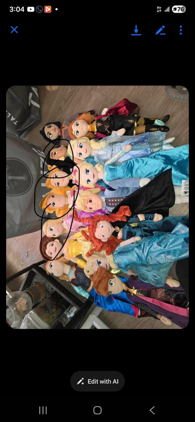 This lot includes a variety of plush dolls featuring popular Disney princesses like Elsa, Anna, and Belle. They're soft and cuddly, perfect for any Disney fan! These dolls are great for imaginative play and display. Circled ones are gone