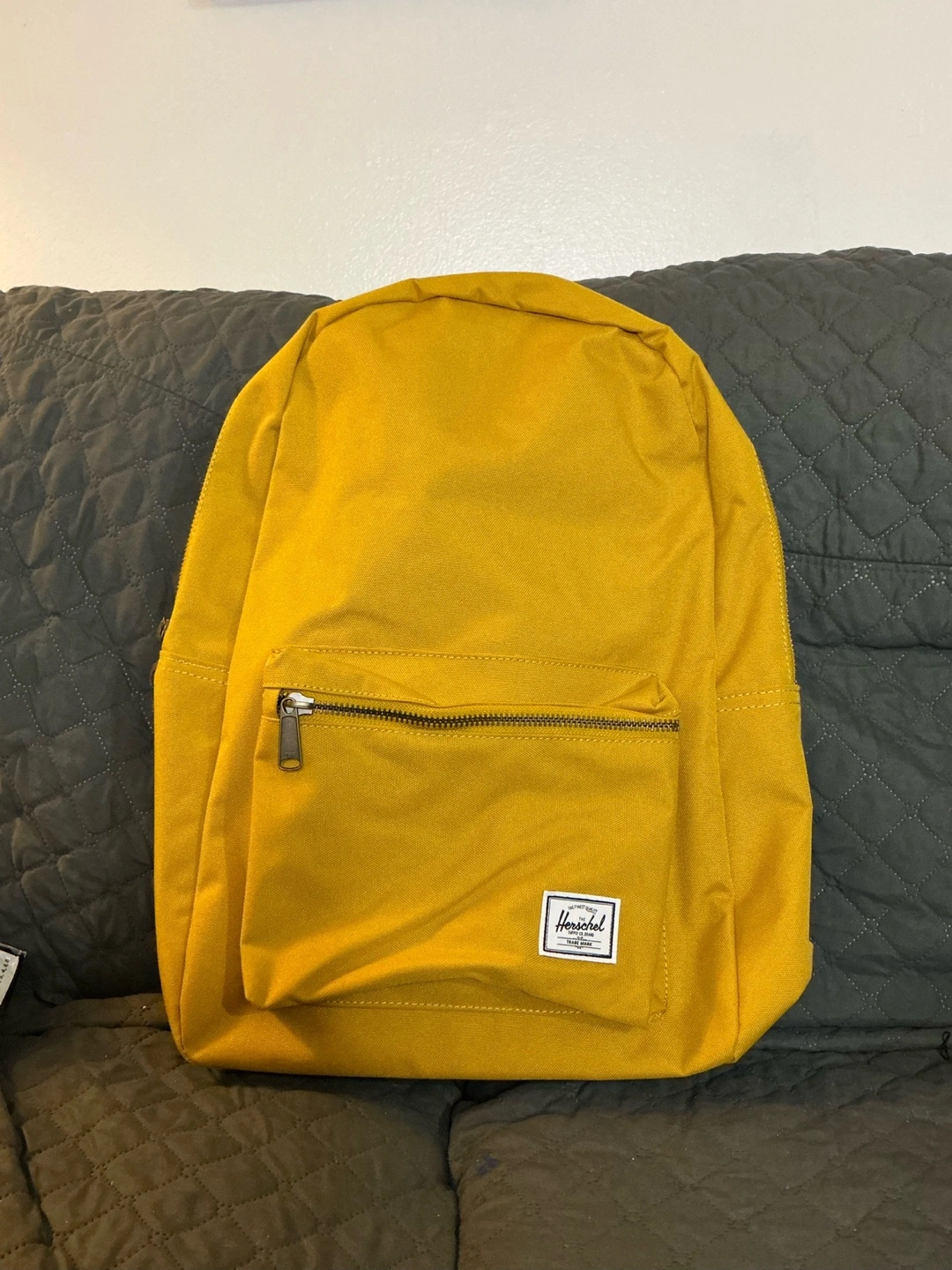 Yellow backpack with a zippered front pocket.