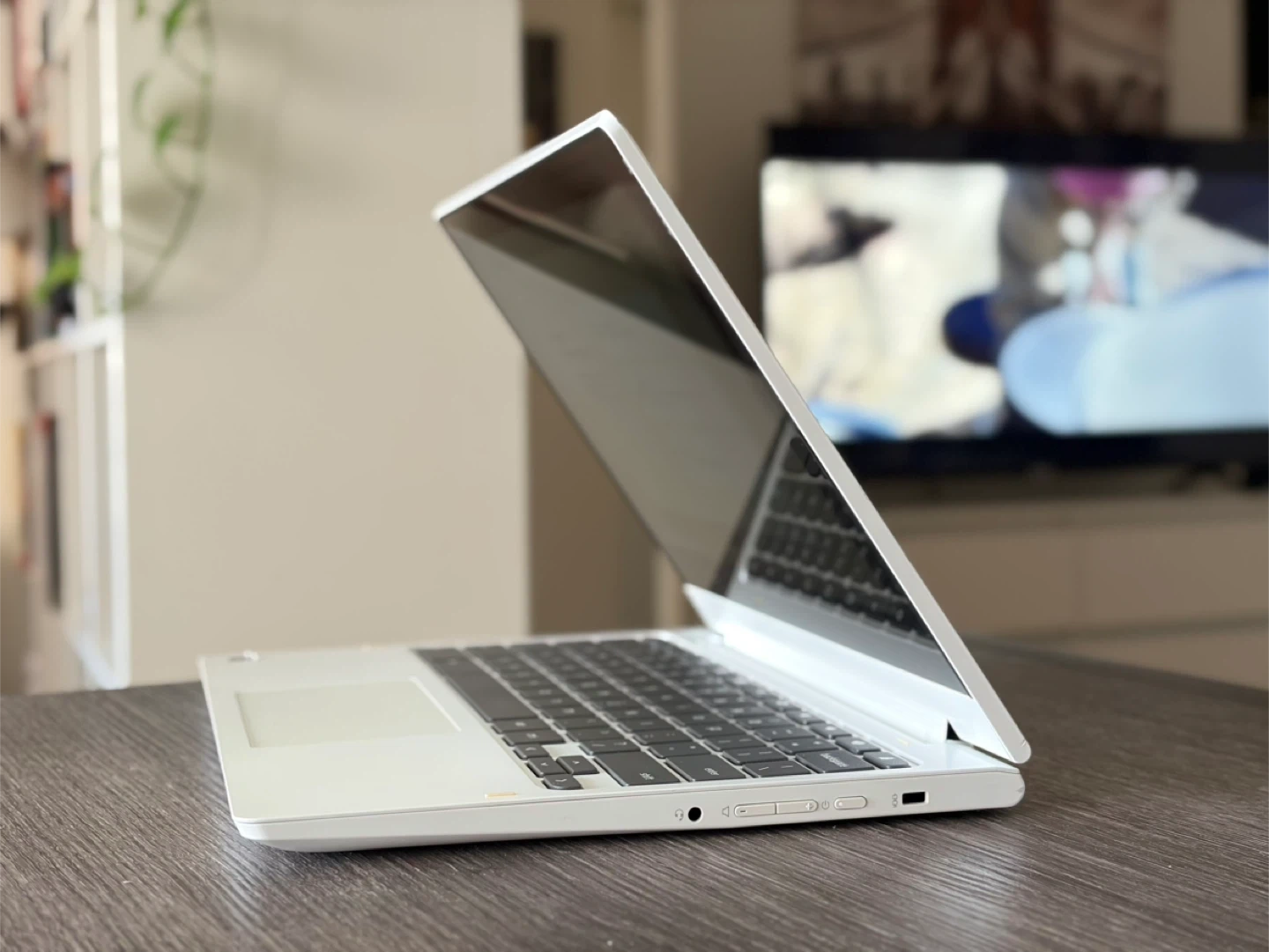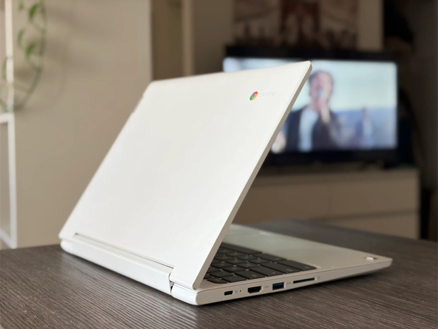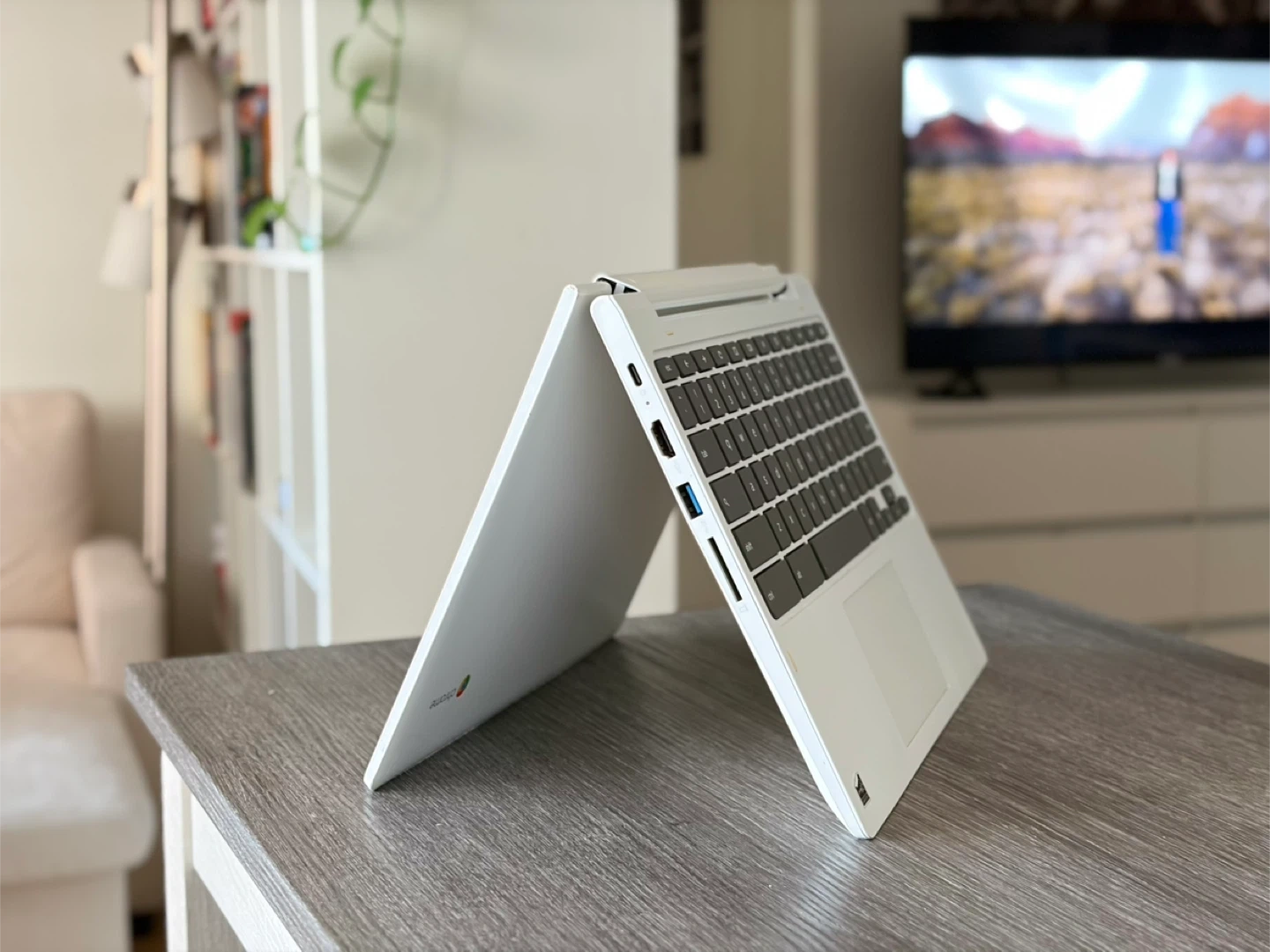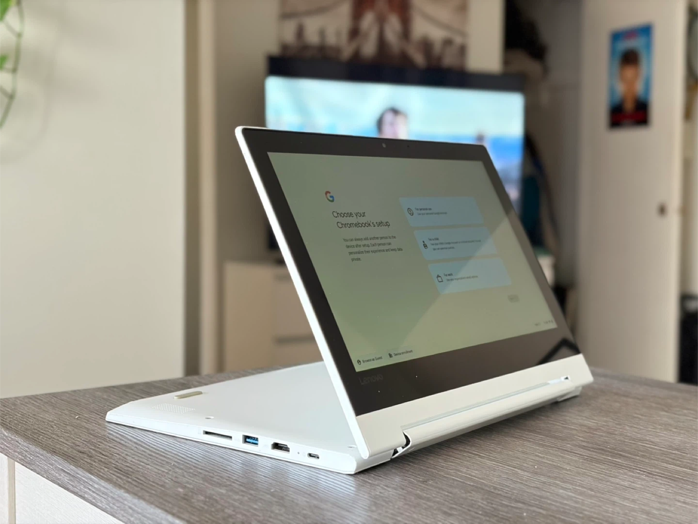 White Lenovo 2-in-1 convertible Chromebook . This laptop is ready for your daily tasks. It features a touch-screen display and runs on ChromeOS. It's a versatile device that can be used as a traditional laptop or a tablet.