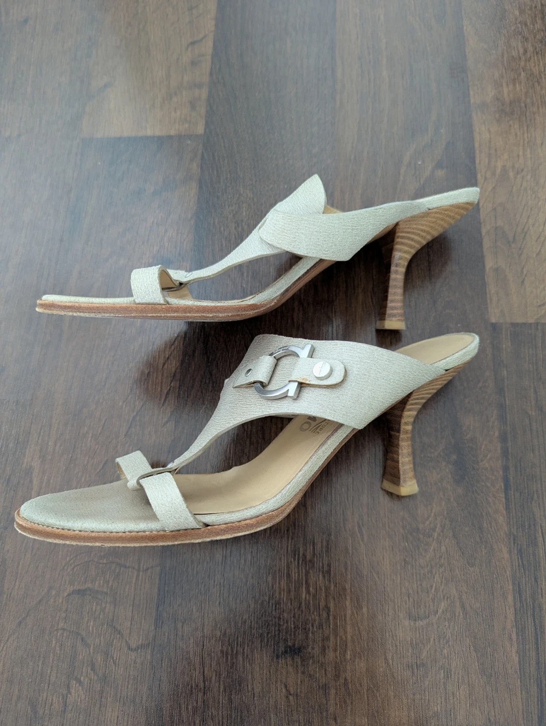Step out in style with these used Salvatore Ferragamo women's heeled sandals, size 8.5B, featuring an elegant design and comfortable fit. These have been previously worn and show normal signs of wear, but they still have plenty of life left. Perfect for adding a touch of luxury to any outfit.