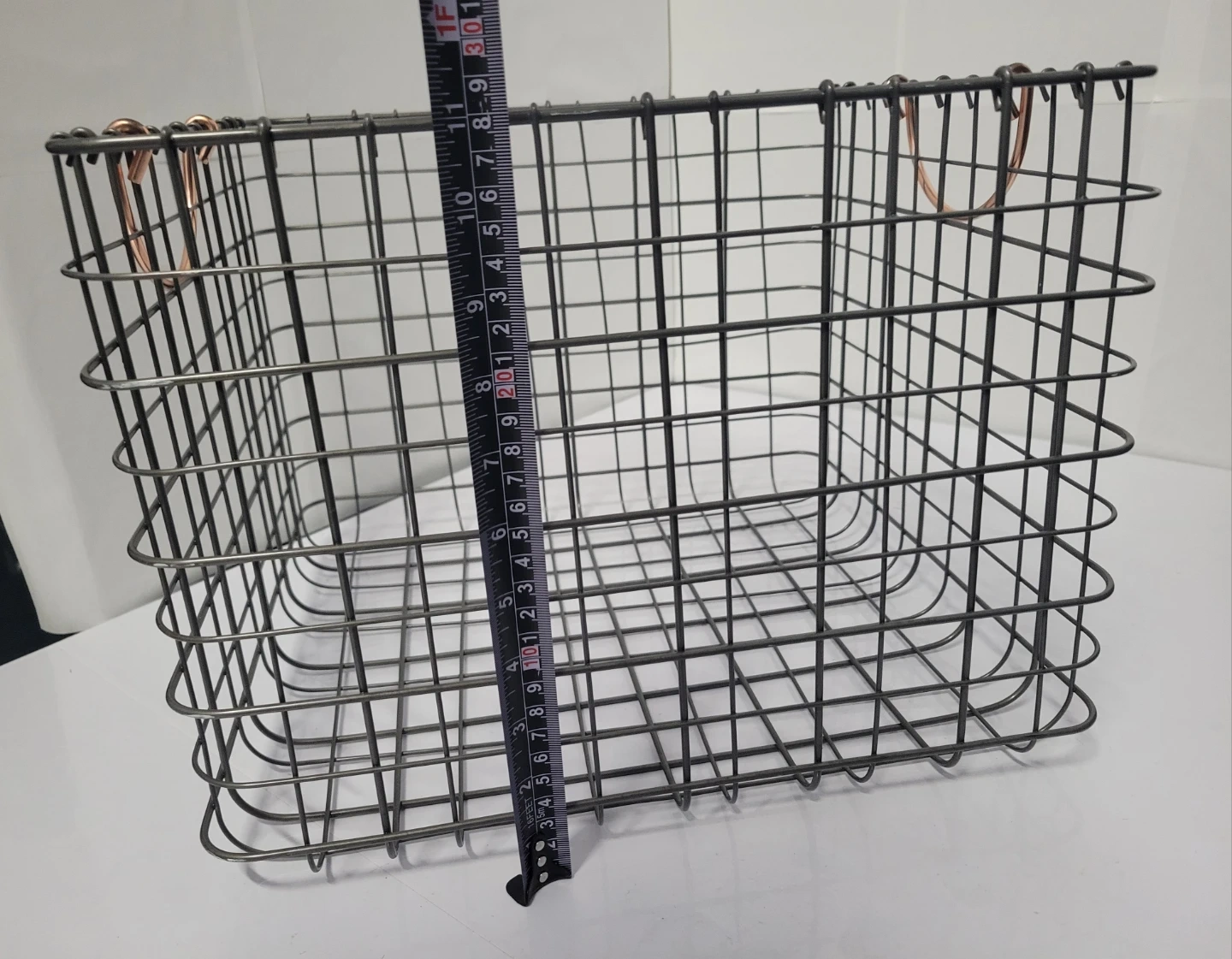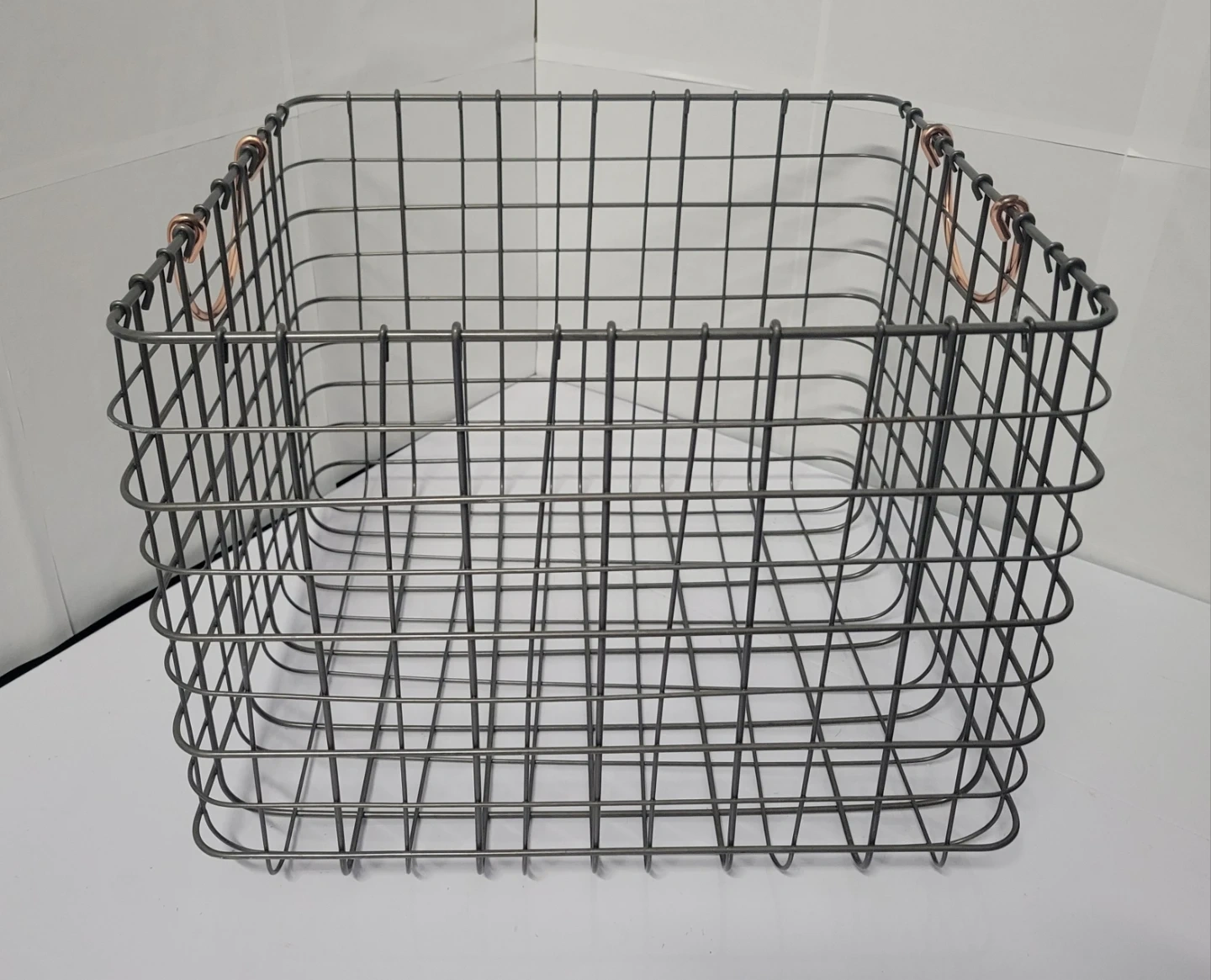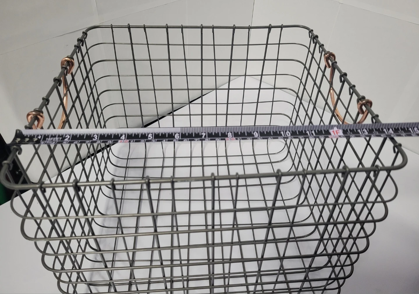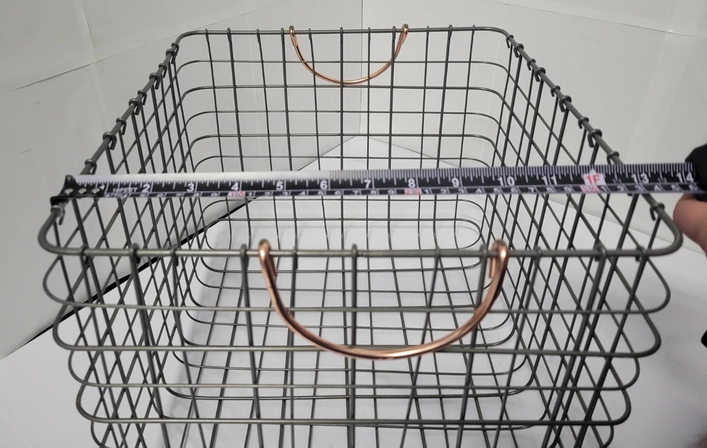 Wire storage basket with copper-toned handles. Its dimensions are approximately 14 inches long, 13 inches wide, and 11 inches tall. This basket's sturdy wire construction makes it useful for organizing various household items.