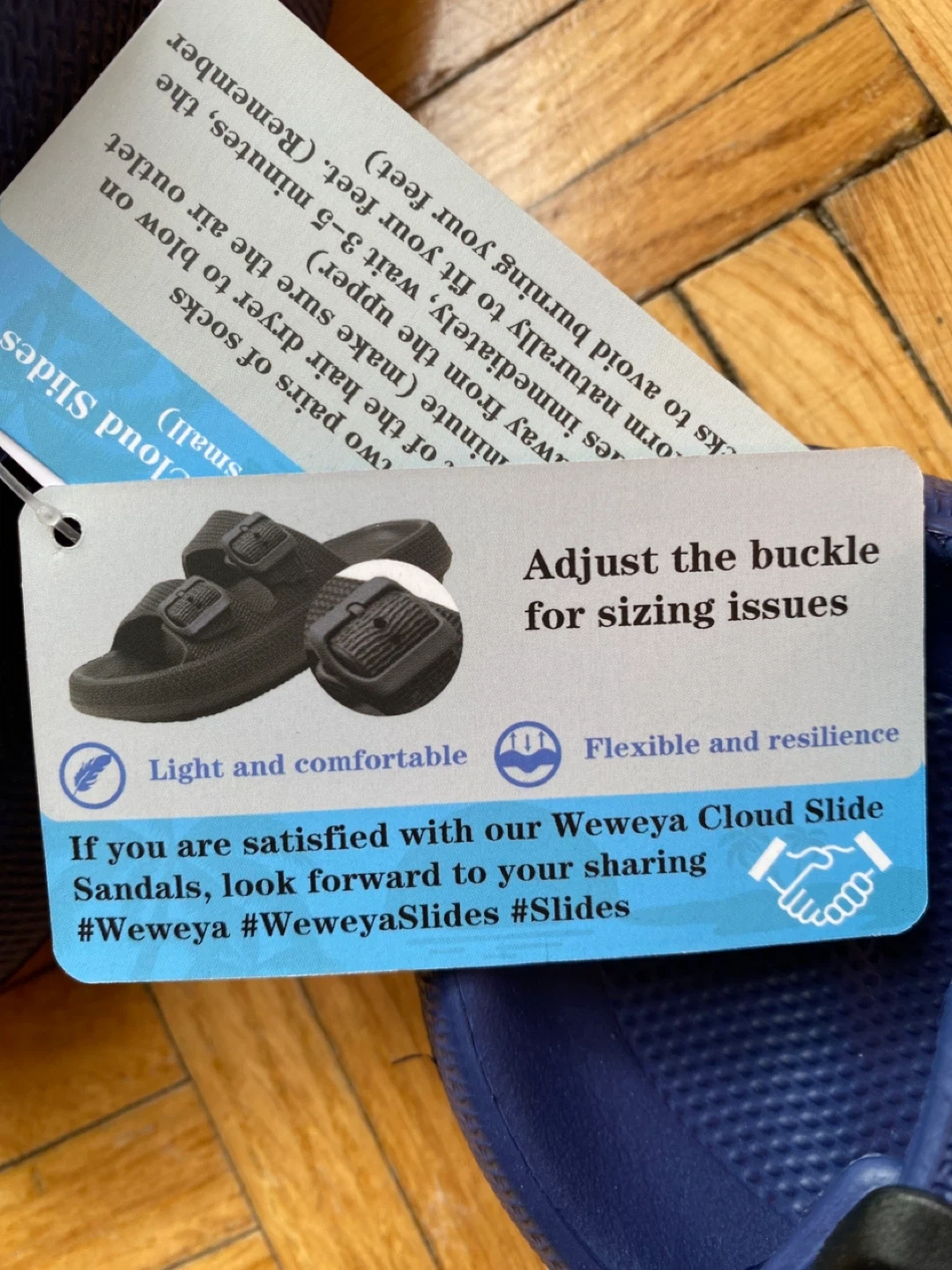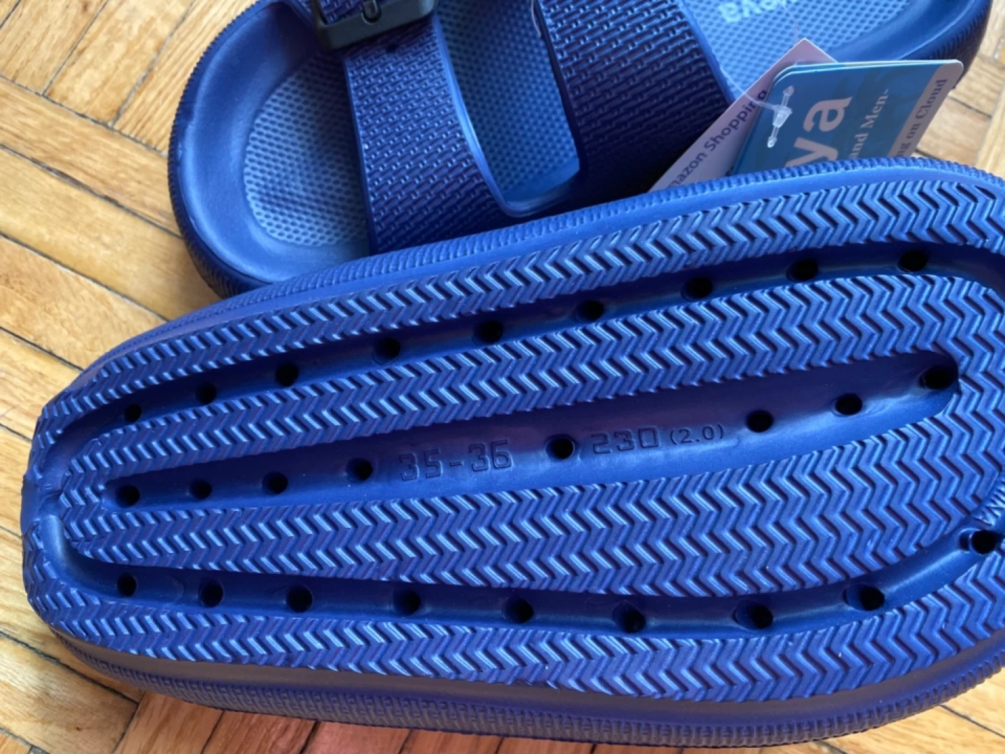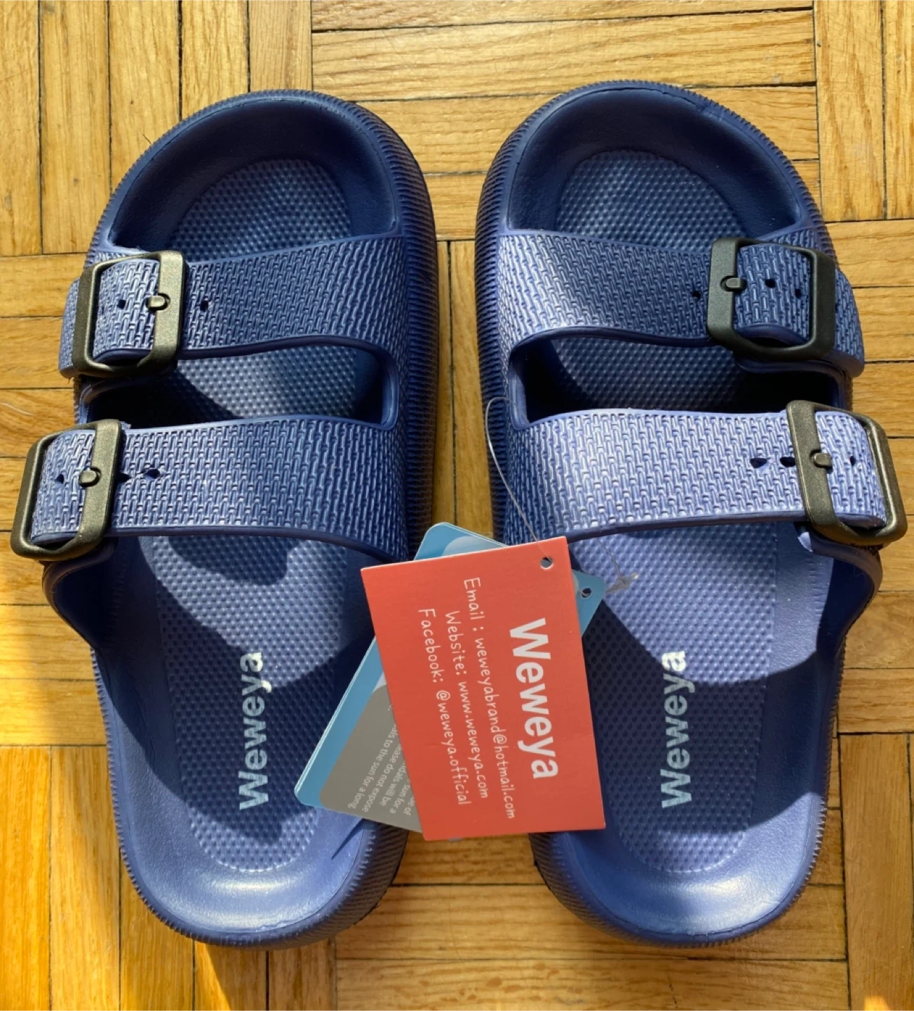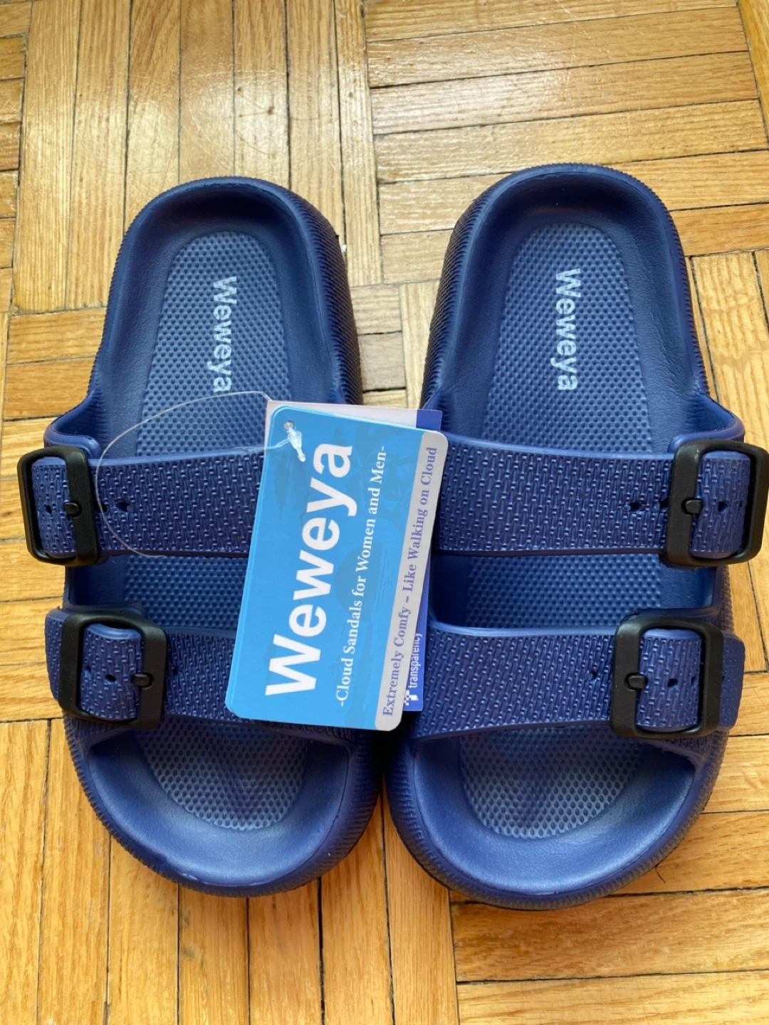 These Weweya cloud sandals are blue and feature adjustable buckles. They're light, comfortable, flexible, and resilient. Size 35-36.