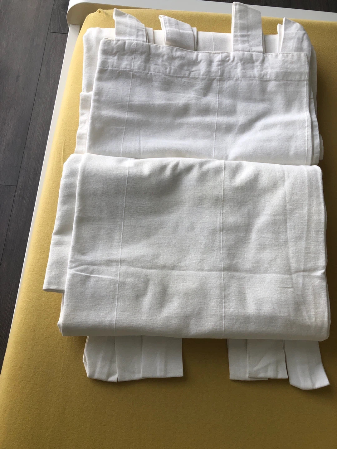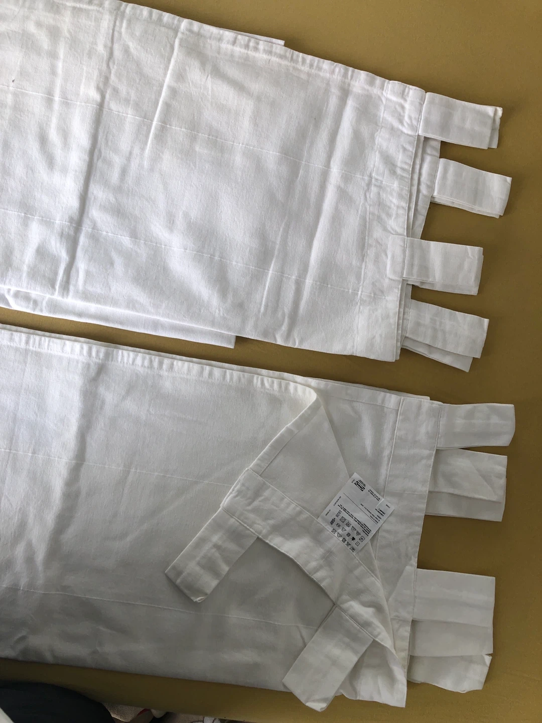 A pair of white tab top curtains from IKEA. These are made of 100% cotton. They're simple and would work well in most rooms, thick enough to block out light. Machine washable. Check out my other postings, Combo deals and great discounts when purchasing 2 or more items.