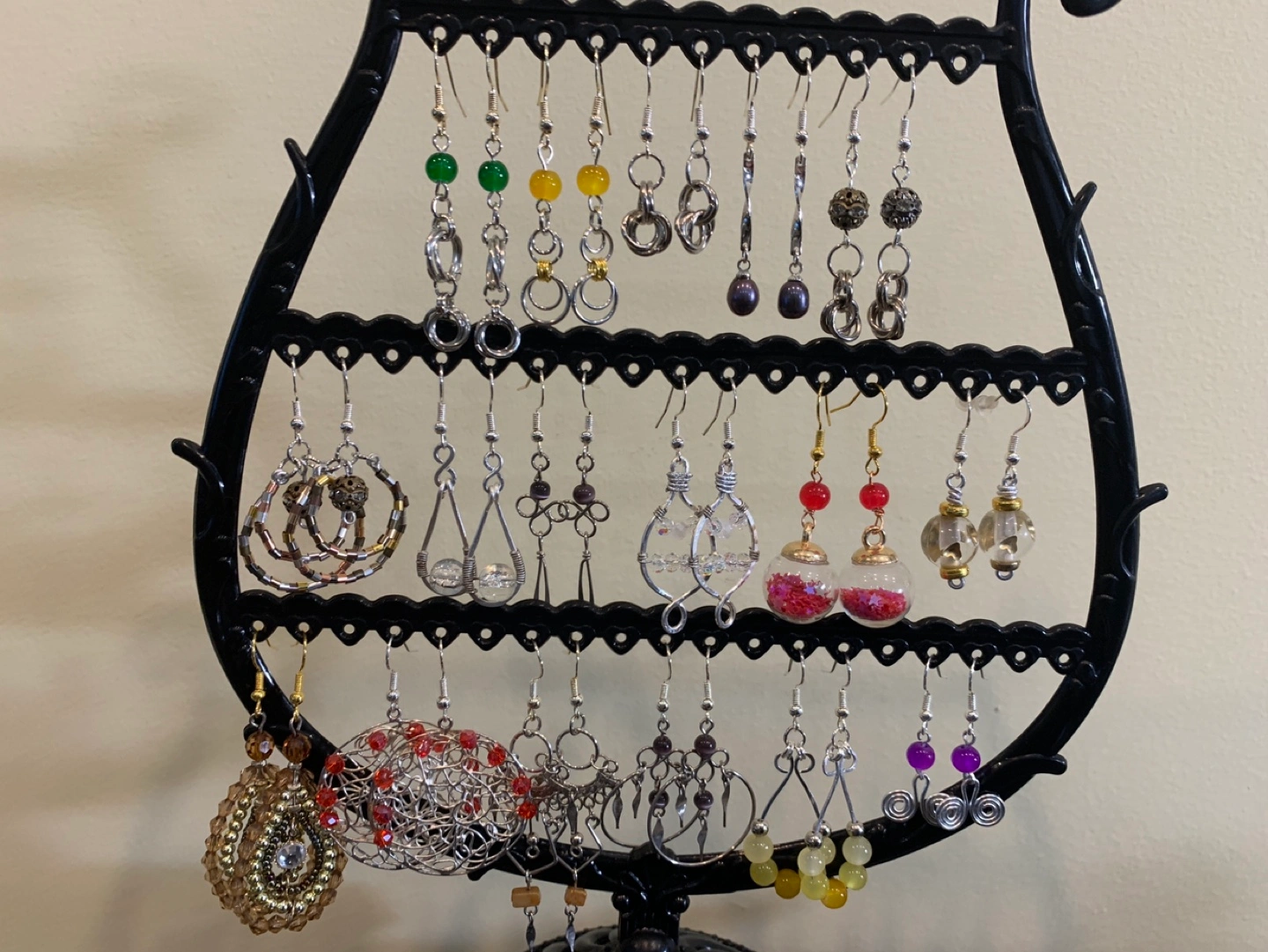 Variety of dangle earrings with metal, stones, beads, and glass accents. $6 each, $10 for two. Text me to let me know which one you prefer.