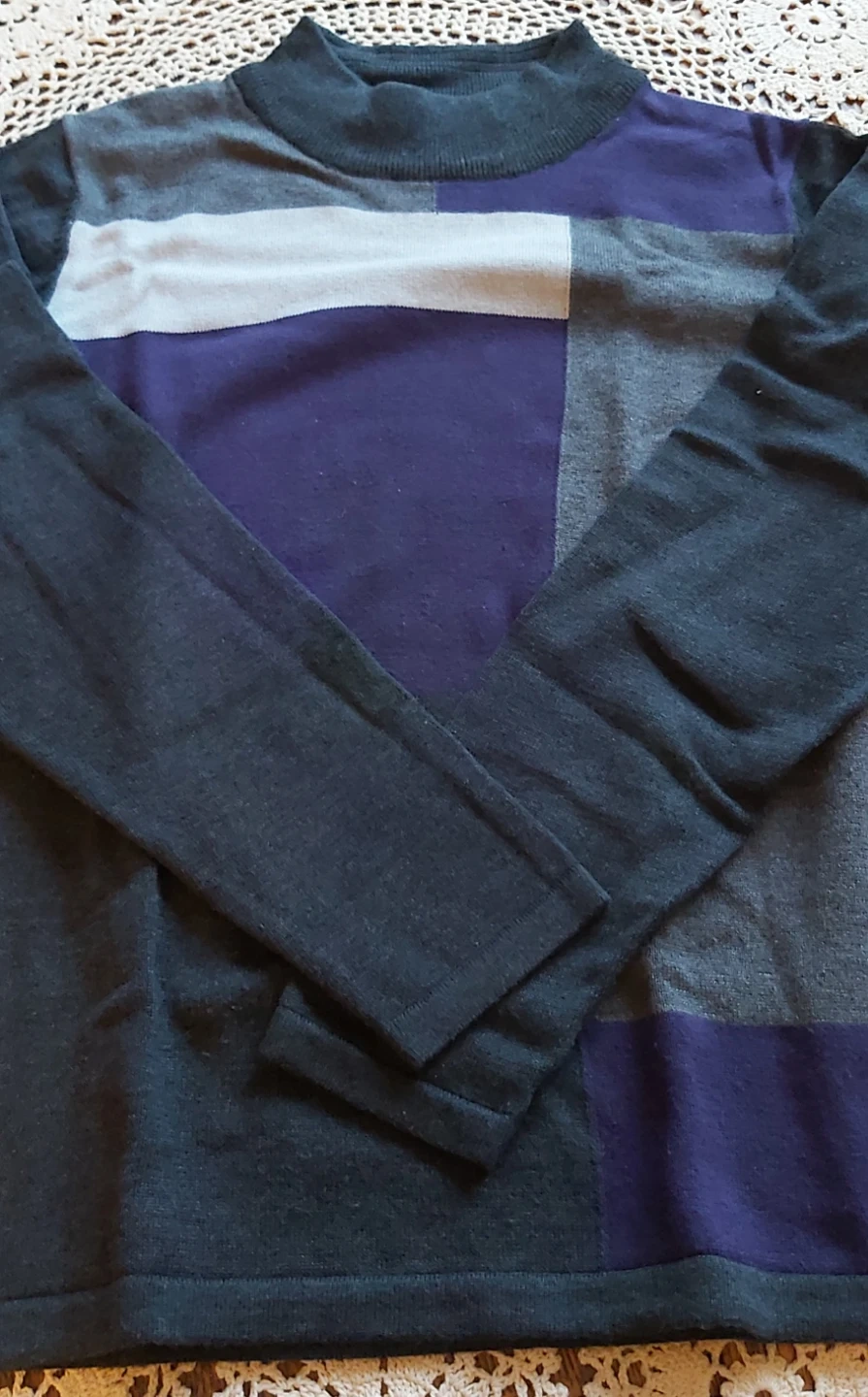 Mock neck long sleeve sweater with a colour block pattern. Made from 60% cotton and 40% acrylic. Machine wash cold, gentle cycle, lay flat to dry. This sweater's comfortable fit makes it great for everyday wear.