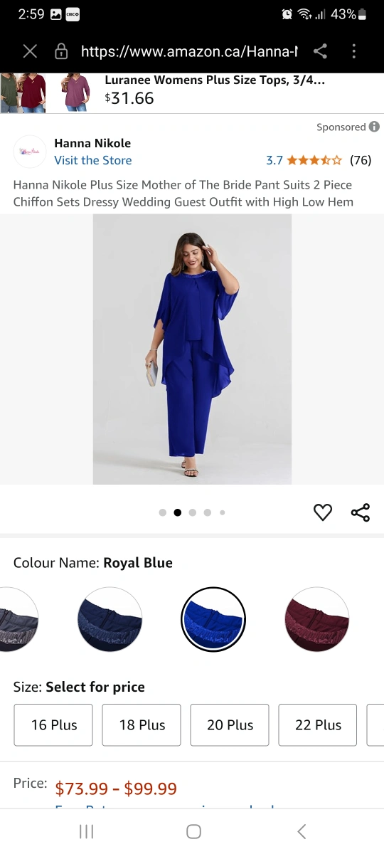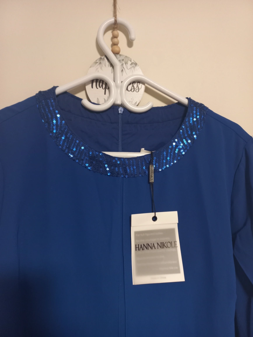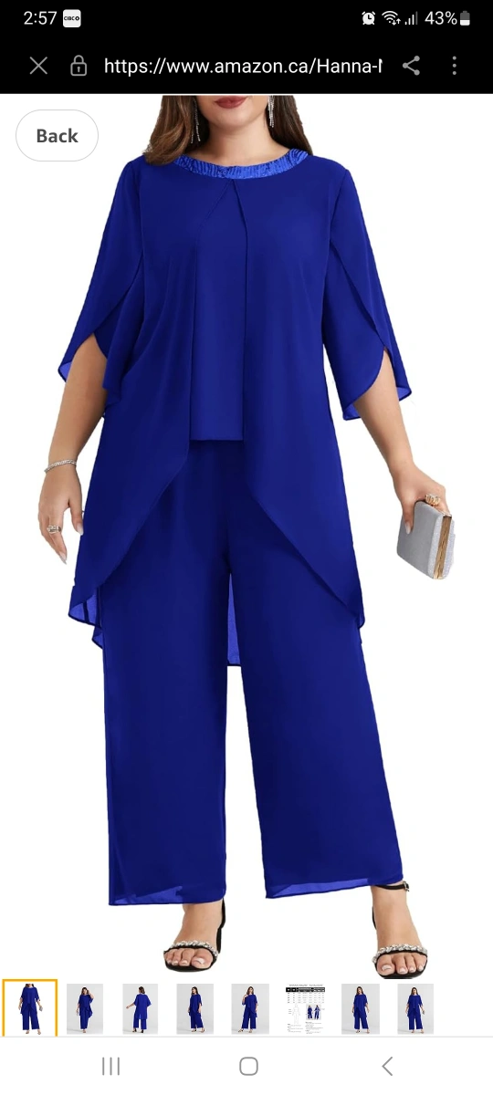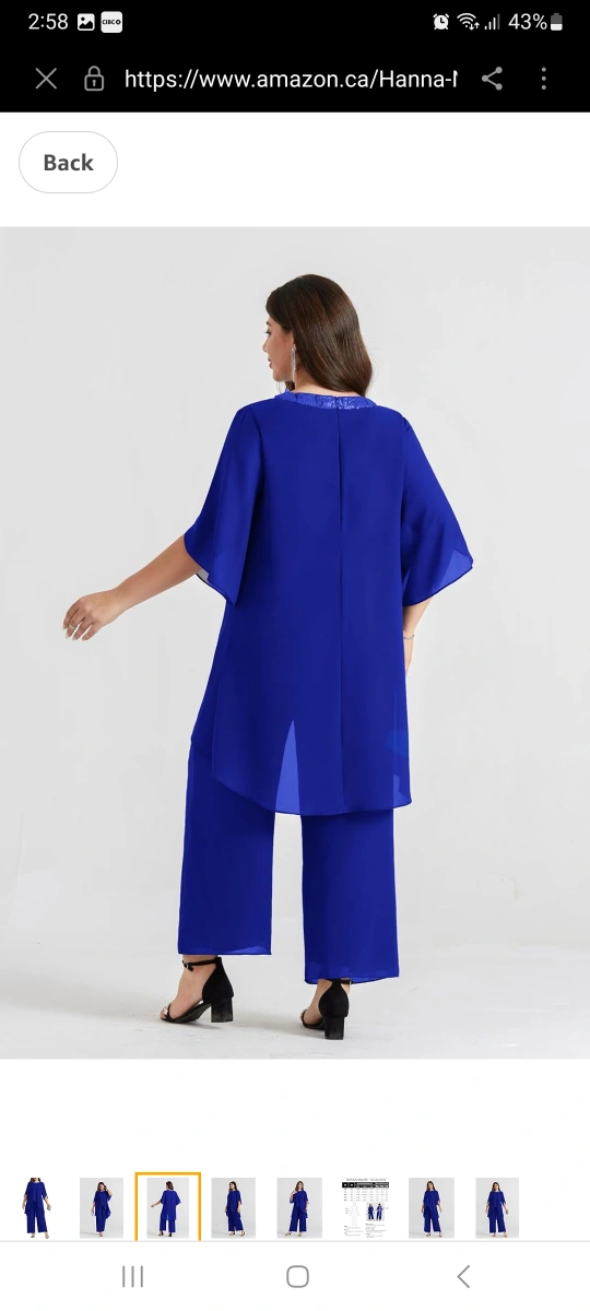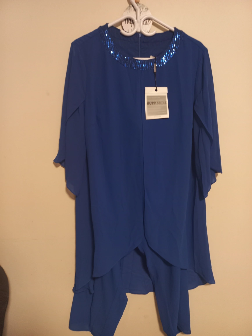Gorgeous royal blue plus size pant suit. Features a chiffon top with sequined neckline and wide-leg pants. High-low hemline on the top. Two-piece outfit, perfect for weddings or special occasions. New with tags.