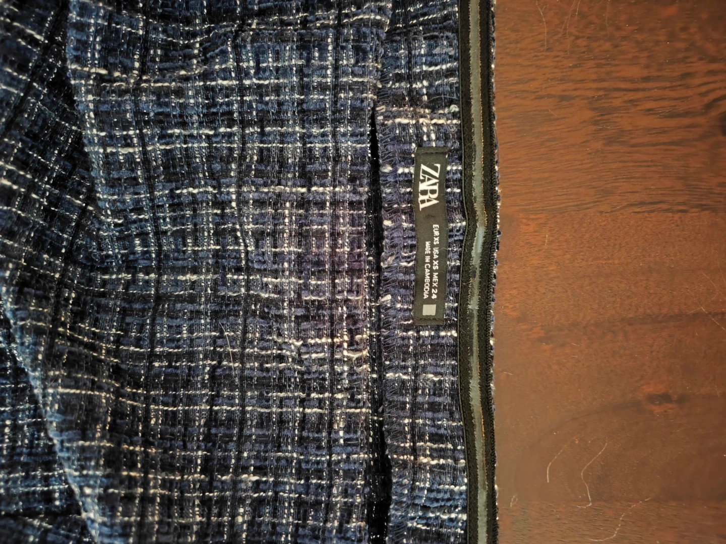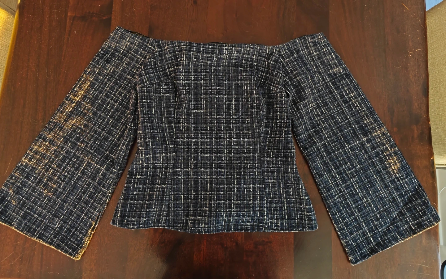 This stylish Zara dark blue tweed off-the-shoulder top with bell sleeves. The fabric has a textured weave with white and silver threads. It's perfect for a dressy occasion or a night out!