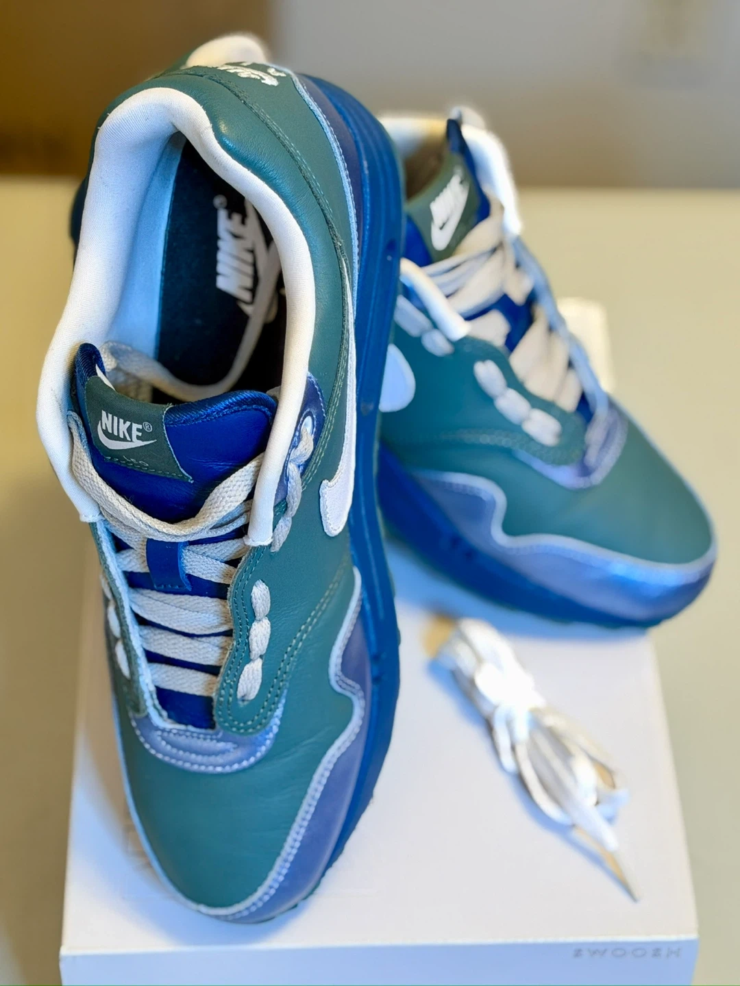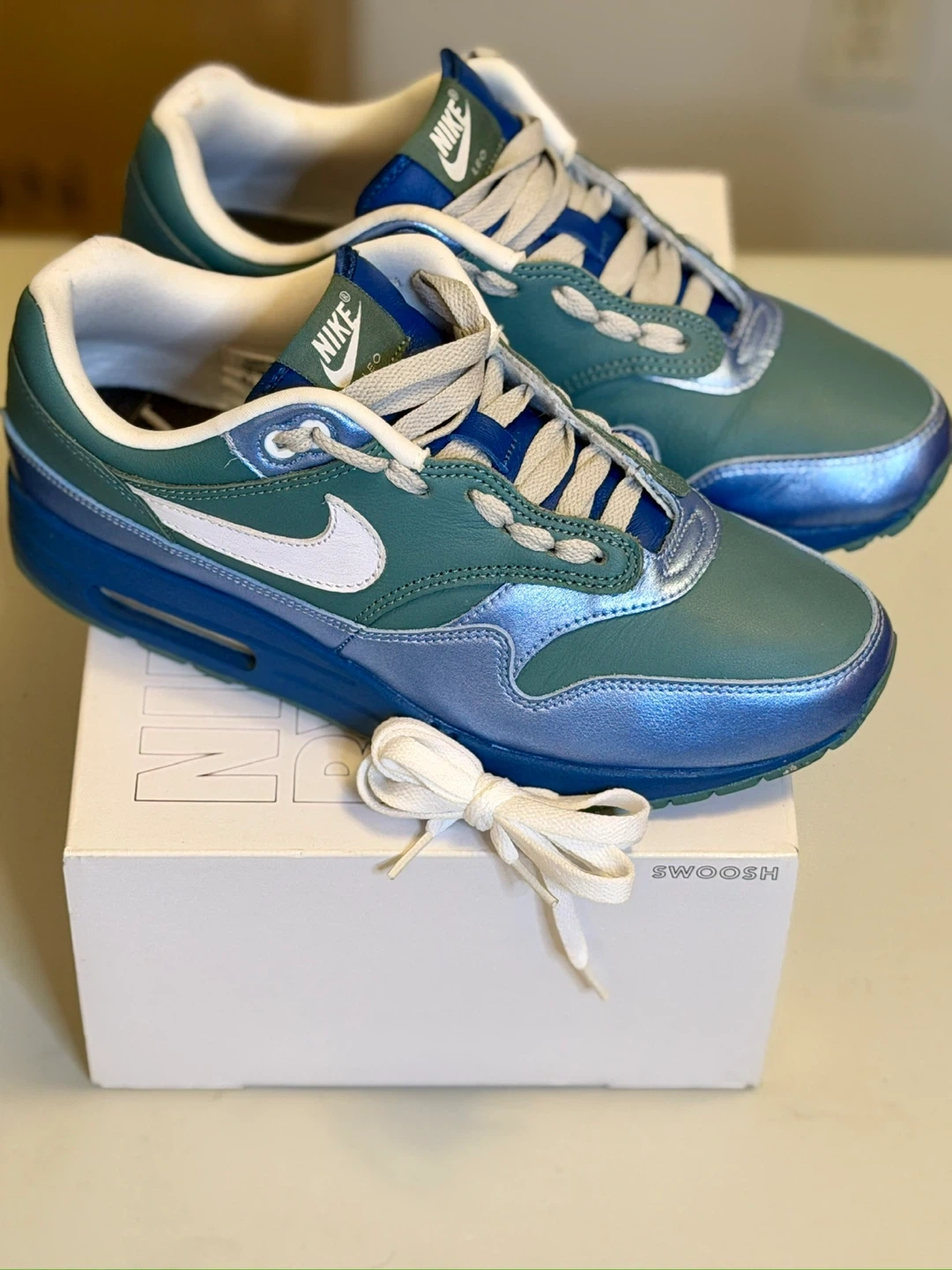 These Nike Air Max 1 sneakers feature a green and blue colorway. They include white laces and the iconic Nike Swoosh. The shoes come with an extra pair of white laces.