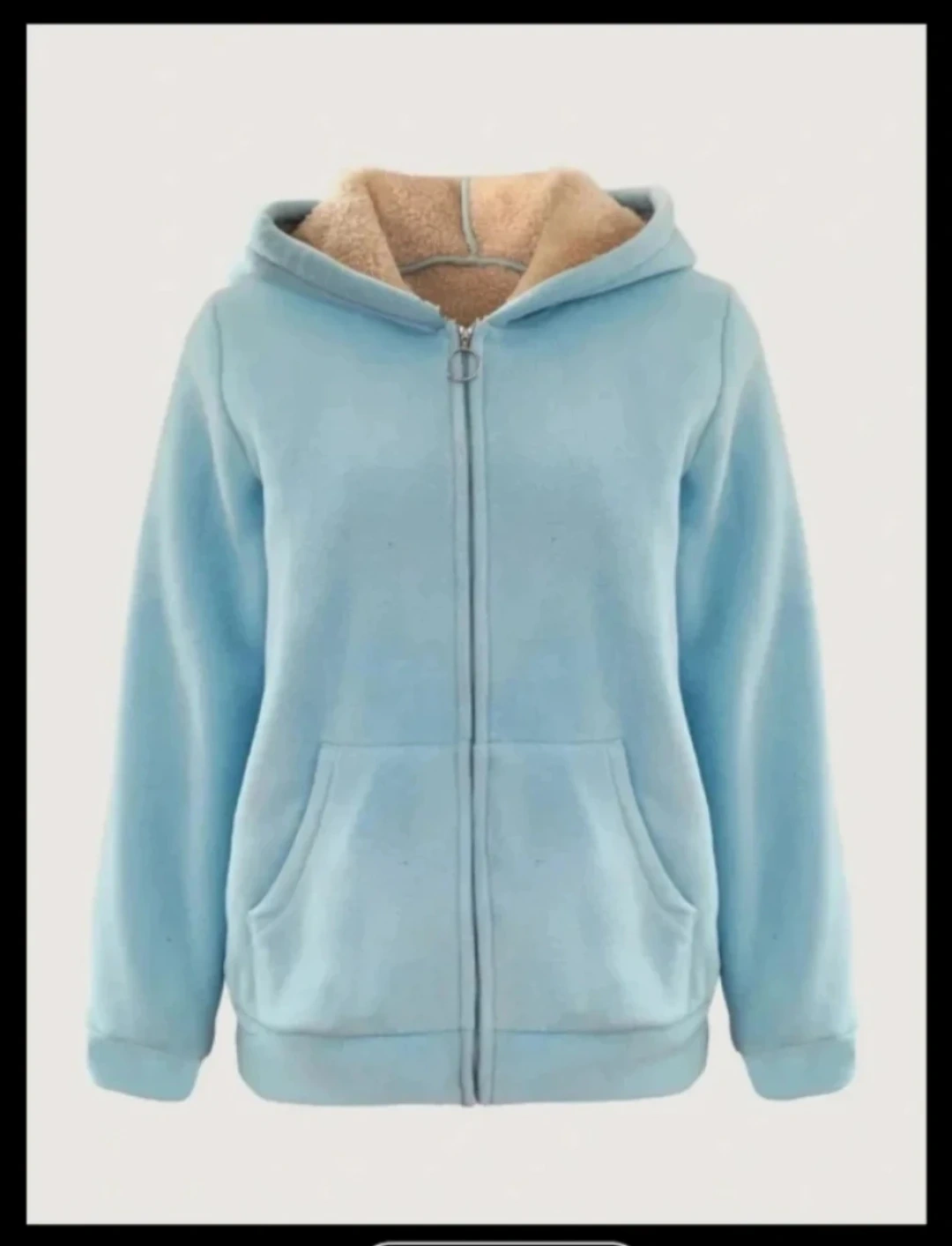 Cozy light blue zip-up winter hoodie with a warm sherpa lining. Features a full zip closure and front pockets. Great for staying warm on chilly days!
