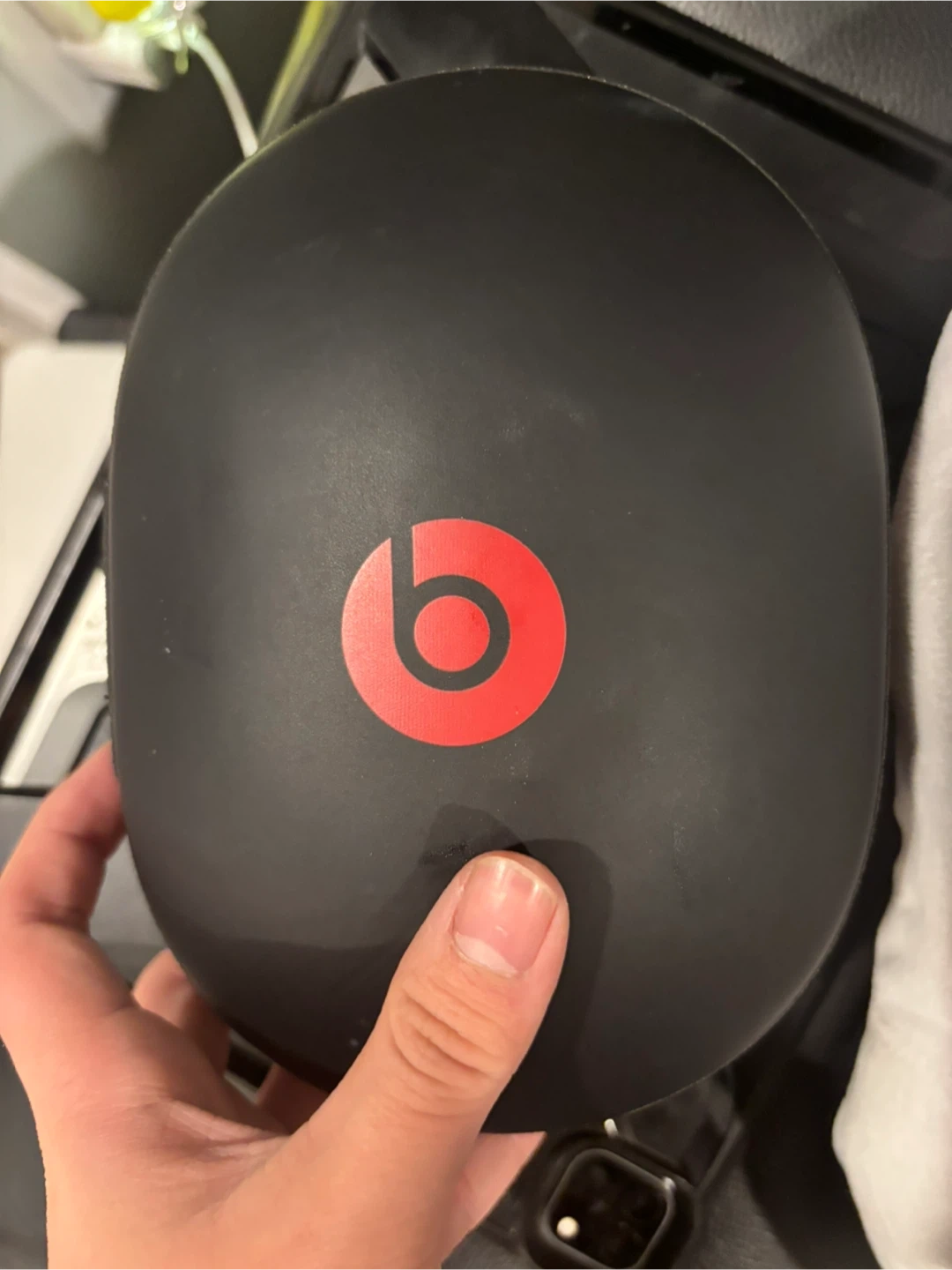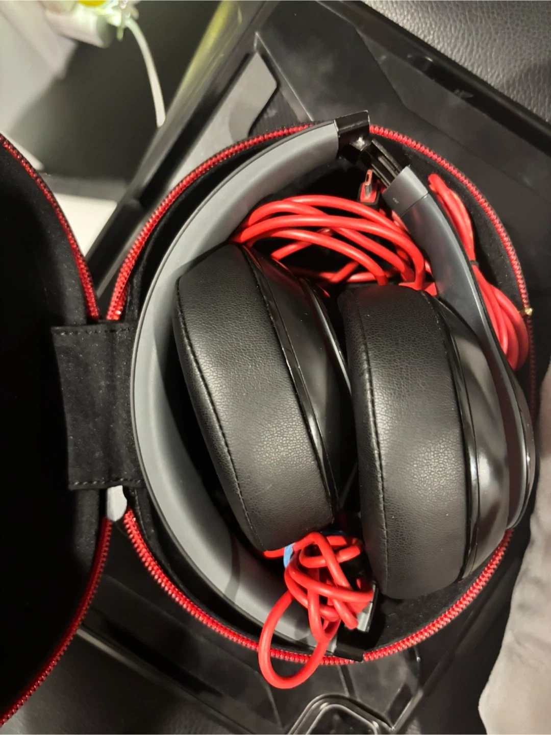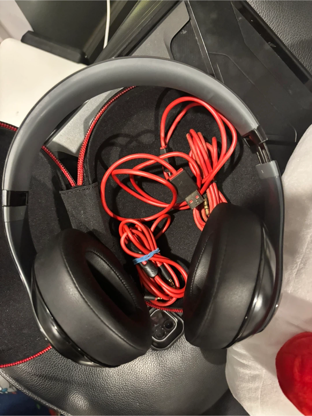 Beats Studio 2 wireless over-ear headphones in black with red accents. They are comfortable and come with a charging cable and carrying case. This pair offers a wireless listening experience.