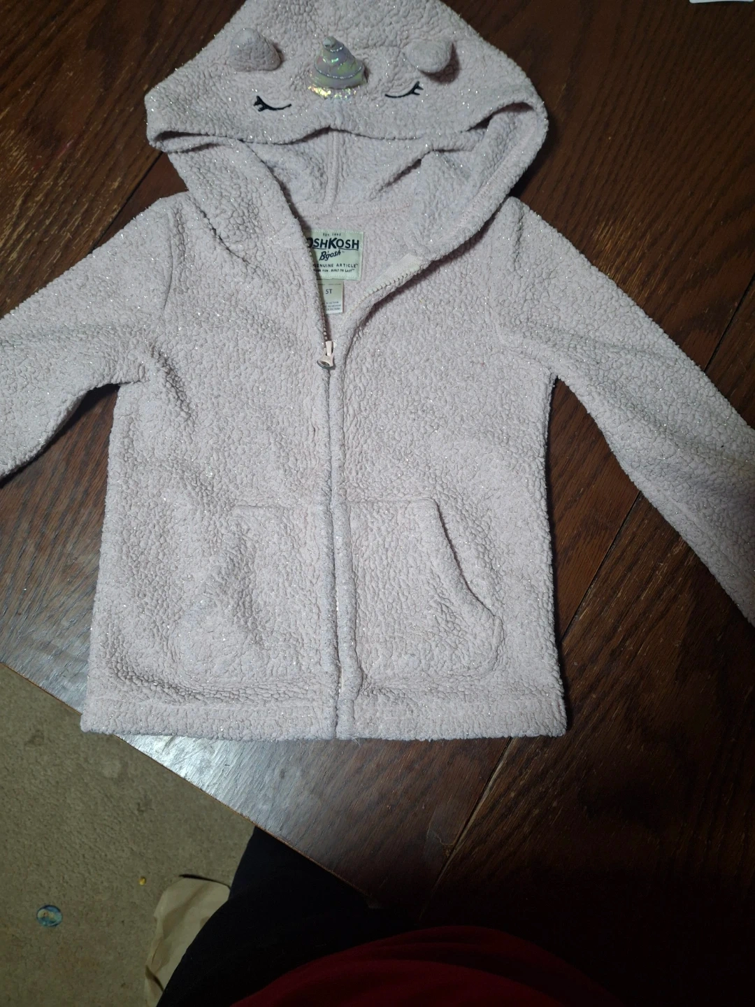 This OshKosh B'gosh hoodie features a sweet pink unicorn design with sparkly details. It's a cozy fleece zip-up with a front pocket. Perfect for cooler weather! Size 5T