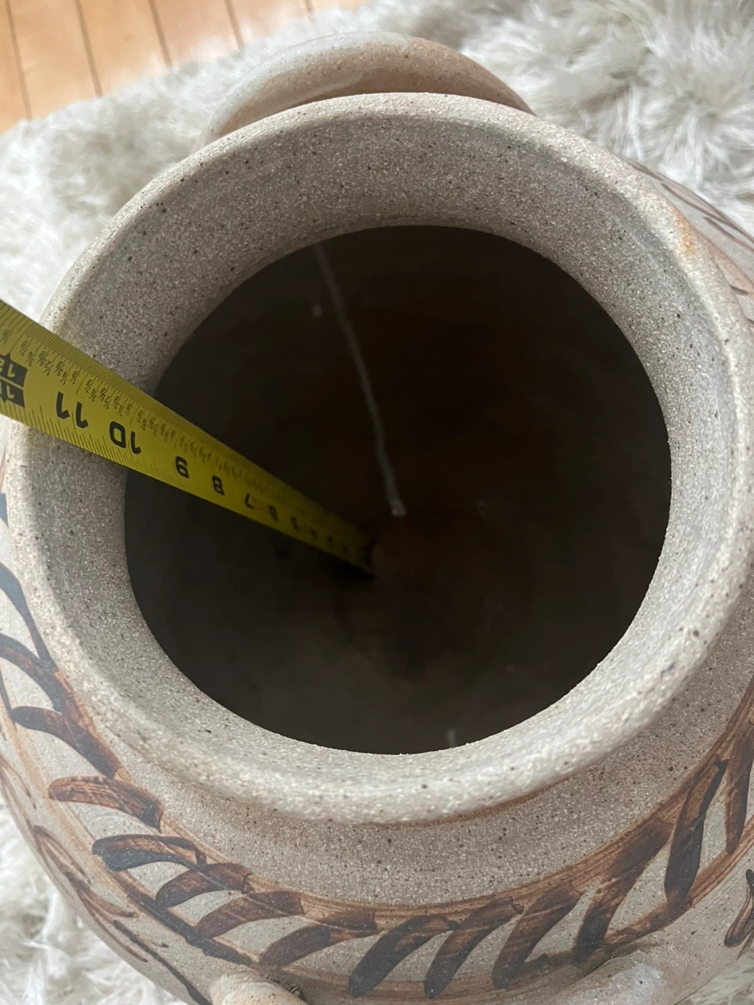 Opening at top is 7 inches and piece is 12 inches. Largest vessel suitable for display or decorative uses.