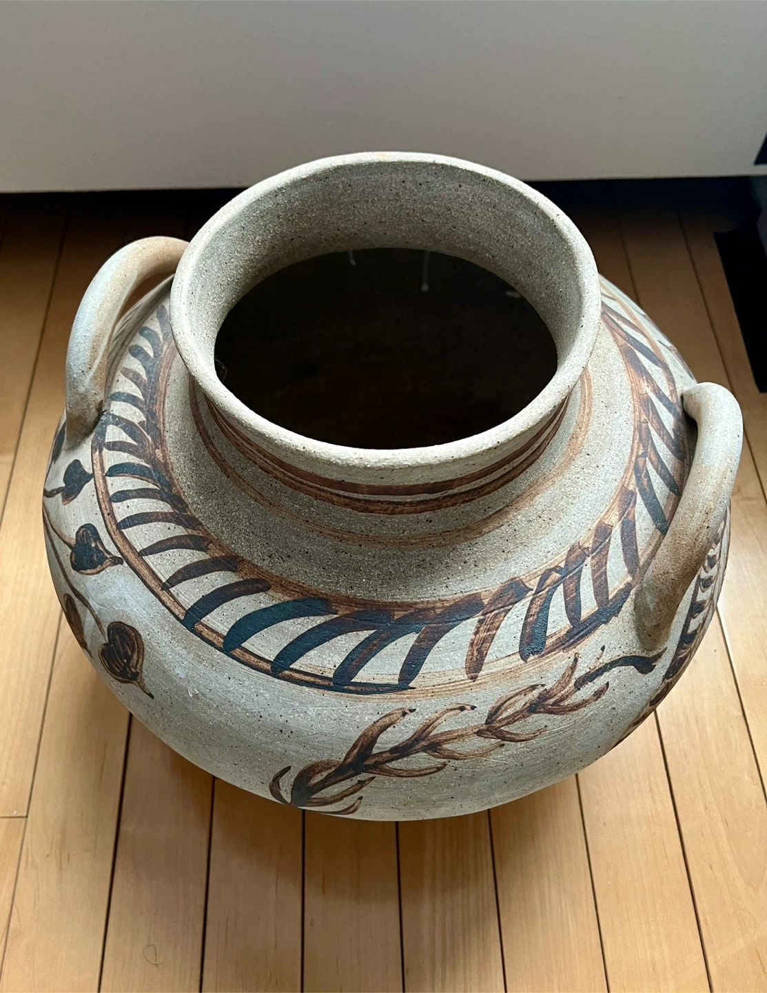 Large hand painted Mexican terracotta vessel with two handles. Typical motifs include earth-toned brushwork, stylized leaves, and unique circular patterns.