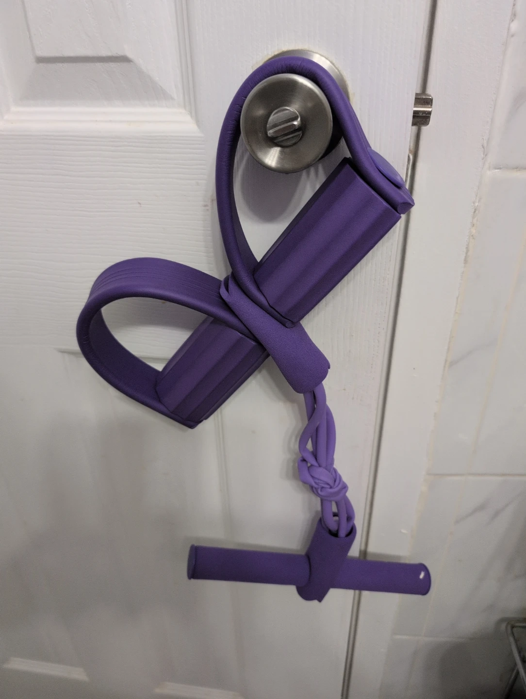 This resistance band is designed for door workouts. It's purple and made of a durable material. The band has padded handles for comfort. It's great for a quick home workout! First person to ask for it will get it.