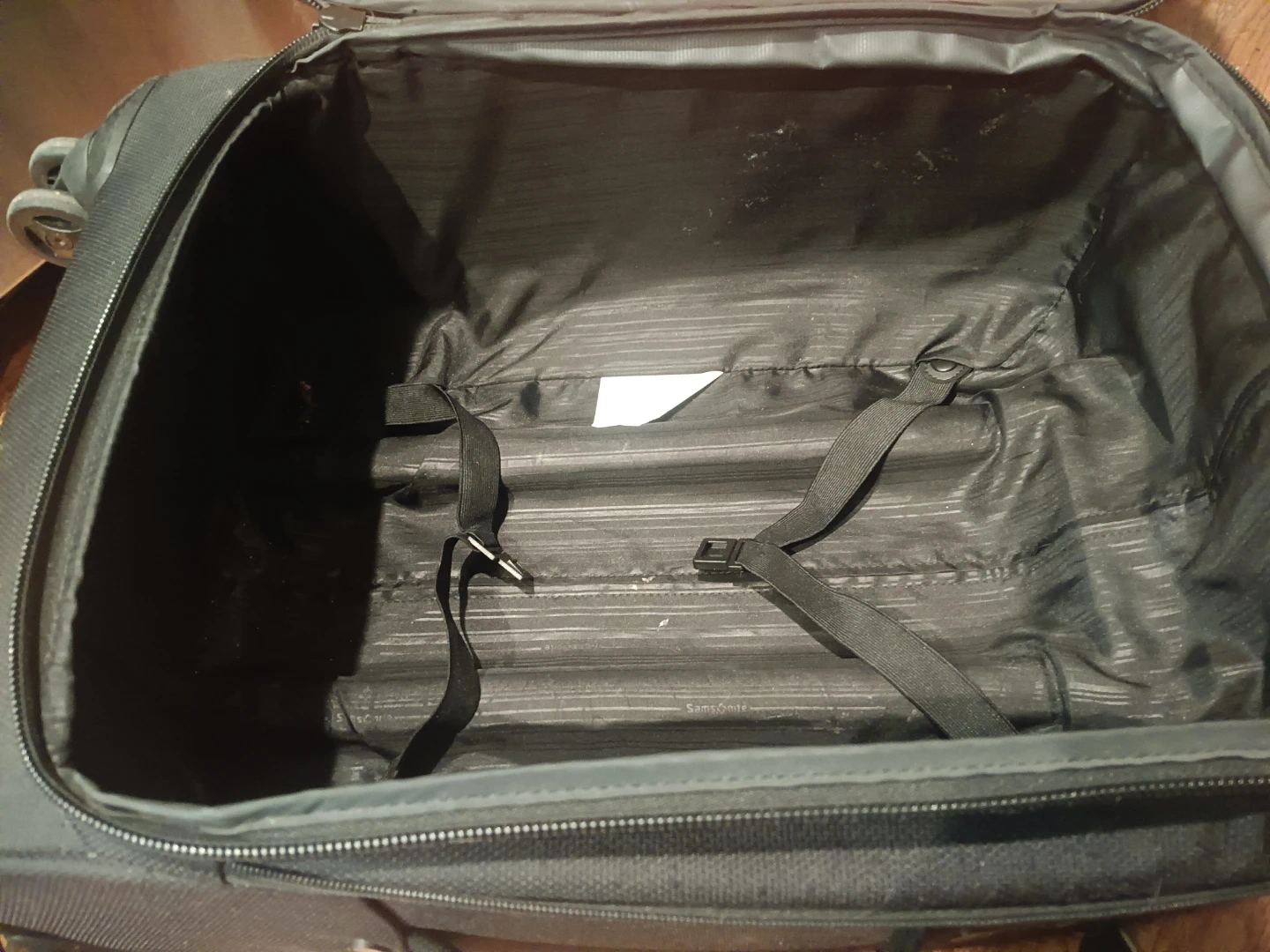 This is a black Samsonite rolling suitcase. It features interior tie-down straps and a zippered mesh pocket inside the lid. The exterior is made of durable fabric and has a retractable handle and wheels for easy transport.