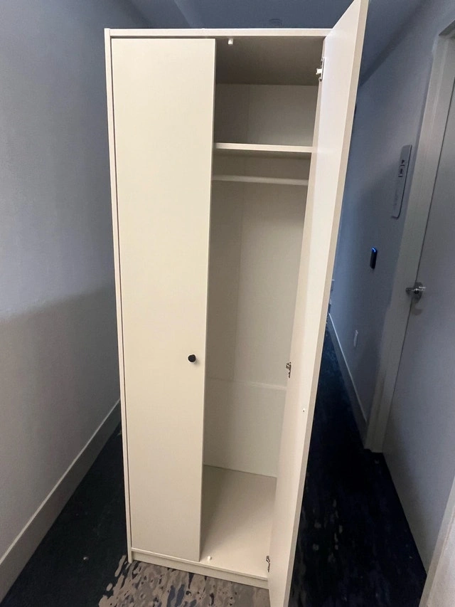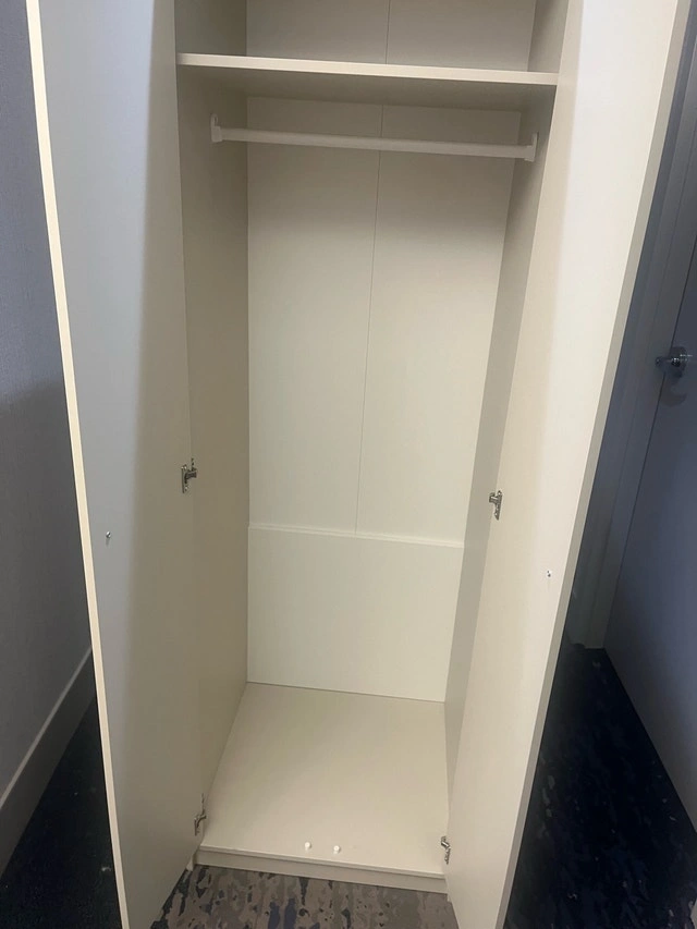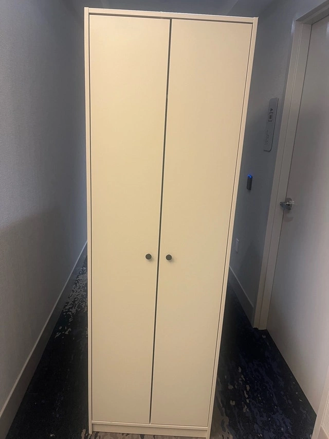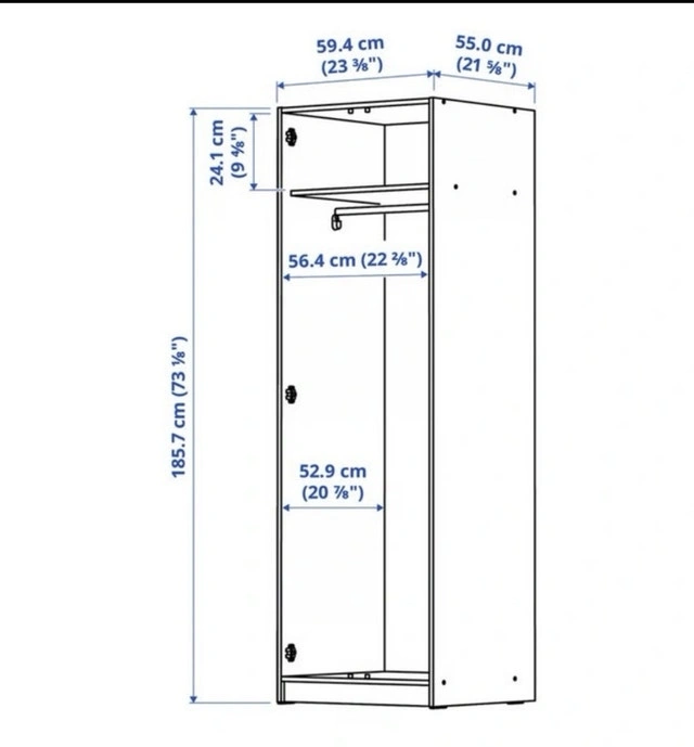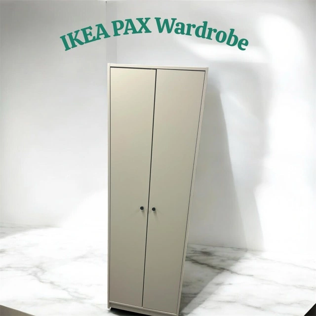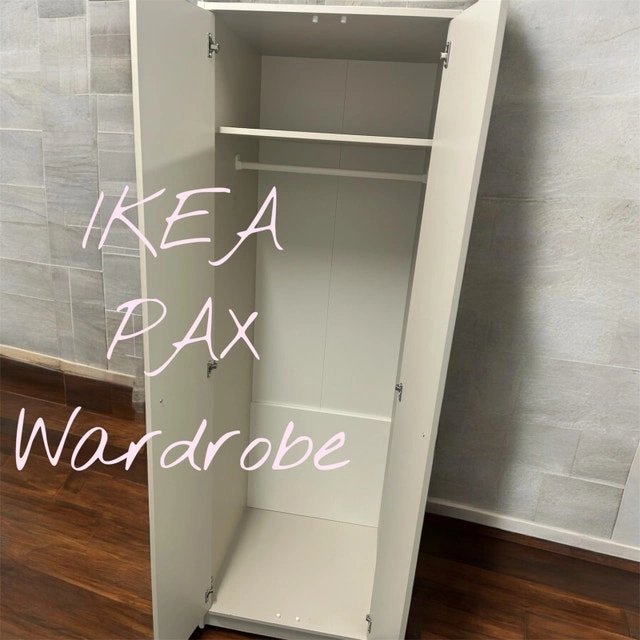 This is an IKEA PAX wardrobe, perfect for adding storage space to any room. It's in used condition, but still has plenty of life left in it! The wardrobe features a clean, minimalist design that fits well with any decor. Inside, you'll find a shelf and a hanging rod to keep your clothes organized.