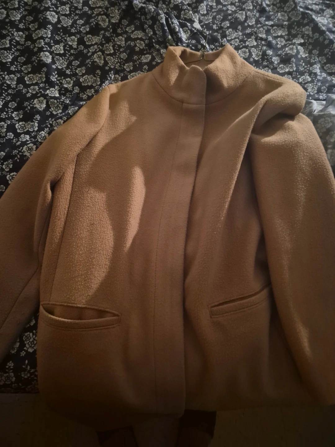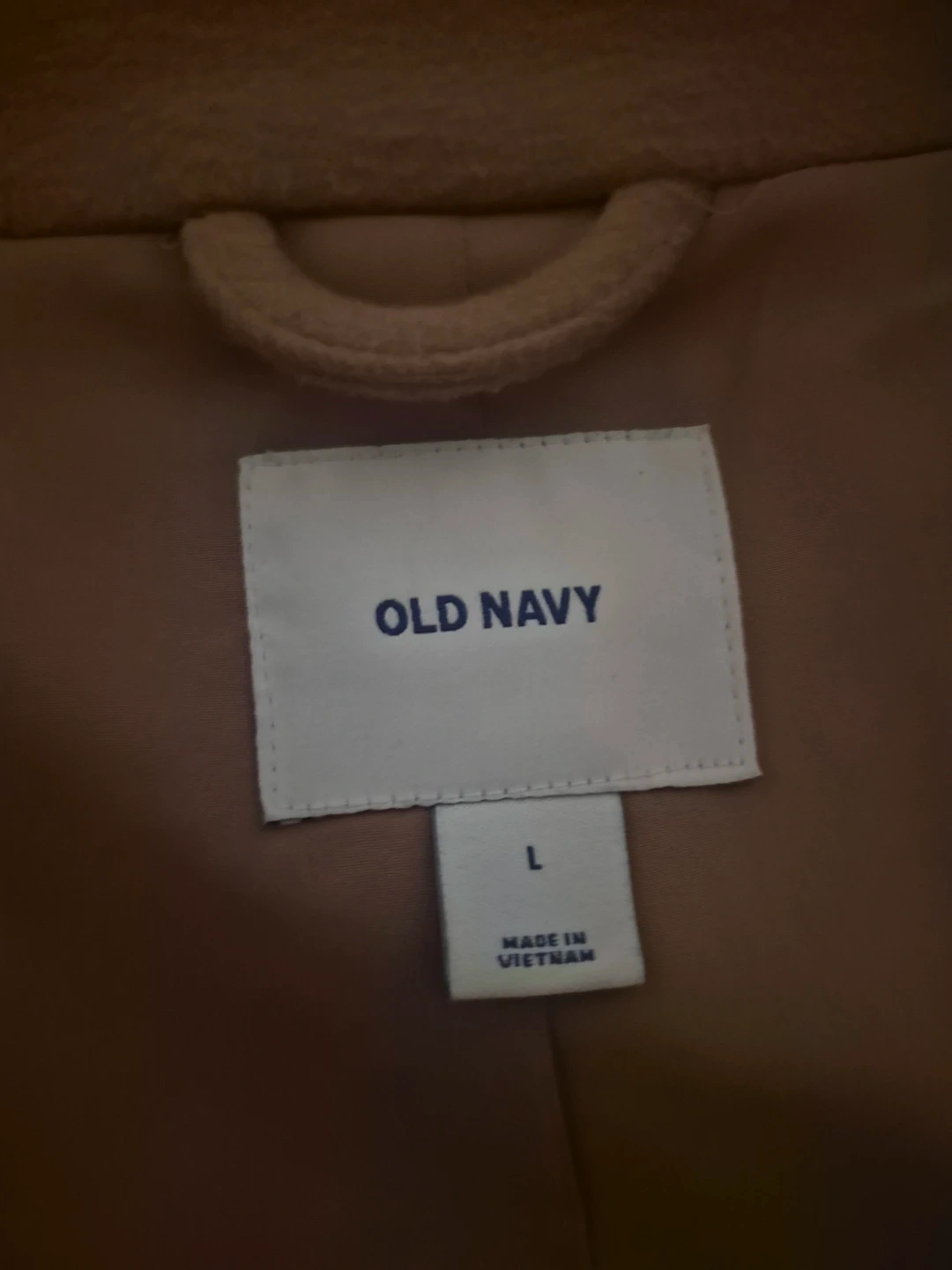 This is an Old Navy tan coat in size Large. It's made from a wool blend. This coat has two front pockets and a full closure. It's perfect for cooler weather!