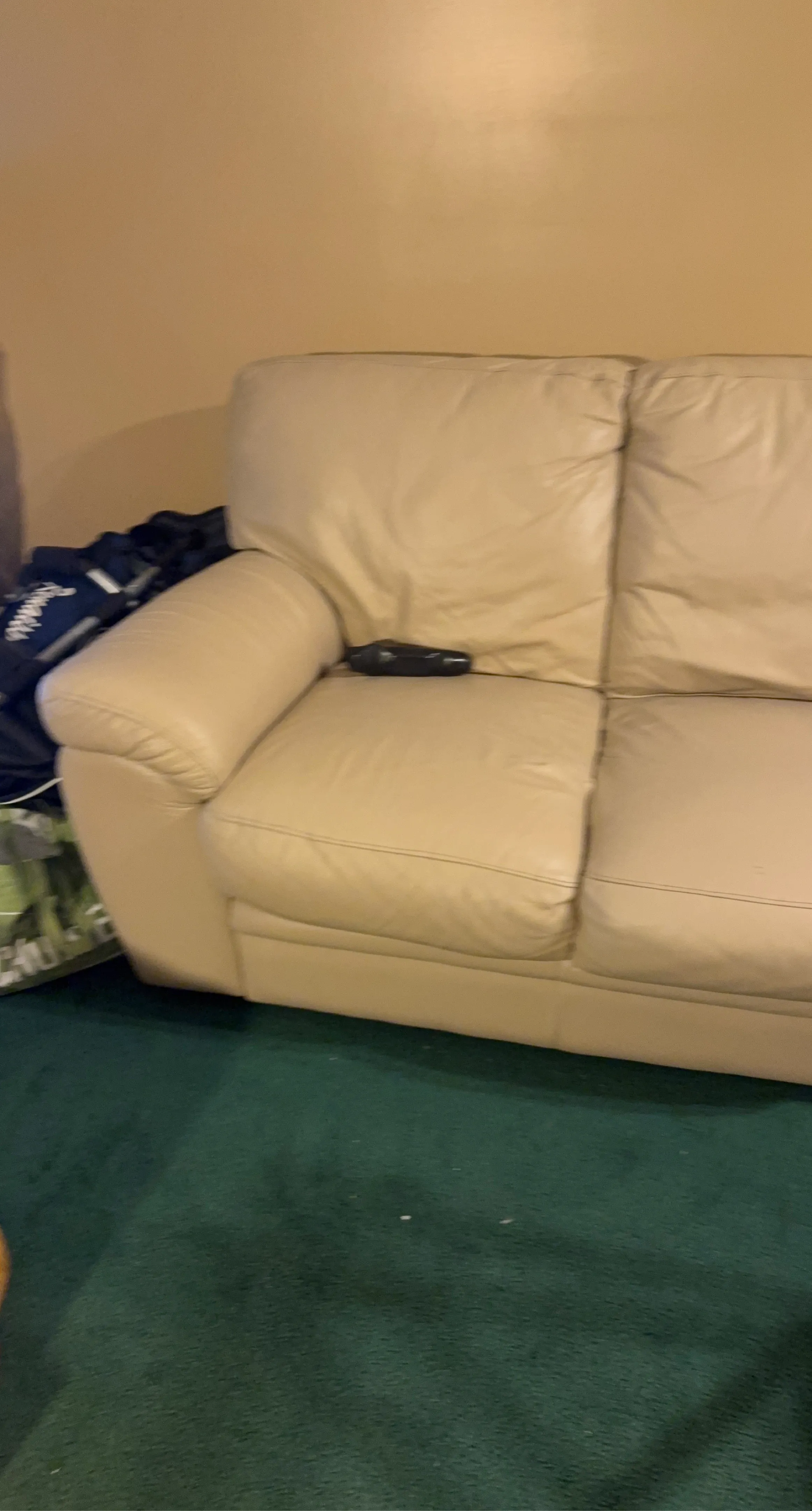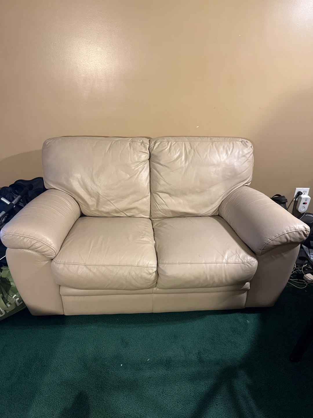 This is a cream-colored leather loveseat sofa. It's a two-seater couch with plush cushions. Its dimensions are approximately 60 inches wide and 35 inches deep. Great for smaller living spaces!