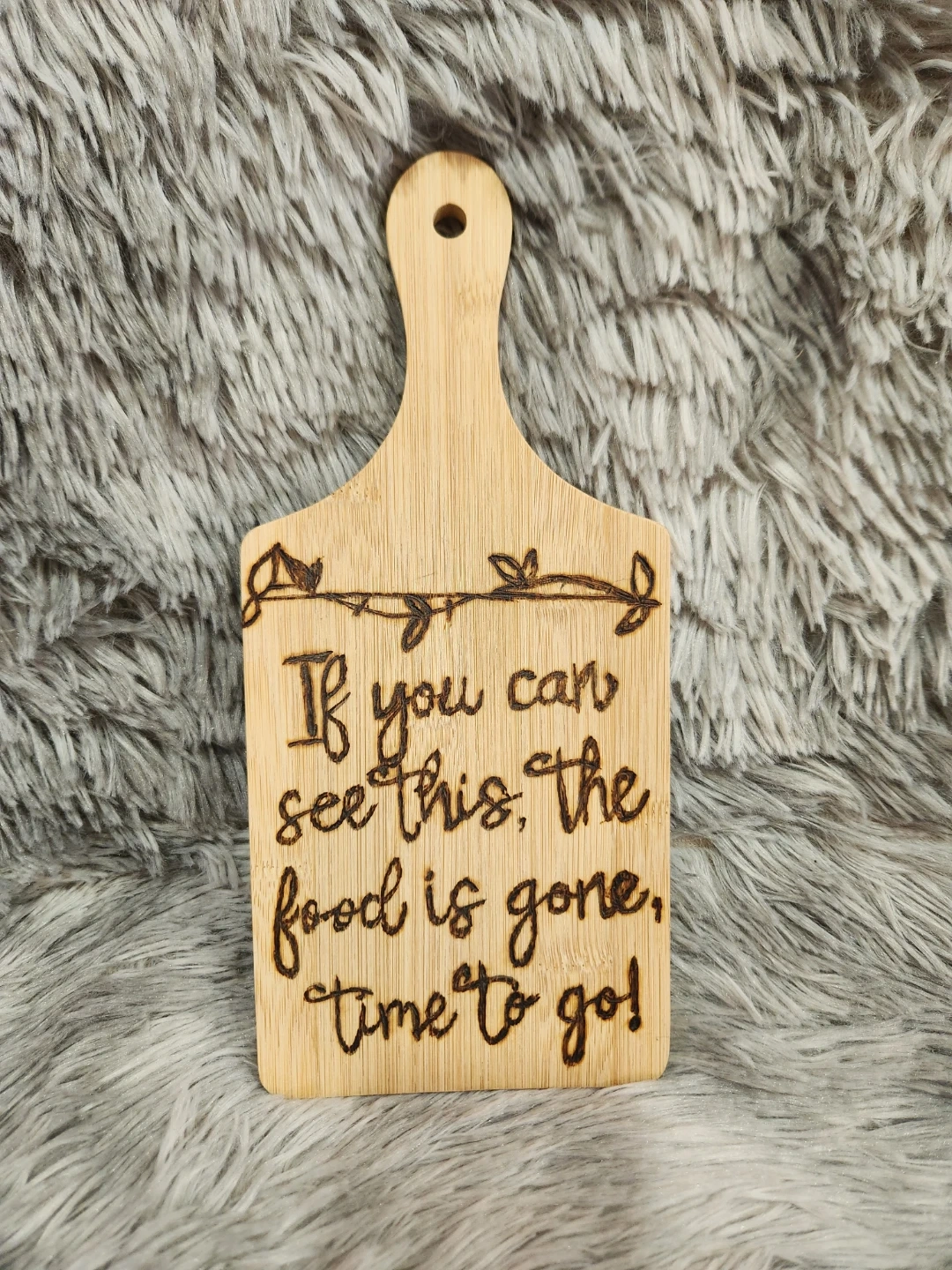 This bamboo cutting board has the funny quote, 'If you can see this, the food is gone, time to go!' It's made of bamboo. This is a great gag gift for a friend who loves to eat!