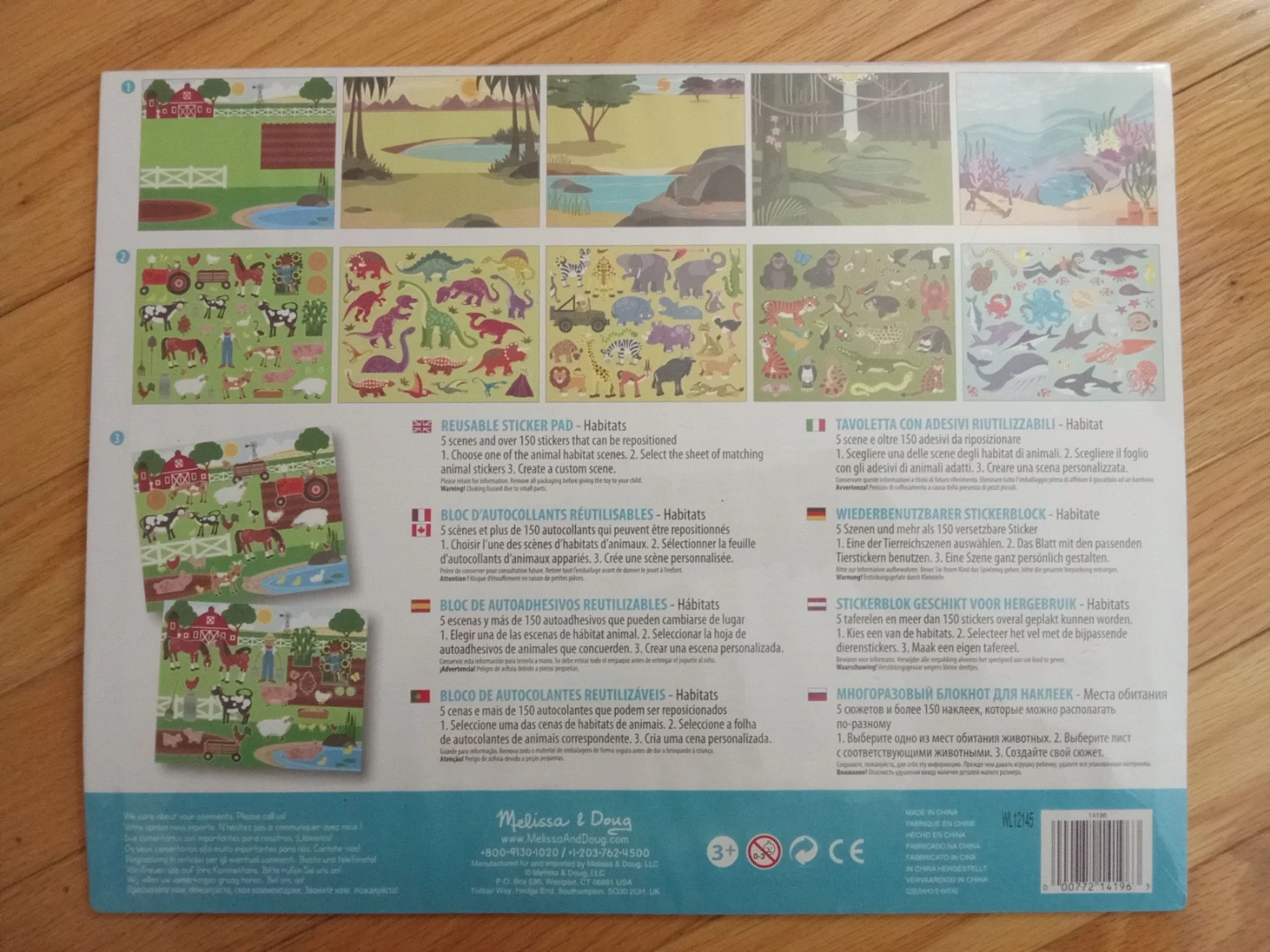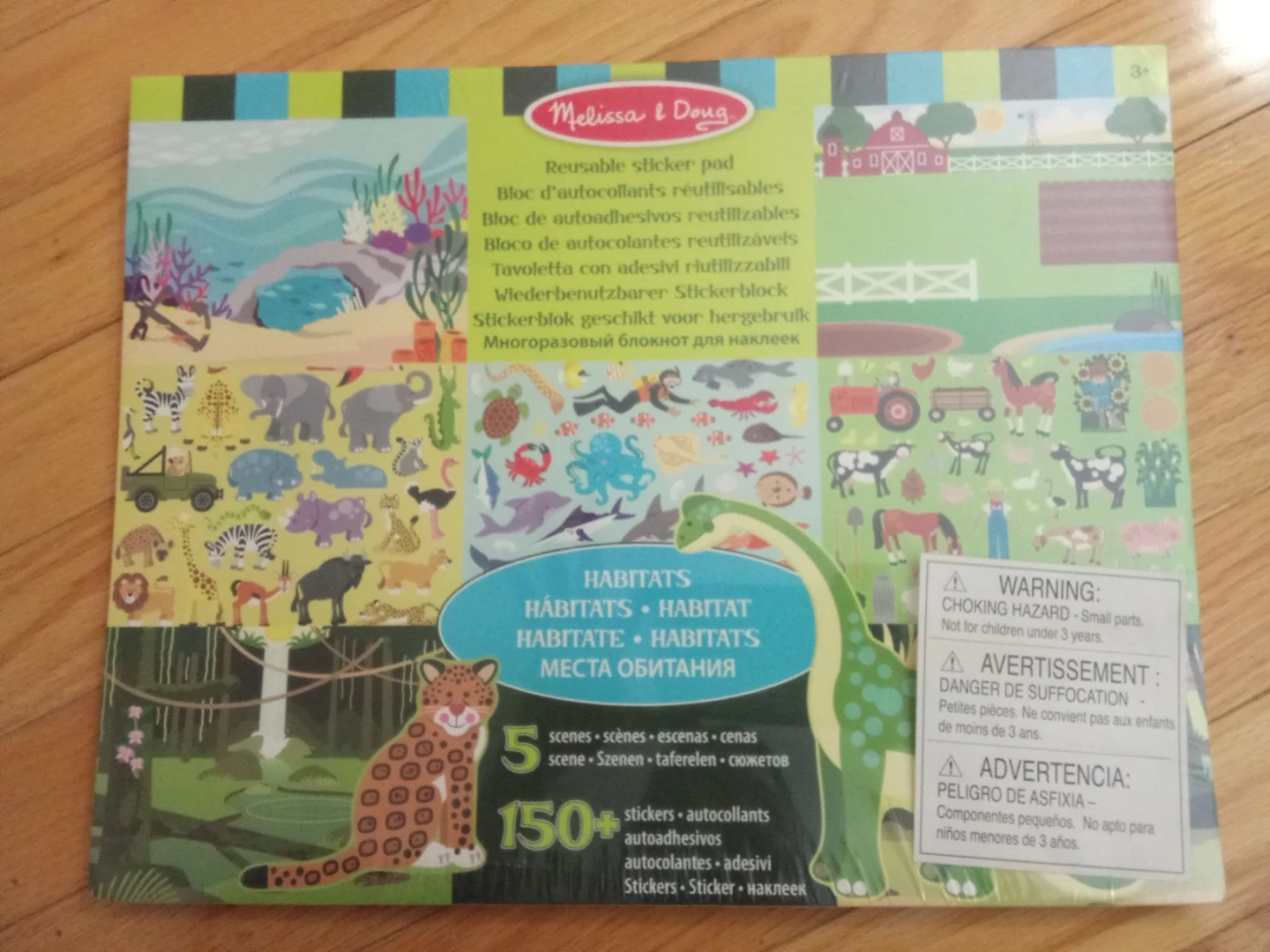 This is a Melissa & Doug reusable sticker pad with 5 scenes and over 150 stickers. The stickers are repositionable and include various animal habitats and farm scenes. It's great for creative play and developing fine motor skills.