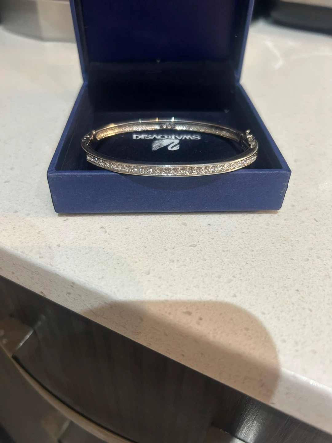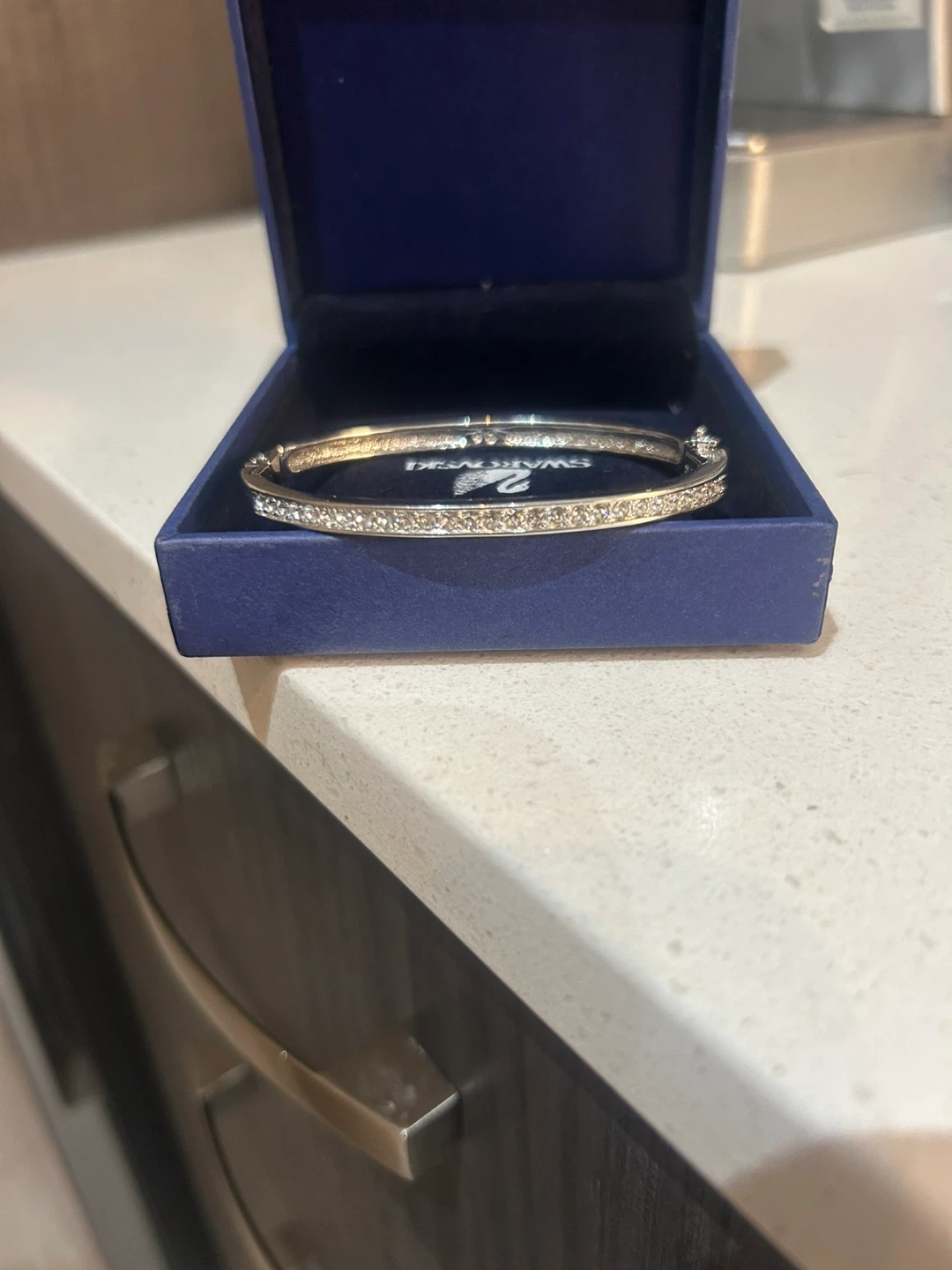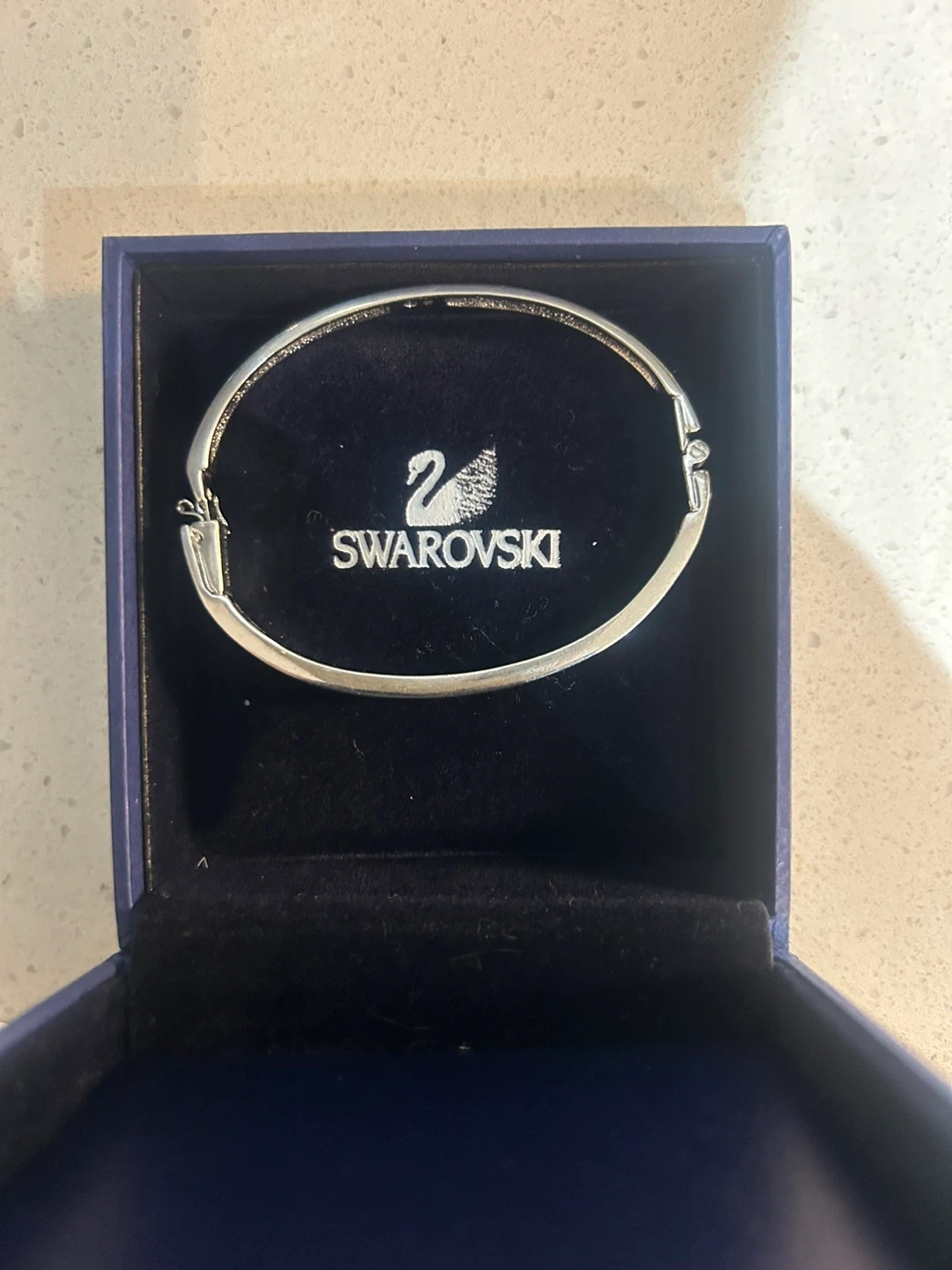 This is a stunning Swarovski bangle bracelet adorned with sparkling crystals. It comes in its original presentation box, ready for gifting or safekeeping. A timeless accessory for any occasion!