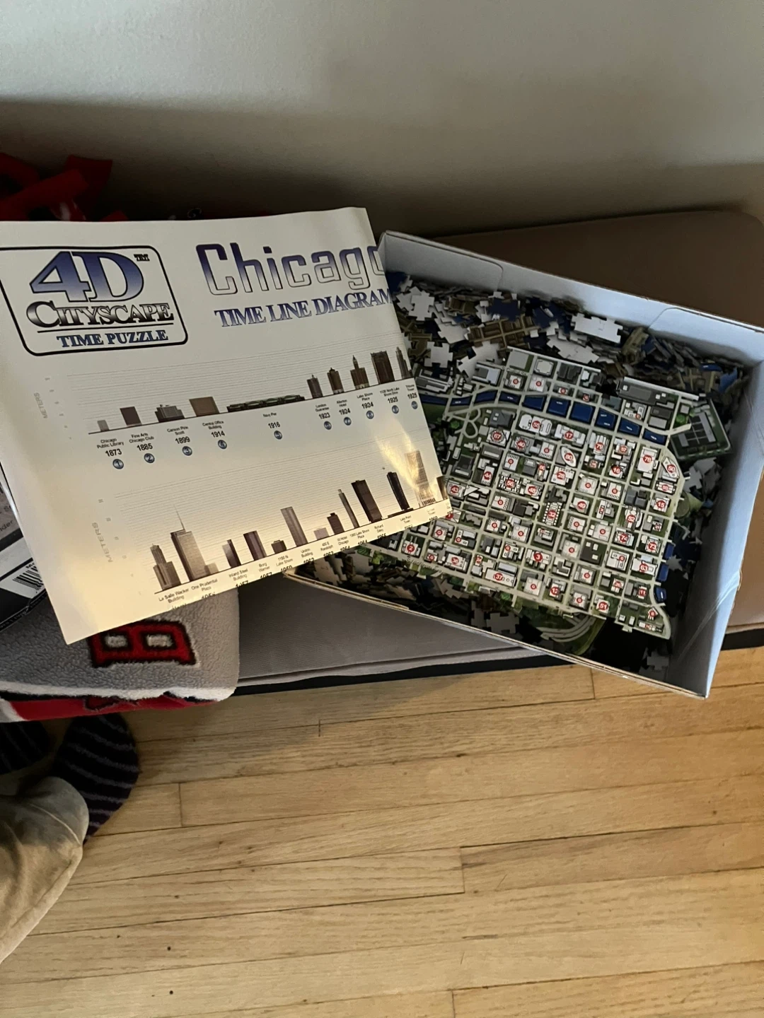 Selling a 4D Cityscape Time Puzzle of Chicago! It has 950+ pieces and is recommended for ages 8+. This puzzle allows you to build the city of Chicago over time. It includes a history over time poster and has 3 layers to assemble. All pieces are there!