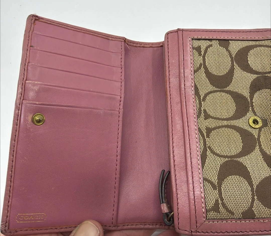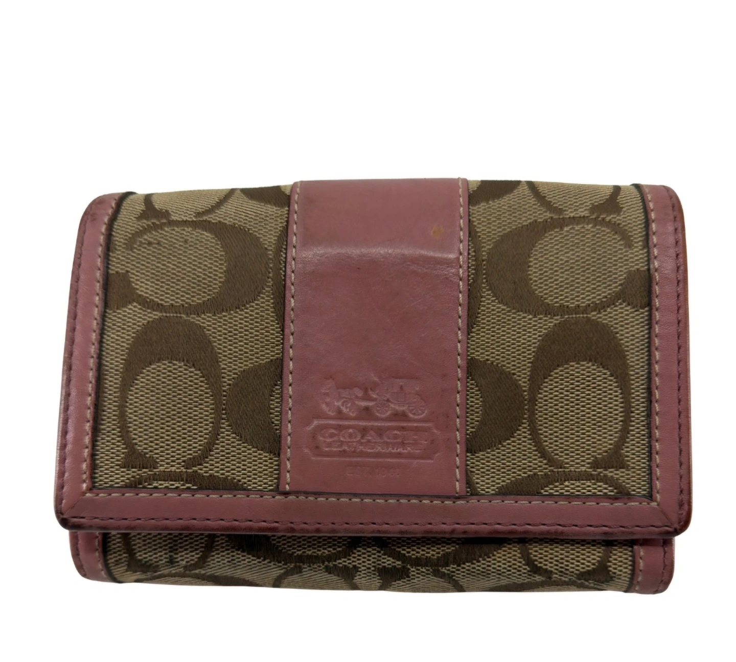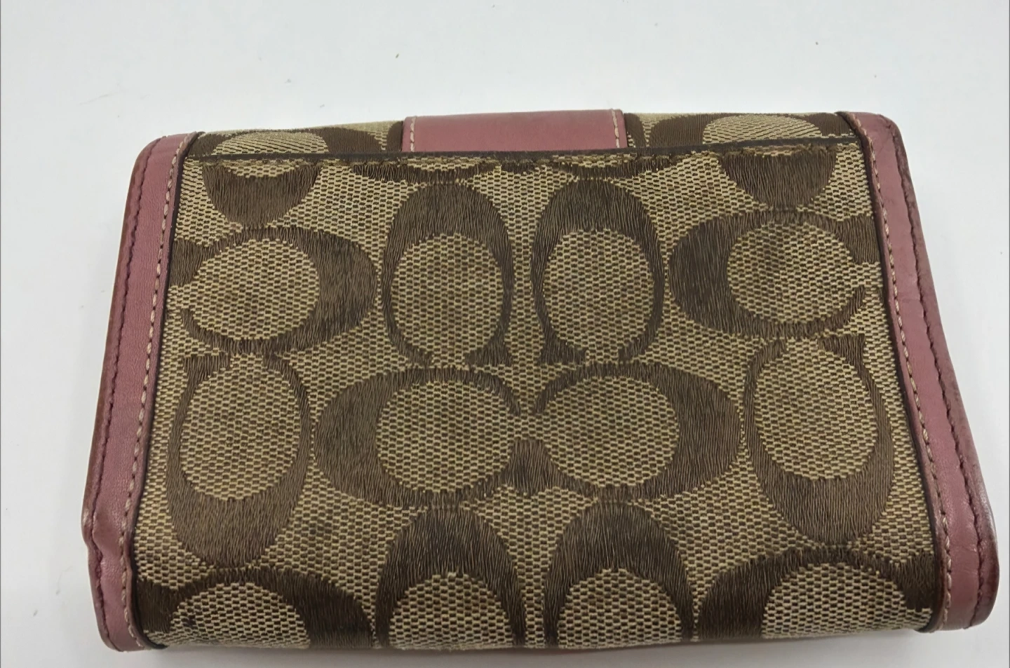This Coach wallet features the signature C monogram canvas with pink leather accents. It's a trifold design with multiple card slots inside. It has a snap closure to keep your essentials secure.